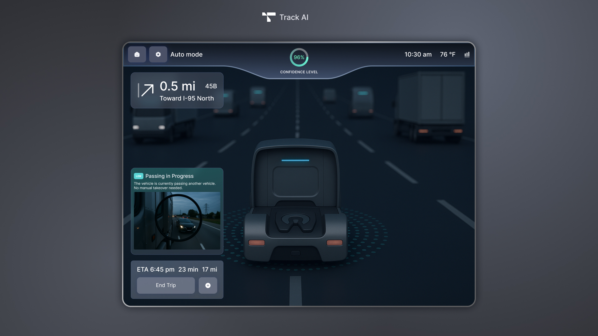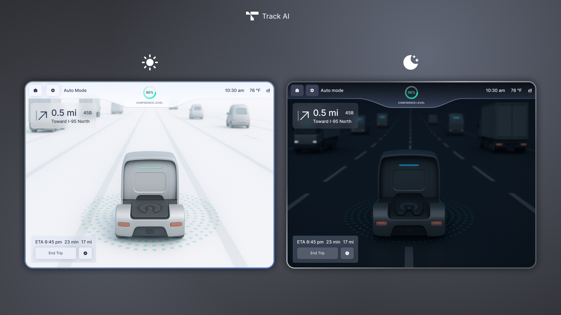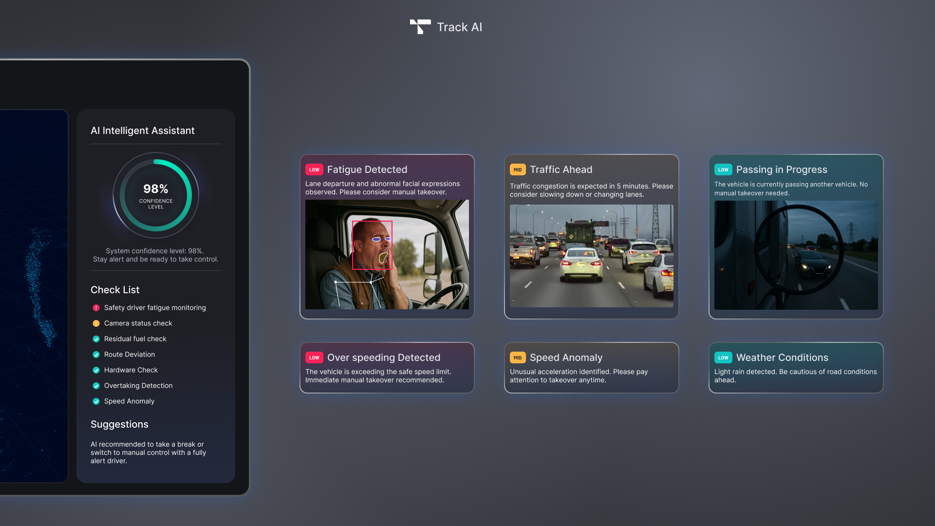 Track AI is an intelligent dual-end system that bridges real-time communication between truck drivers and backend analysts. It continuously monitors driver behavior, vehicle status, and road conditions to detect risks early and provide timely, data-driven interventions. With dynamic confidence scoring and visual alerts, it enhances decision-making, prevents accidents, and supports performance reviews after each trip — creating a safer, more efficient logistics ecosystem. With over 70% of goods in the U.S. transported by truck, the logistics industry faces urgent challenges: a shortage of skilled drivers, rising fatigue-related incidents, and delayed backend responses. In 2023 alone, over 5,000 large truck crashes were reported. Track AI addresses this by introducing an AI-powered dual-end system. Through continuous sensing and confidence scoring, it empowers human-AI collaboration — improving decision-making, reducing blind spots, and advancing the future of autonomous freight safety. Track AI uses a modular interface tailored to three user groups: a simplified, alert-driven display for drivers, and a dashboard for test ops and data analysts. Bold contrast, visual confidence meters, and motion indicators deliver intuitive feedback, even under stressful conditions. Subtle animation and hierarchy create a sense of control and clarity — generating a “this is working” emotional response. Every form element directly supports real-time comprehension and action. For drivers, it delivers context-aware guidance; for test ops and data analyst teams, it enables real-time tracking, risk alerts, and post-trip diagnostics. Drivers receive only what matters most in real time, while analysts benefit from structured, prioritized data for fast decision-making. Confidence scoring simplifies complex inputs into a single actionable metric. The system’s task tagging, timeline review, and escalation flow optimize post-trip analysis. Every interaction supports fast, informed action — ensuring safety, clarity, and operational efficiency.