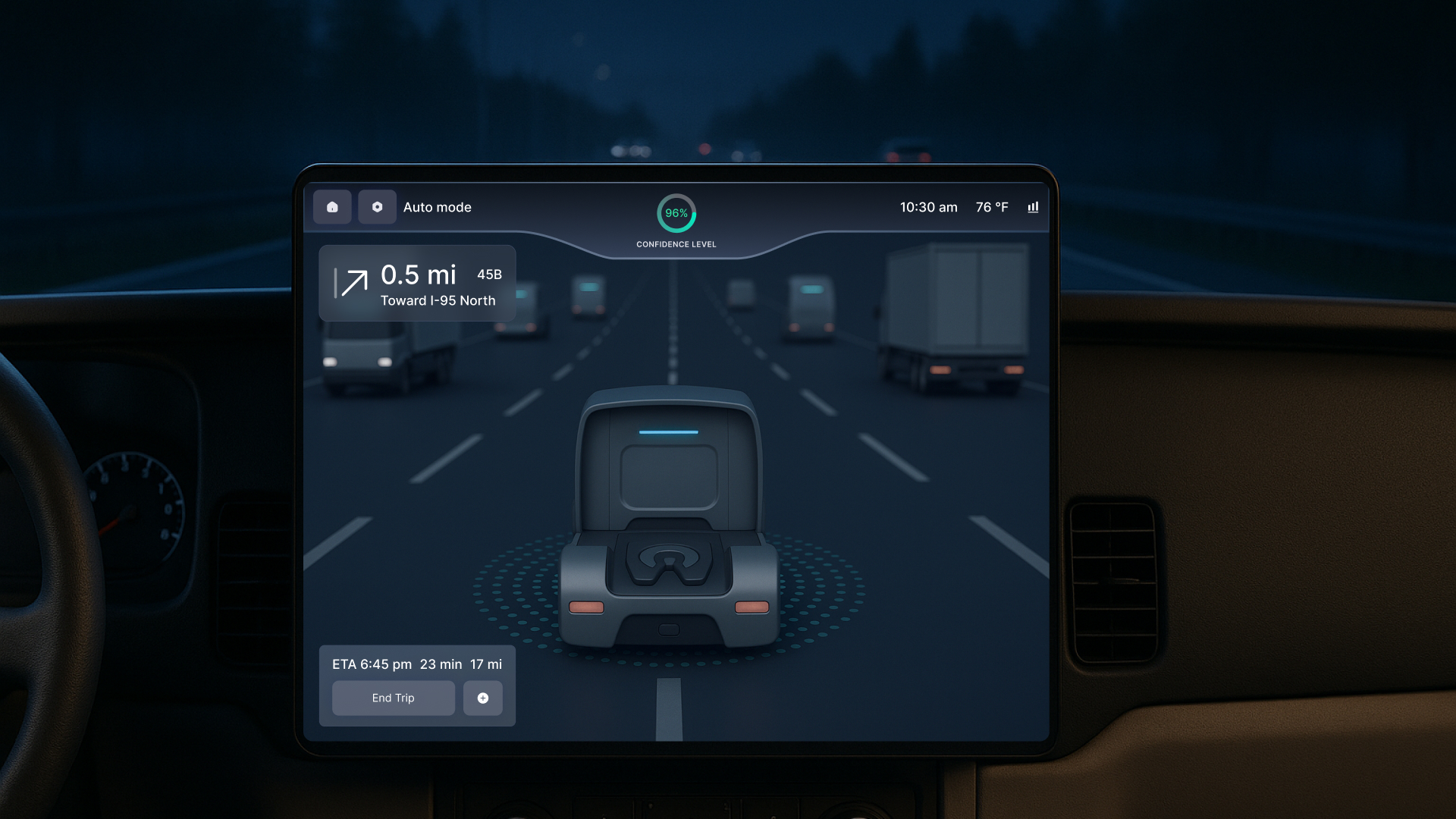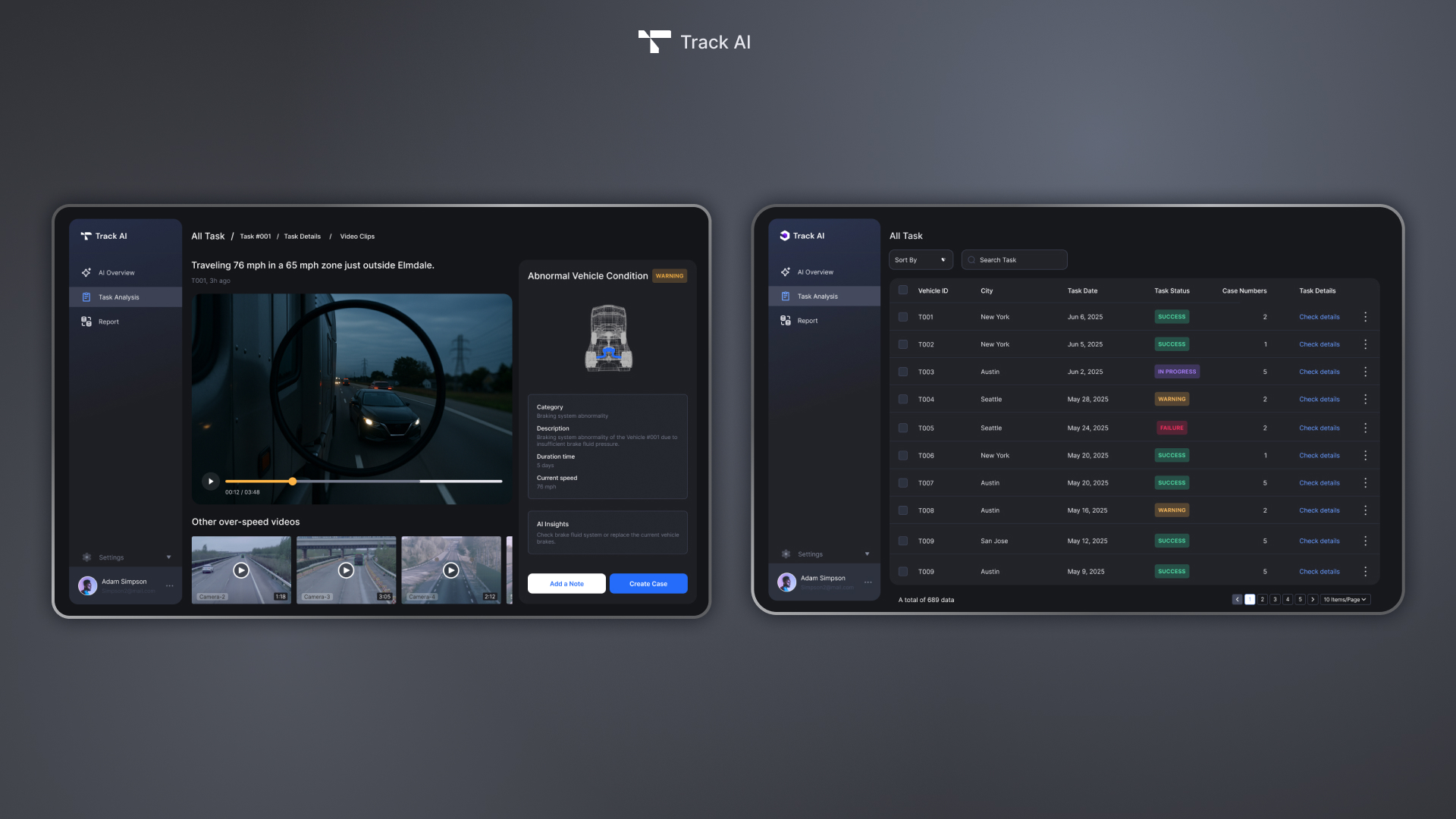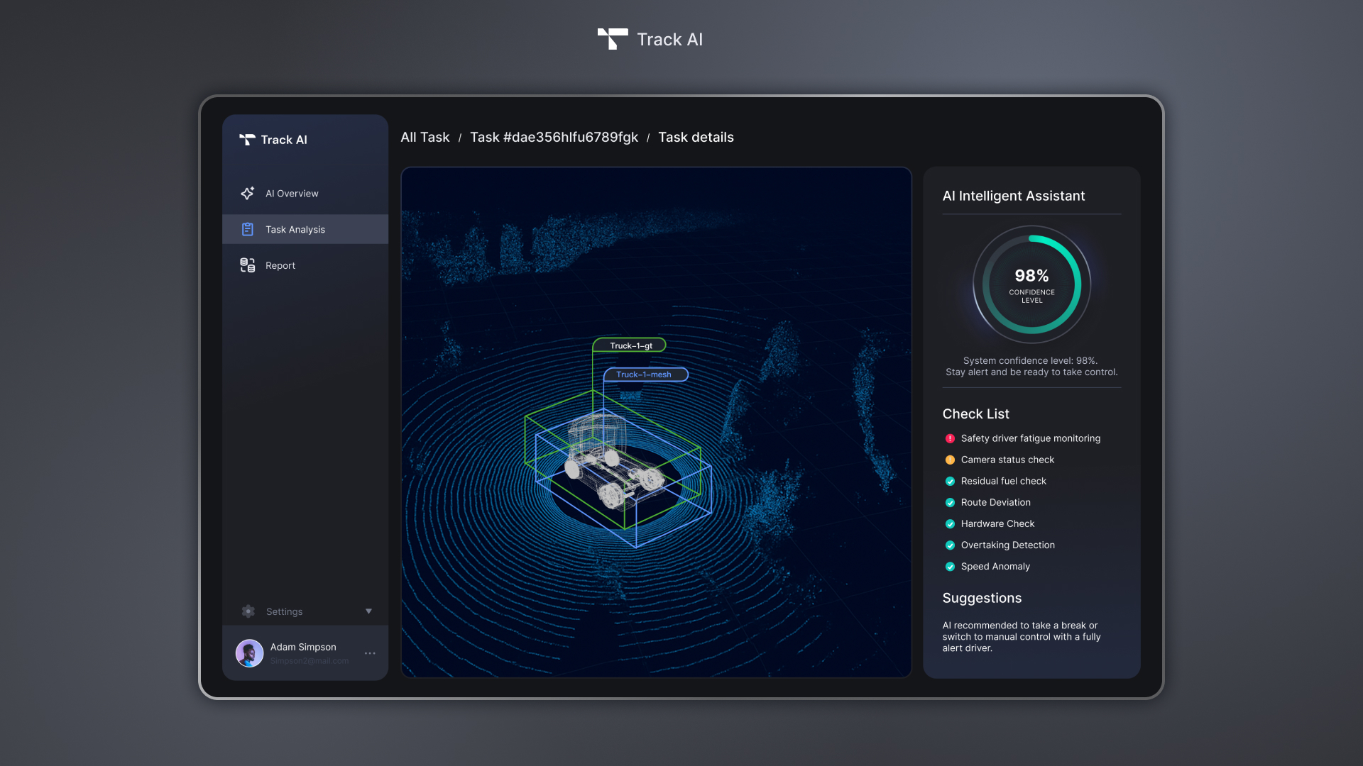Track AI is an intelligent dual-end system that bridges real-time communication between truck drivers and backend analysts. It continuously monitors driver behavior, vehicle status, and road conditions to detect risks early and provide timely, data-driven interventions. With dynamic confidence scoring and visual alerts, it enhances decision-making, prevents accidents, and supports performance reviews after each trip — creating a safer, more efficient logistics ecosystem. With over 70% of goods in the U.S. transported by truck, the logistics industry faces urgent challenges: a shortage of skilled drivers, rising fatigue-related incidents, and delayed backend responses. In 2023 alone, over 5,000 large truck crashes were reported. Track AI addresses this by introducing an AI-powered dual-end system. Through continuous sensing and confidence scoring, it empowers human-AI collaboration — improving decision-making, reducing blind spots, and advancing the future of autonomous freight safety. Track AI uses a modular interface tailored to three user groups: a simplified, alert-driven display for drivers, and a dashboard for test ops and data analysts. Bold contrast, visual confidence meters, and motion indicators deliver intuitive feedback, even under stressful conditions. Subtle animation and hierarchy create a sense of control and clarity — generating a “this is working” emotional response. Every form element directly supports real-time comprehension and action. For drivers, it delivers context-aware guidance; for test ops and data analyst teams, it enables real-time tracking, risk alerts, and post-trip diagnostics. Drivers receive only what matters most in real time, while analysts benefit from structured, prioritized data for fast decision-making. Confidence scoring simplifies complex inputs into a single actionable metric. The system’s task tagging, timeline review, and escalation flow optimize post-trip analysis. Every interaction supports fast, informed action — ensuring safety, clarity, and operational efficiency.