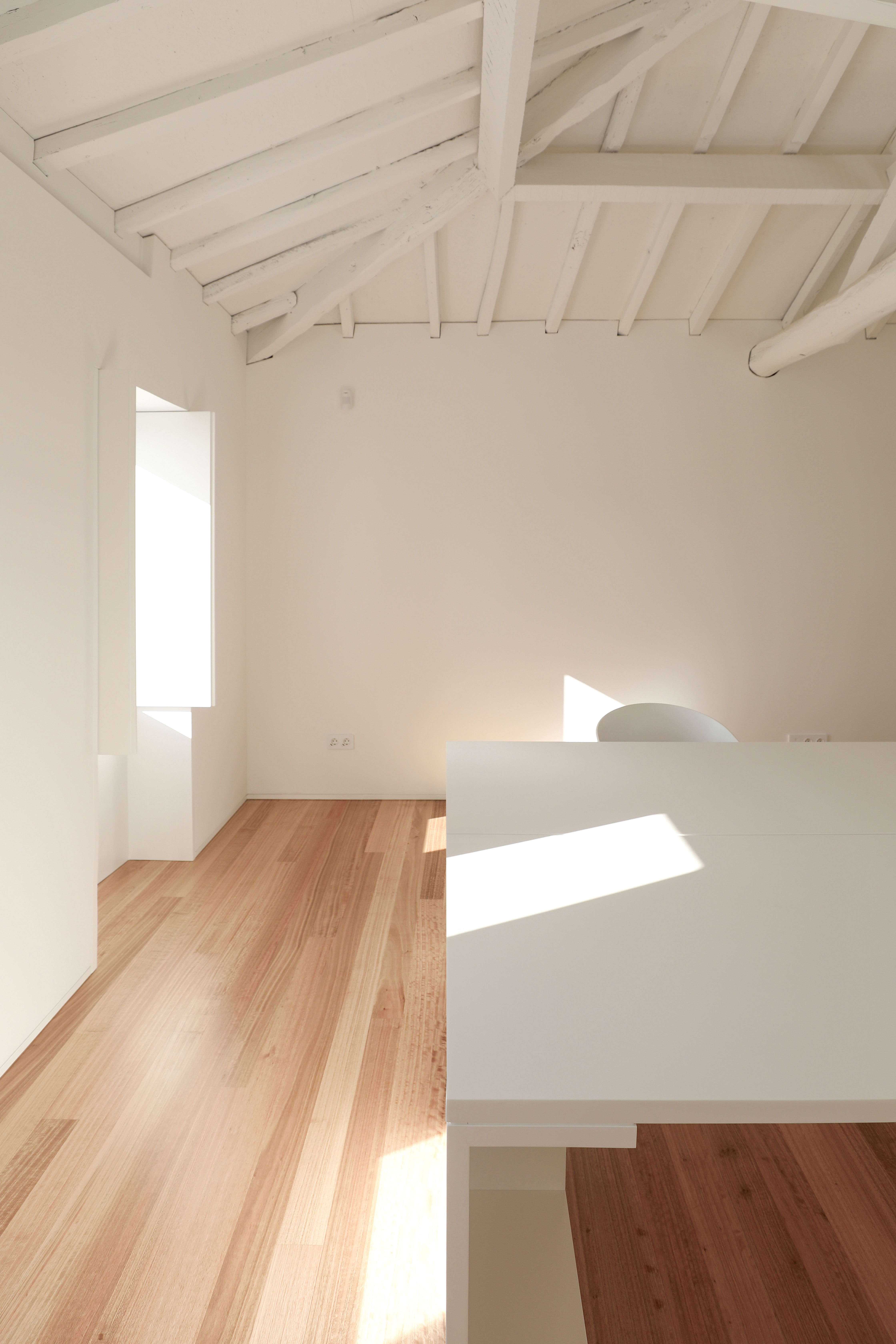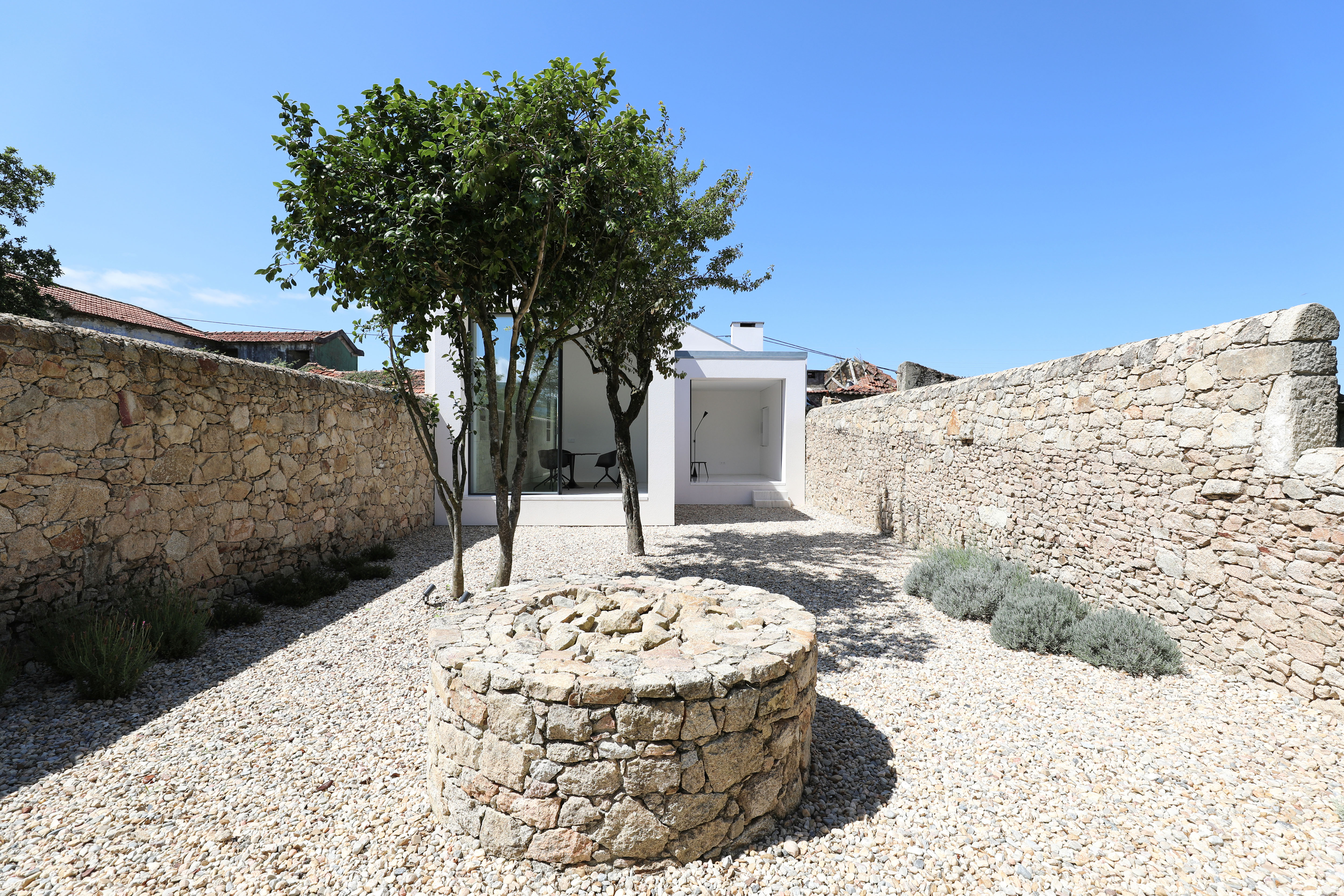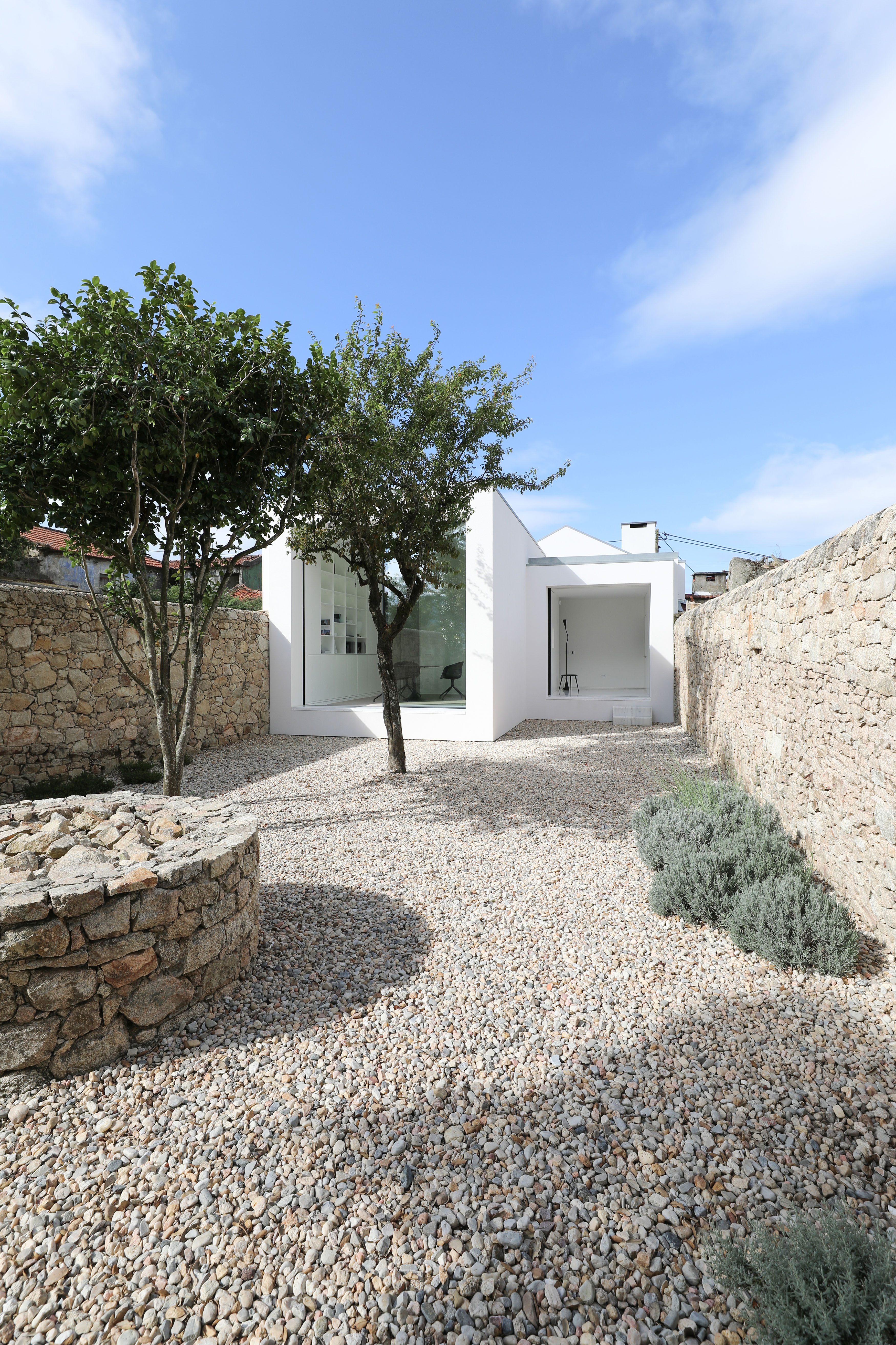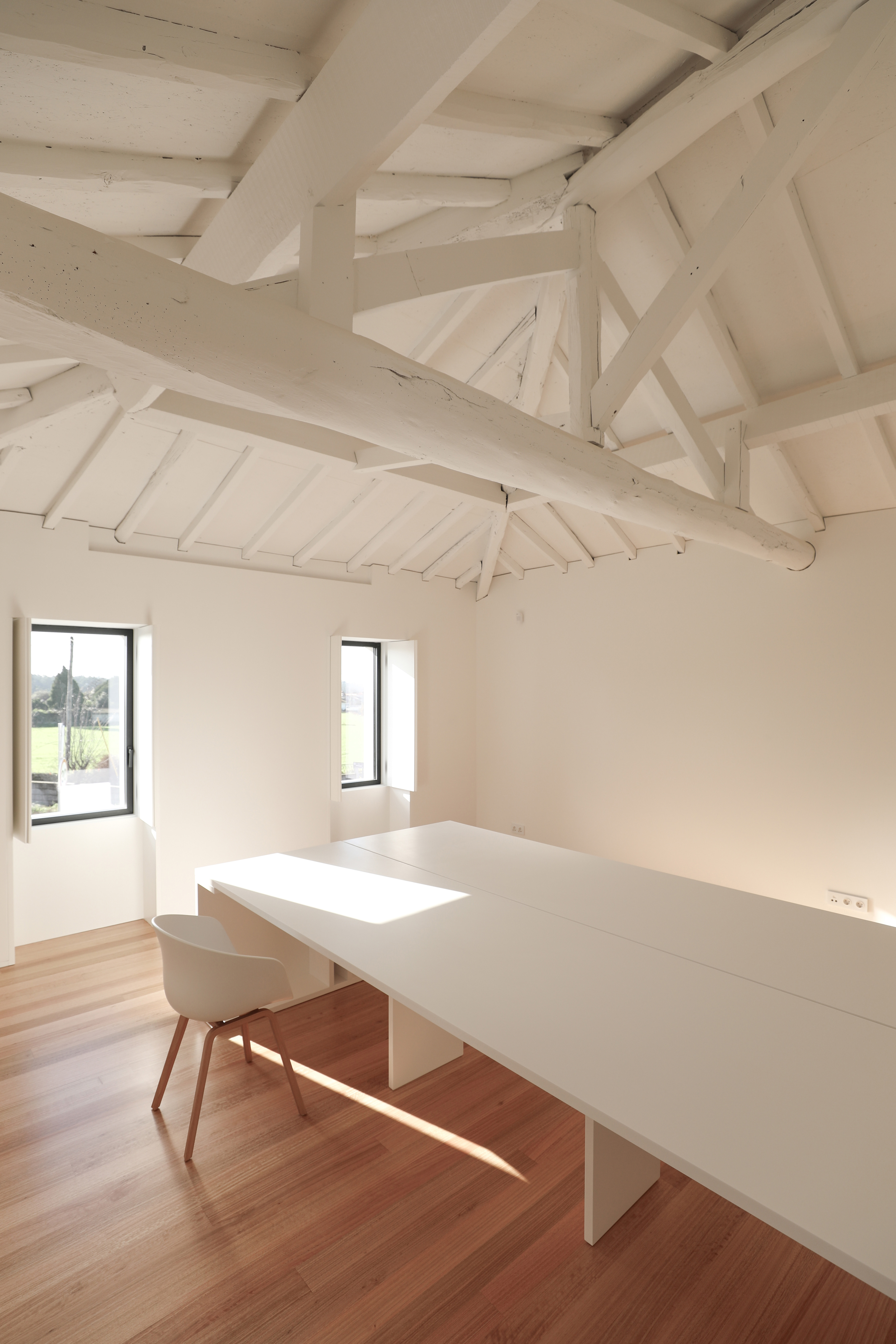 The small house dated 1936 was built by my grandparents, in the place of Santagões, in a very rural area of Vila do Conde, where I am from. The architecture studio operated for ten years in the original house, practically as my grandmother had left it after her departure. The very rocky site only made it possible to extend the upper floor towards the back, which is leveled with the garden. On the lower floor, at the street level, the garage and the new technical area were placed. On the upper floor, an atrium was designed next to an existing oven that connects the old house to the new construction, and defines the entrance to the studio. The atrium allows access to the two bathrooms, the tall room used for meetings and the smaller room used as a break room, both of which open onto the garden, where the original well, the granite stone walls and trees were kept. In the existing construction, the wooden structure of the roof was preserved and was left exposed to make it possible to increase the height of the spaces. In the old kitchen area, the oven, the open wood fire chimney, the granite stone walls and the exposed wooden partition remained. In the main room, with wooden floor, there are two large work tables and the smaller windows with shutters that allow you to control natural lighting. Only this space functions as the second floor, the other spaces are the ground floor, at garden level, and in those the floors are made of white marble.