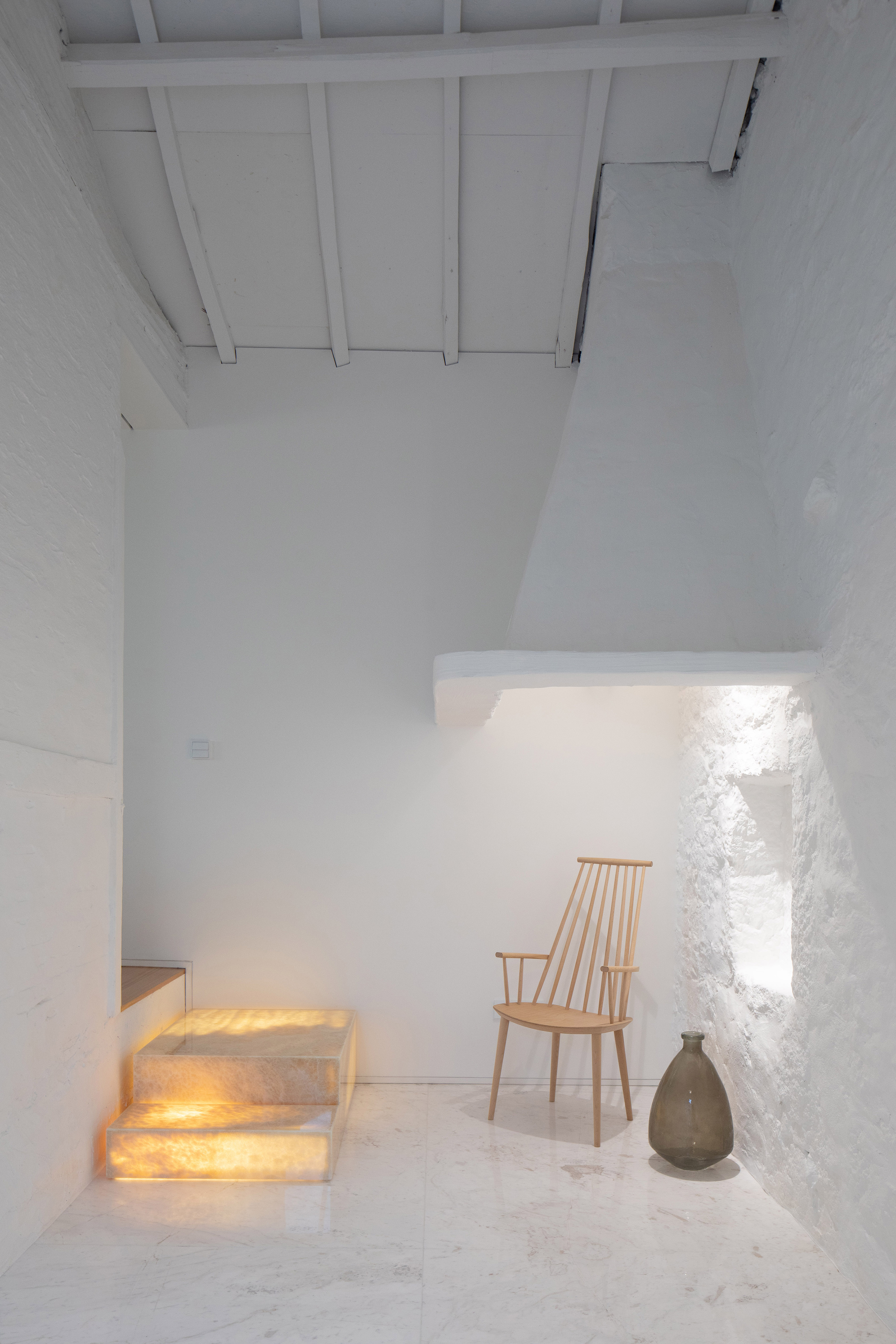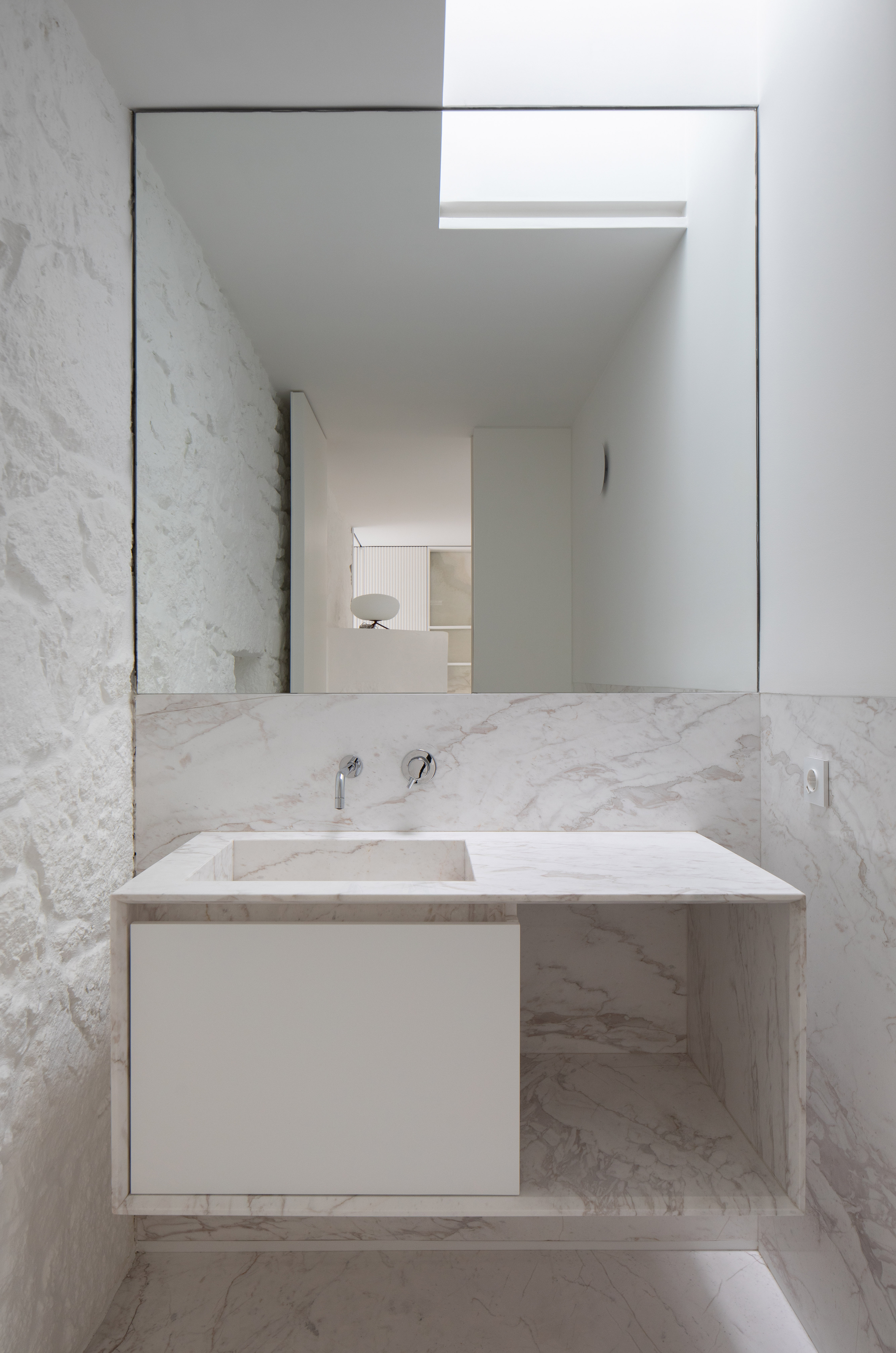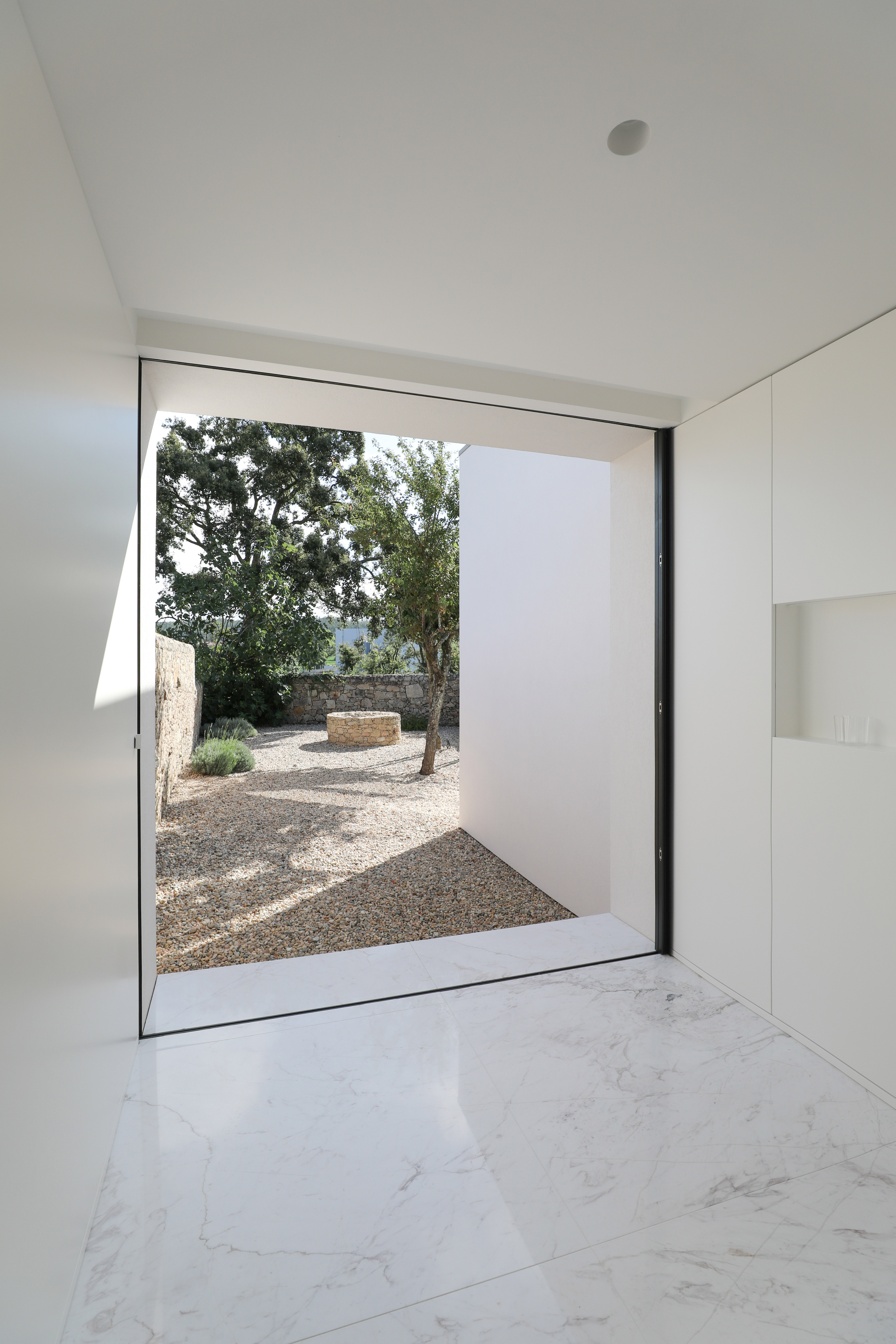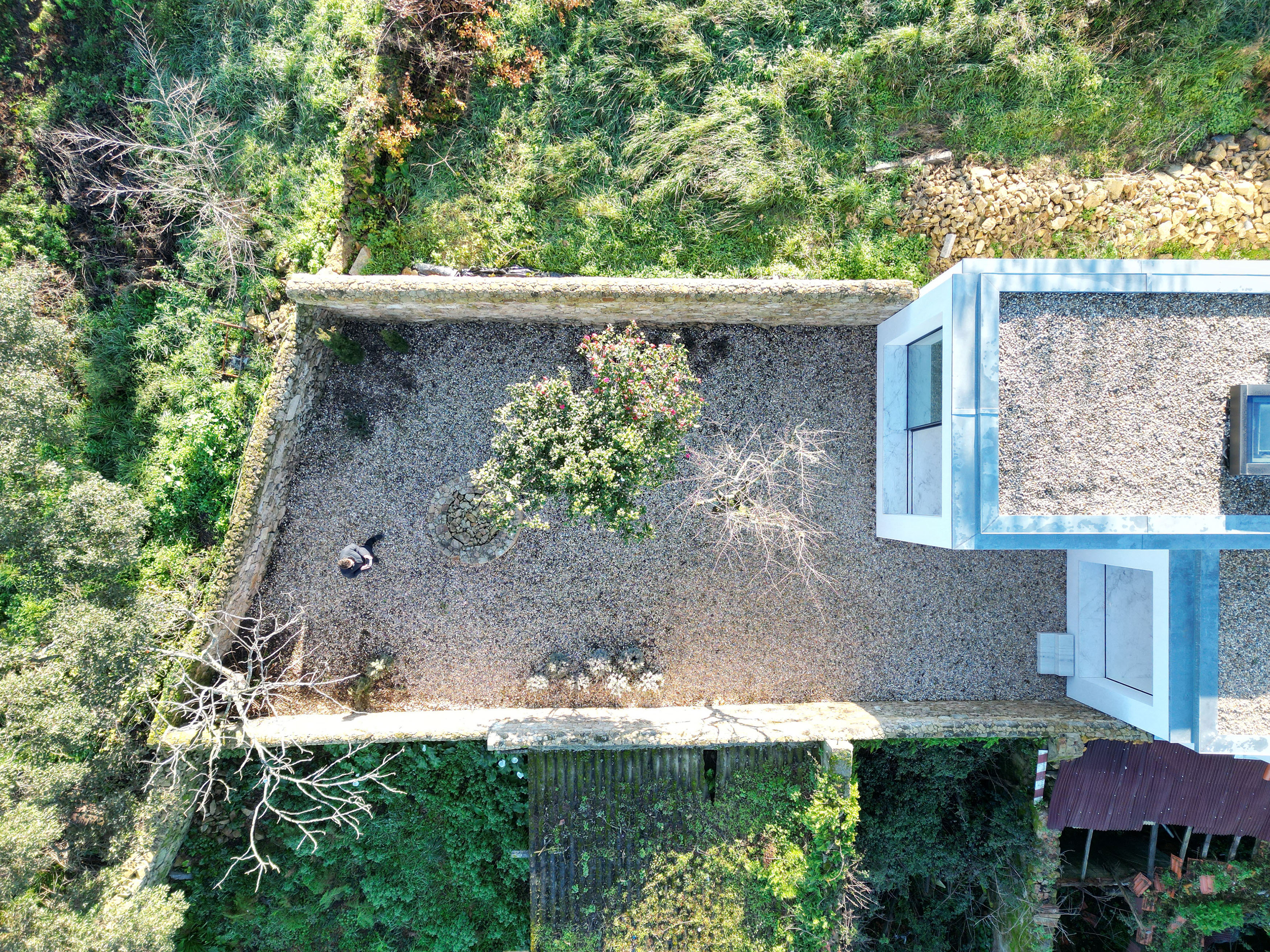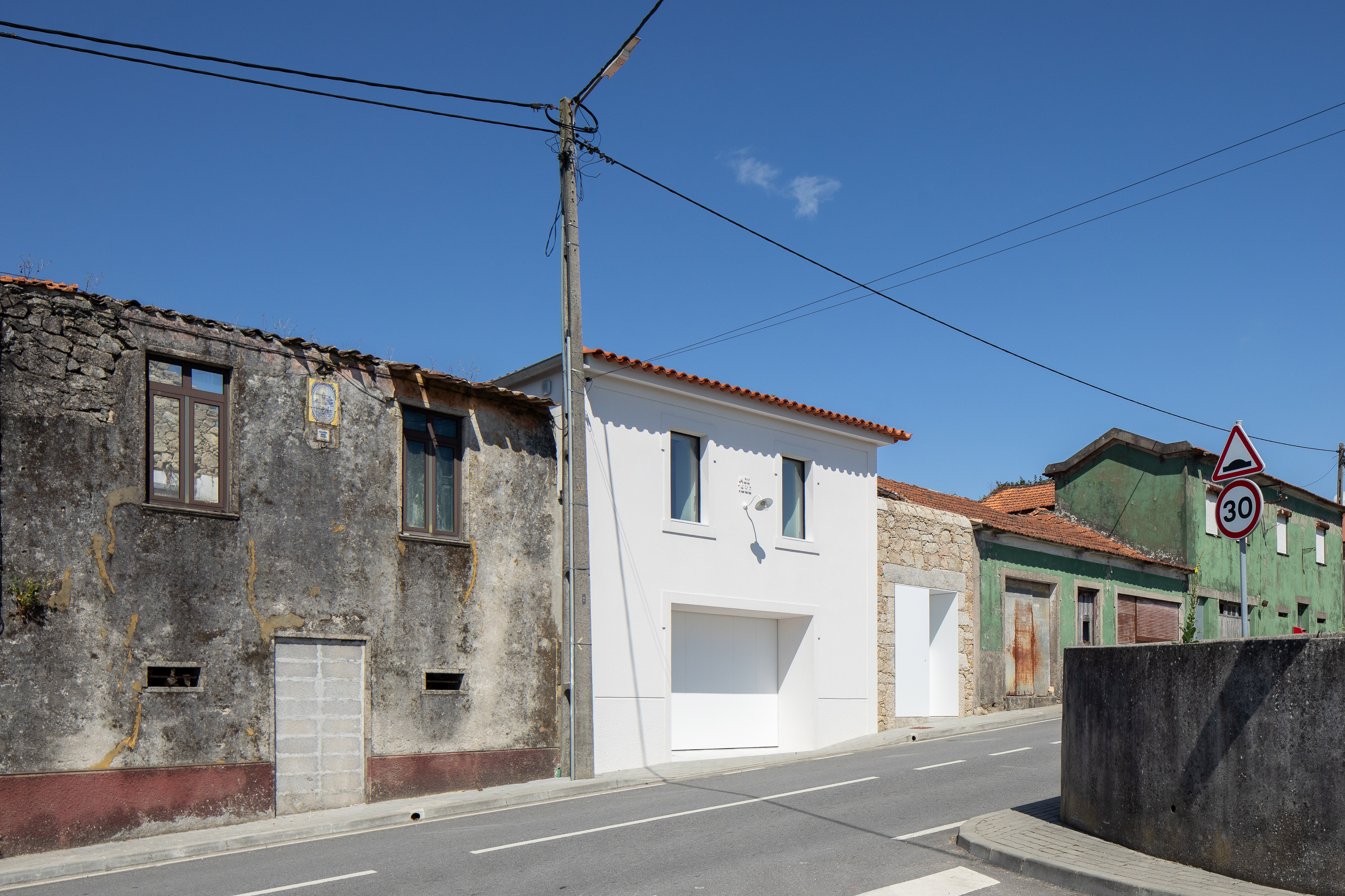 The small house dated 1936 was built by my grandparents, in the place of Santagões, in a very rural area of Vila do Conde, where I am from. The architecture studio operated for ten years in the original house, practically as my grandmother had left it after her departure. The very rocky site only made it possible to extend the upper floor towards the back, which is leveled with the garden. On the lower floor, at the street level, the garage and the new technical area were placed. On the upper floor, an atrium was designed next to an existing oven that connects the old house to the new construction, and defines the entrance to the studio. The atrium allows access to the two bathrooms, the tall room used for meetings and the smaller room used as a break room, both of which open onto the garden, where the original well, the granite stone walls and trees were kept. In the existing construction, the wooden structure of the roof was preserved and was left exposed to make it possible to increase the height of the spaces. In the old kitchen area, the oven, the open wood fire chimney, the granite stone walls and the exposed wooden partition remained. In the main room, with wooden floor, there are two large work tables and the smaller windows with shutters that allow you to control natural lighting. Only this space functions as the second floor, the other spaces are the ground floor, at garden level, and in those the floors are made of white marble.