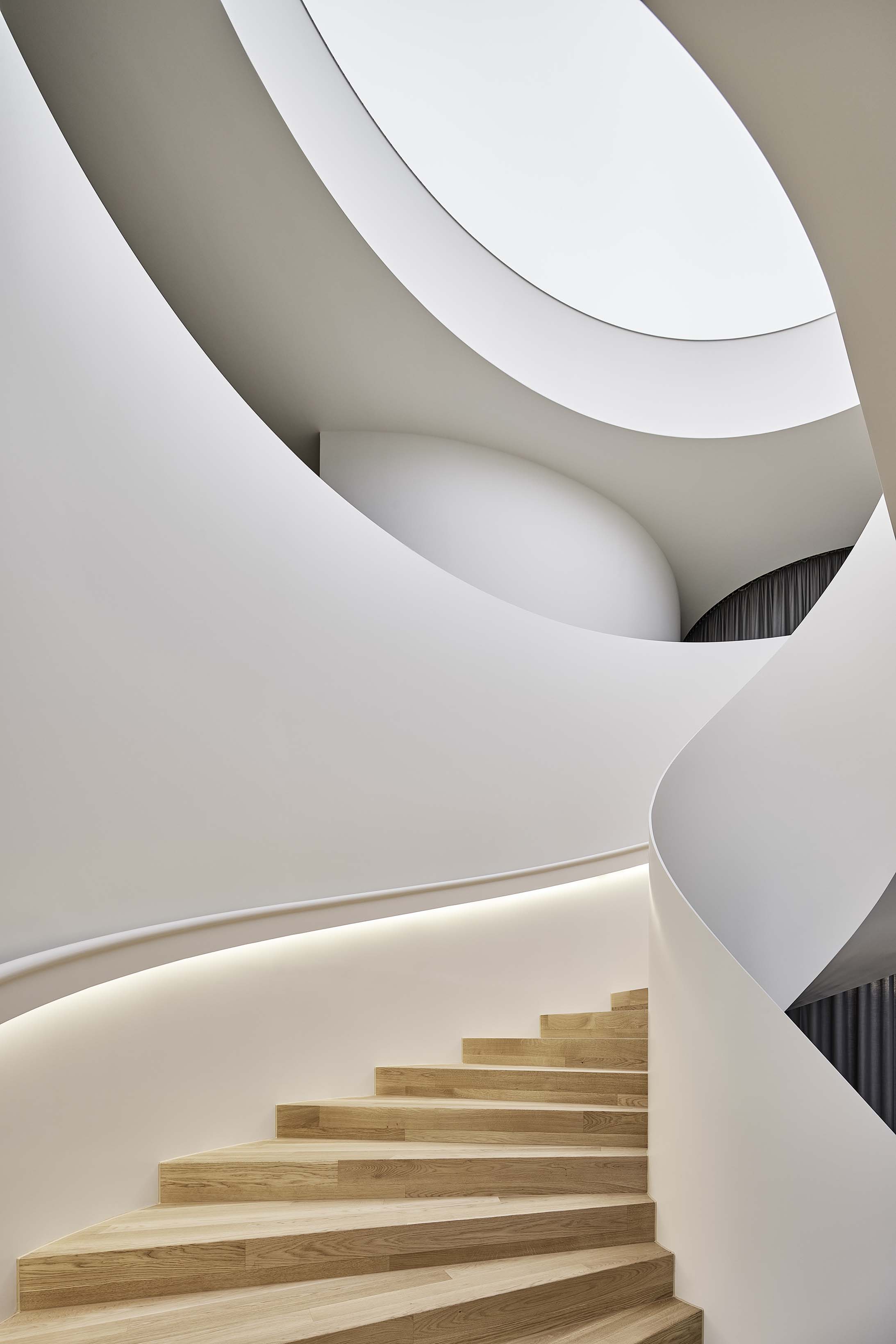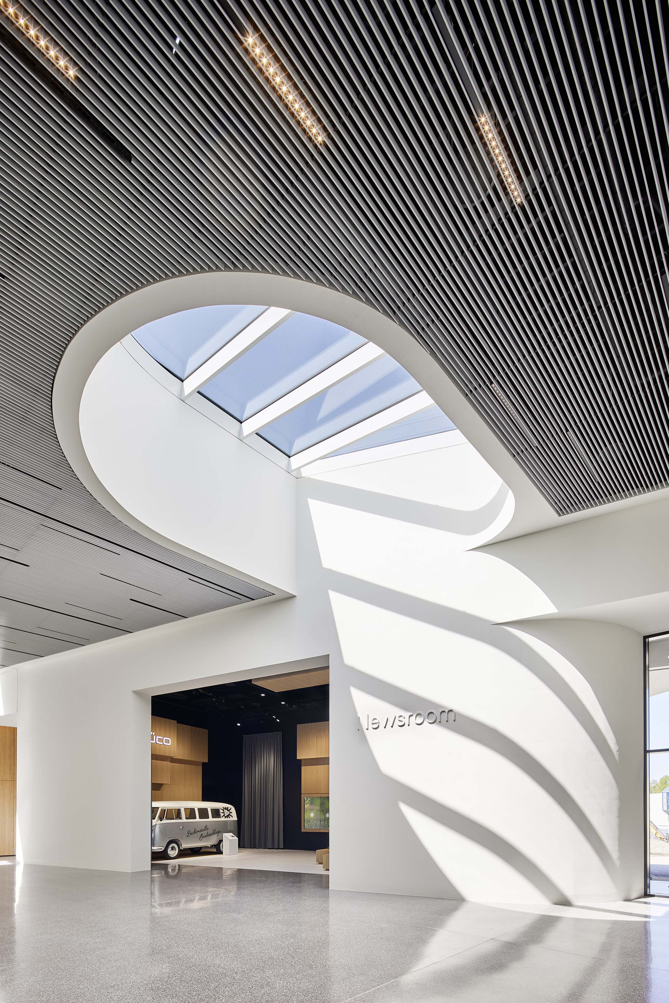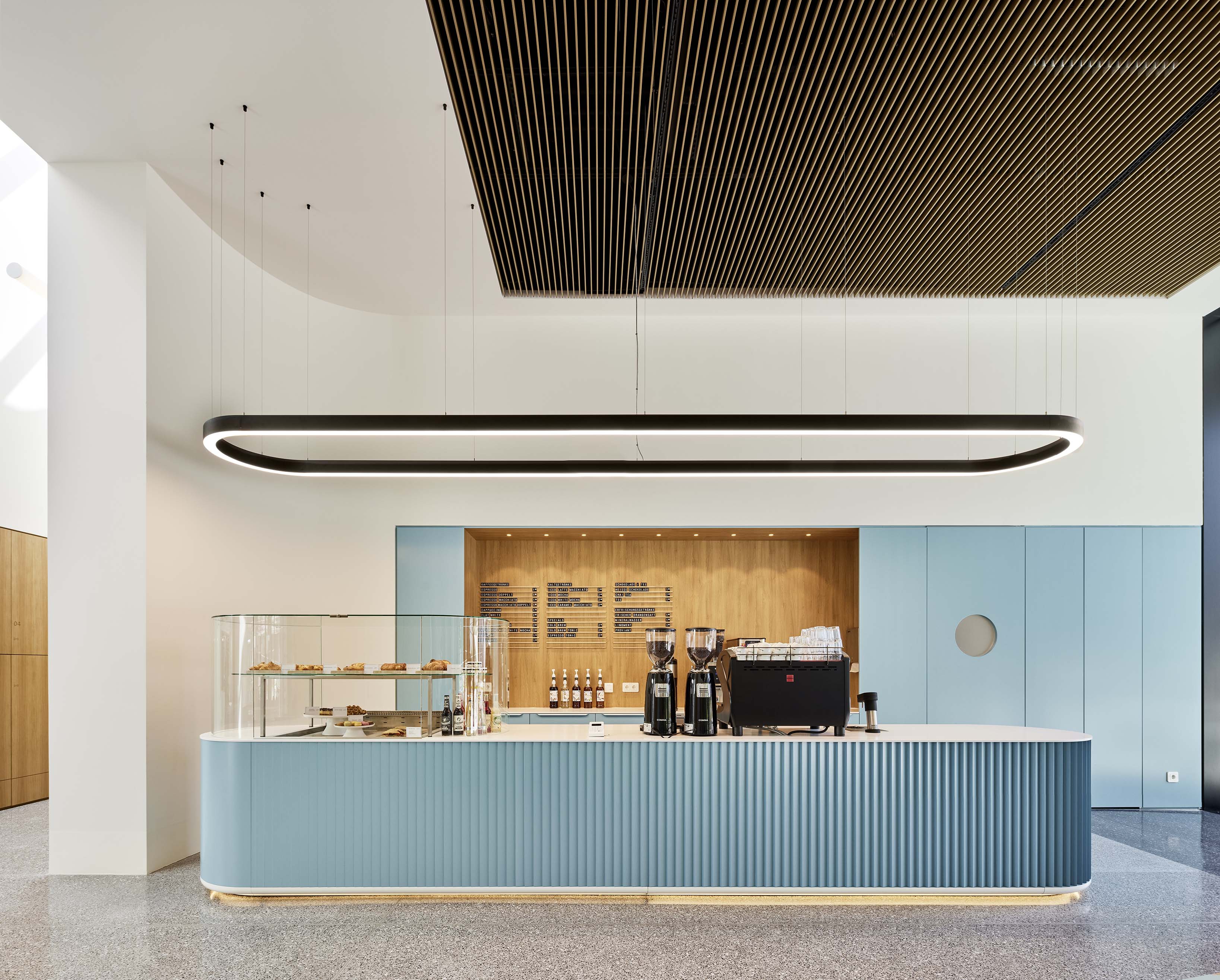 With the Welcome Forum, the Bielefeld based company Schüco has fundamentally redesigned its central showroom, which already existed on the campus there. For this purpose, two existing factory buildings were remodeled inside and out to offer a contemporary and appropriate corporate image. As the new “heart of Schüco”, the building serves as a central contact point for visitors and employees alike, providing exhibition rooms, areas for workshops and presentations, as well as a small café. The comparably unusual atmosphere of the interior arises from the spatial translation of a controlled, dynamised formal language that combines the curvilinear geometries of the contemporary digital architectural avant-garde with the orthogonal basic geometry of the existing buildings. On the basis of such a disciplined sculptural language of form, the Welcome Forum appears simultaneously exciting and sophisticated, but also appropriate, pragmatic and down-to-earth. Its interior shows carefully composed spatial sequences and visual connections that go beyond the pure interior space as they extend to the exterior of the building.