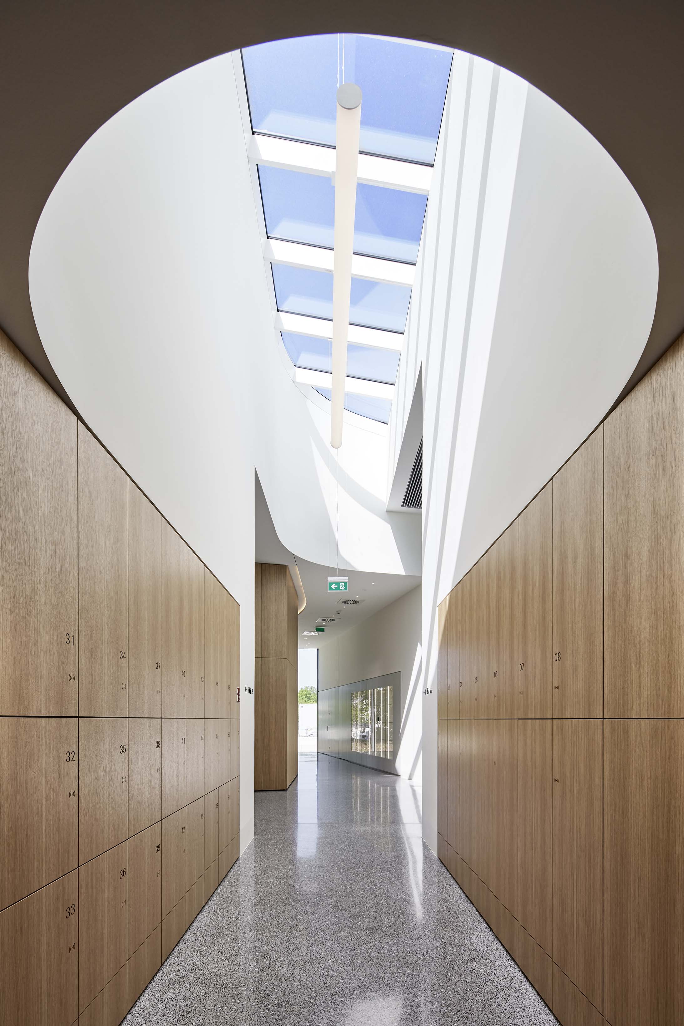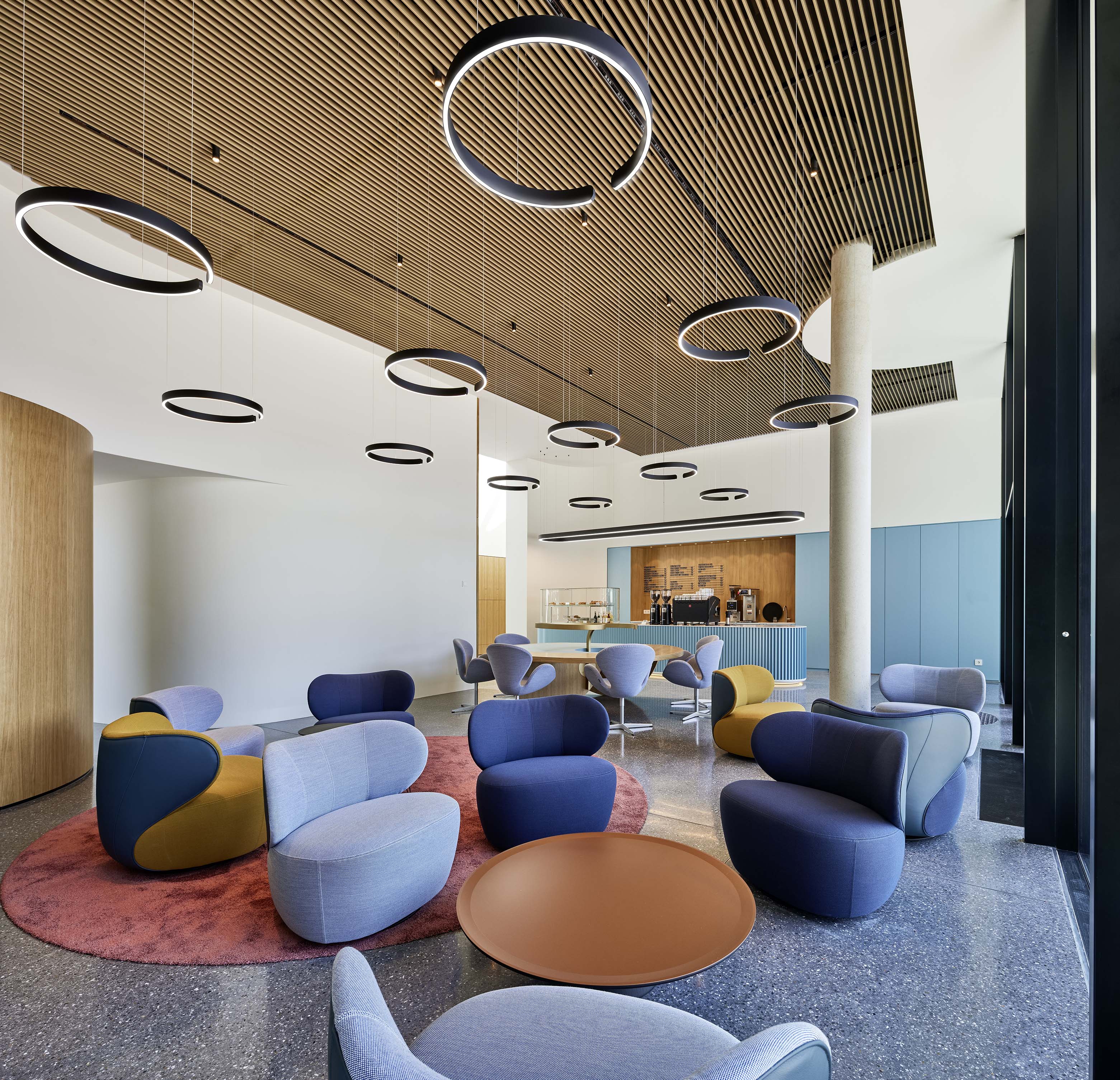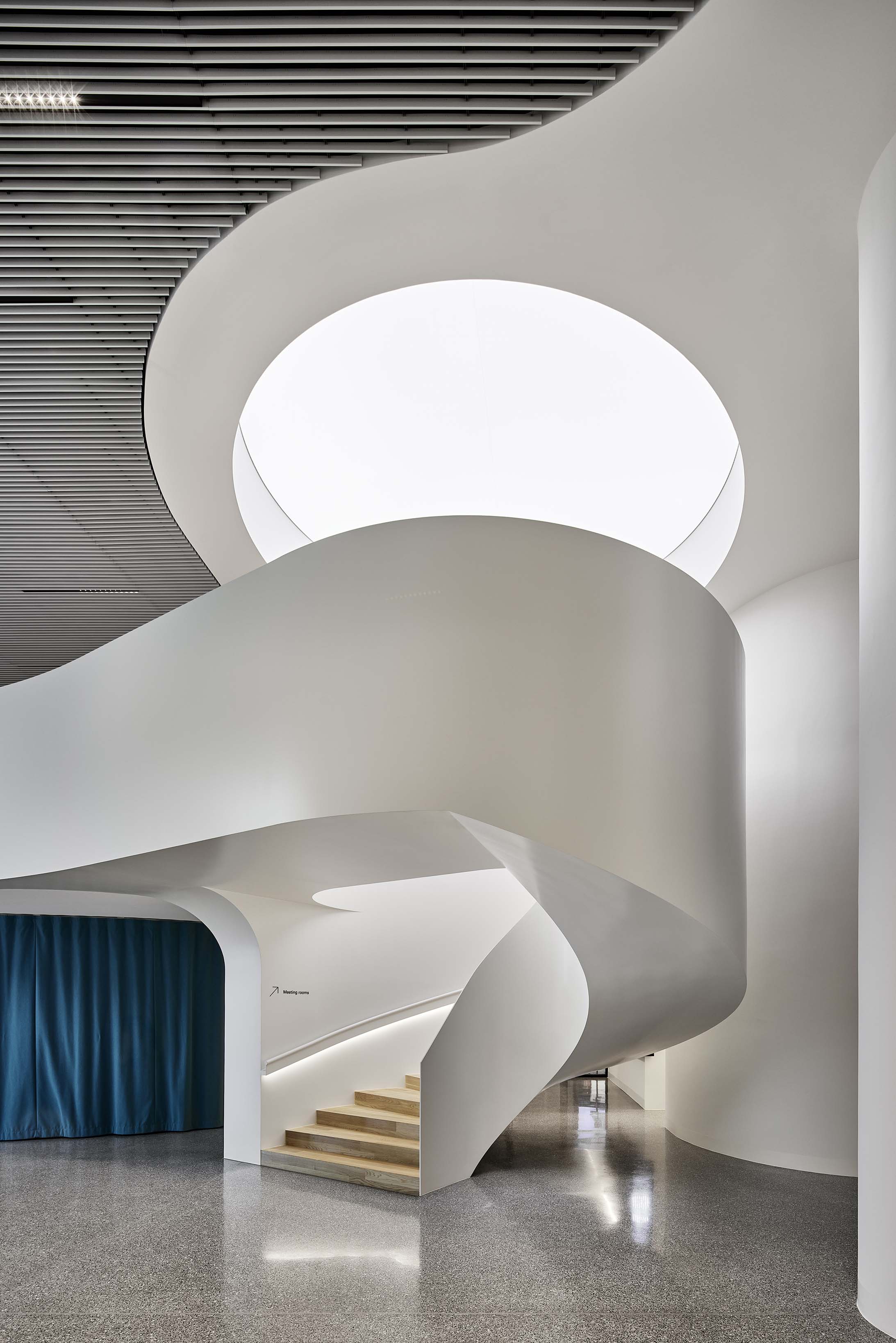 With the Welcome Forum, the Bielefeld based company Schüco has fundamentally redesigned its central showroom, which already existed on the campus there. For this purpose, two existing factory buildings were remodeled inside and out to offer a contemporary and appropriate corporate image. As the new “heart of Schüco”, the building serves as a central contact point for visitors and employees alike, providing exhibition rooms, areas for workshops and presentations, as well as a small café. The comparably unusual atmosphere of the interior arises from the spatial translation of a controlled, dynamised formal language that combines the curvilinear geometries of the contemporary digital architectural avant-garde with the orthogonal basic geometry of the existing buildings. On the basis of such a disciplined sculptural language of form, the Welcome Forum appears simultaneously exciting and sophisticated, but also appropriate, pragmatic and down-to-earth. Its interior shows carefully composed spatial sequences and visual connections that go beyond the pure interior space as they extend to the exterior of the building.