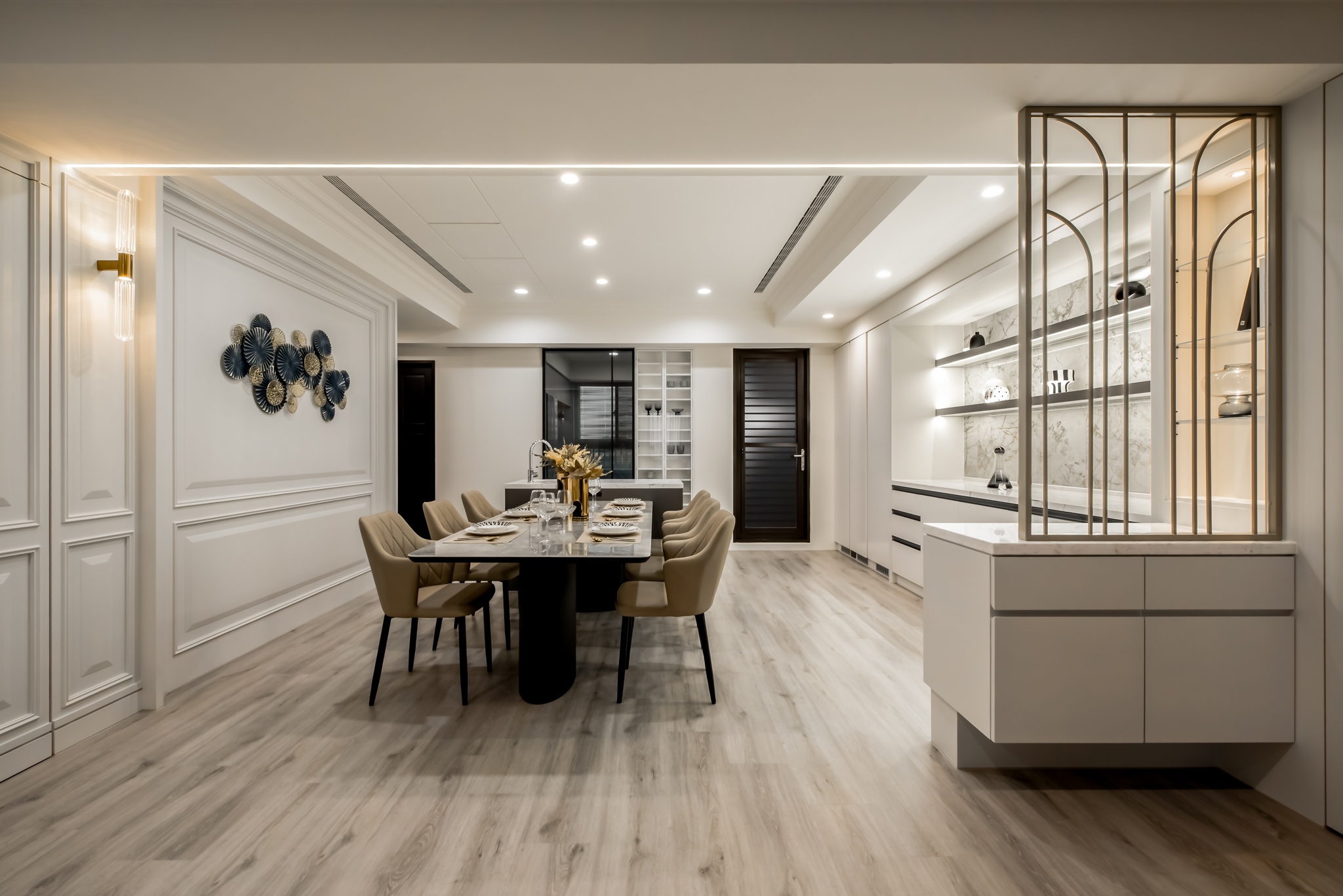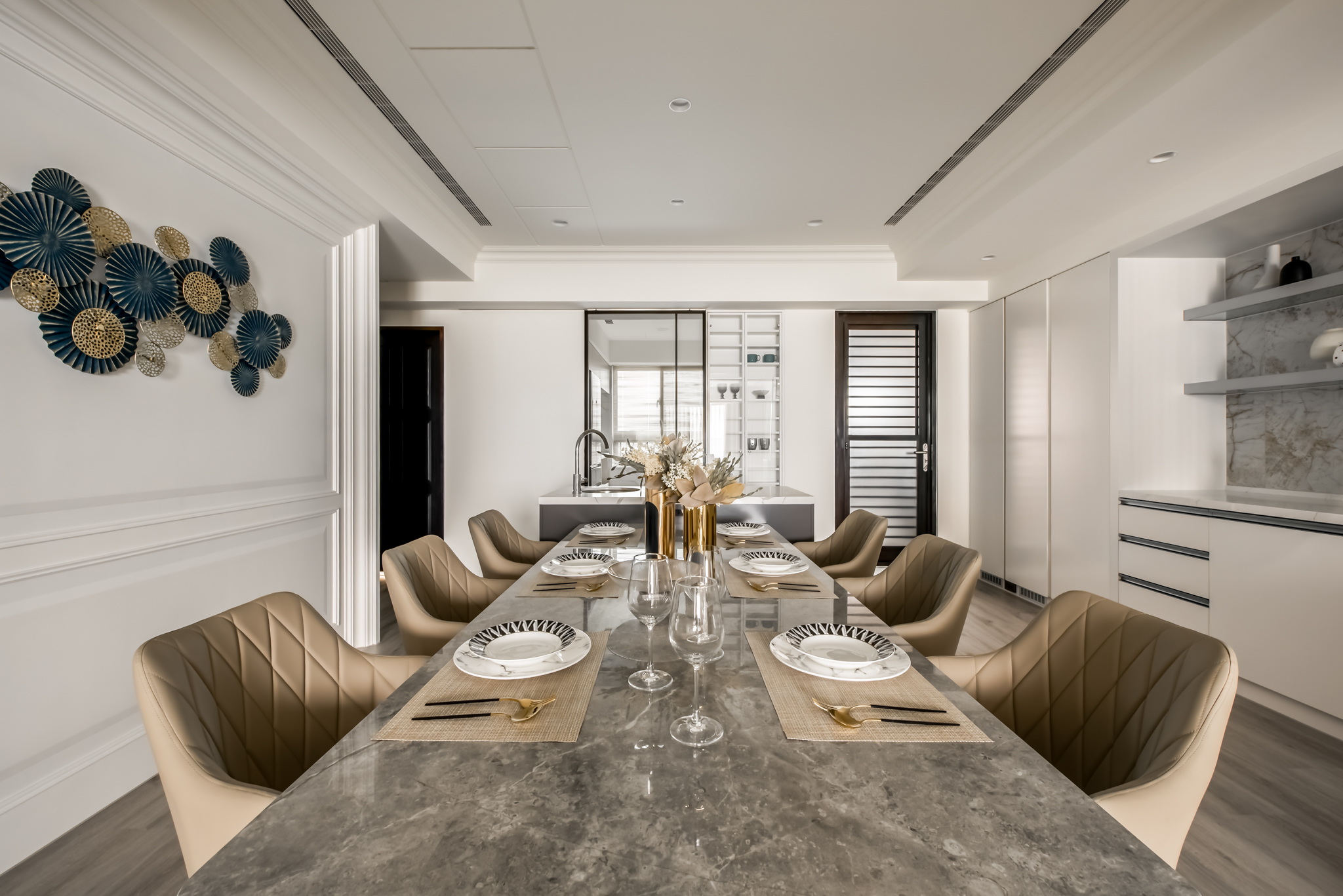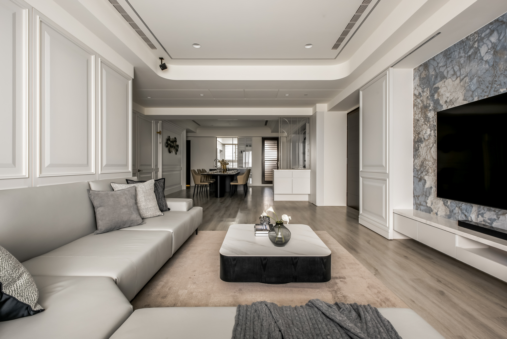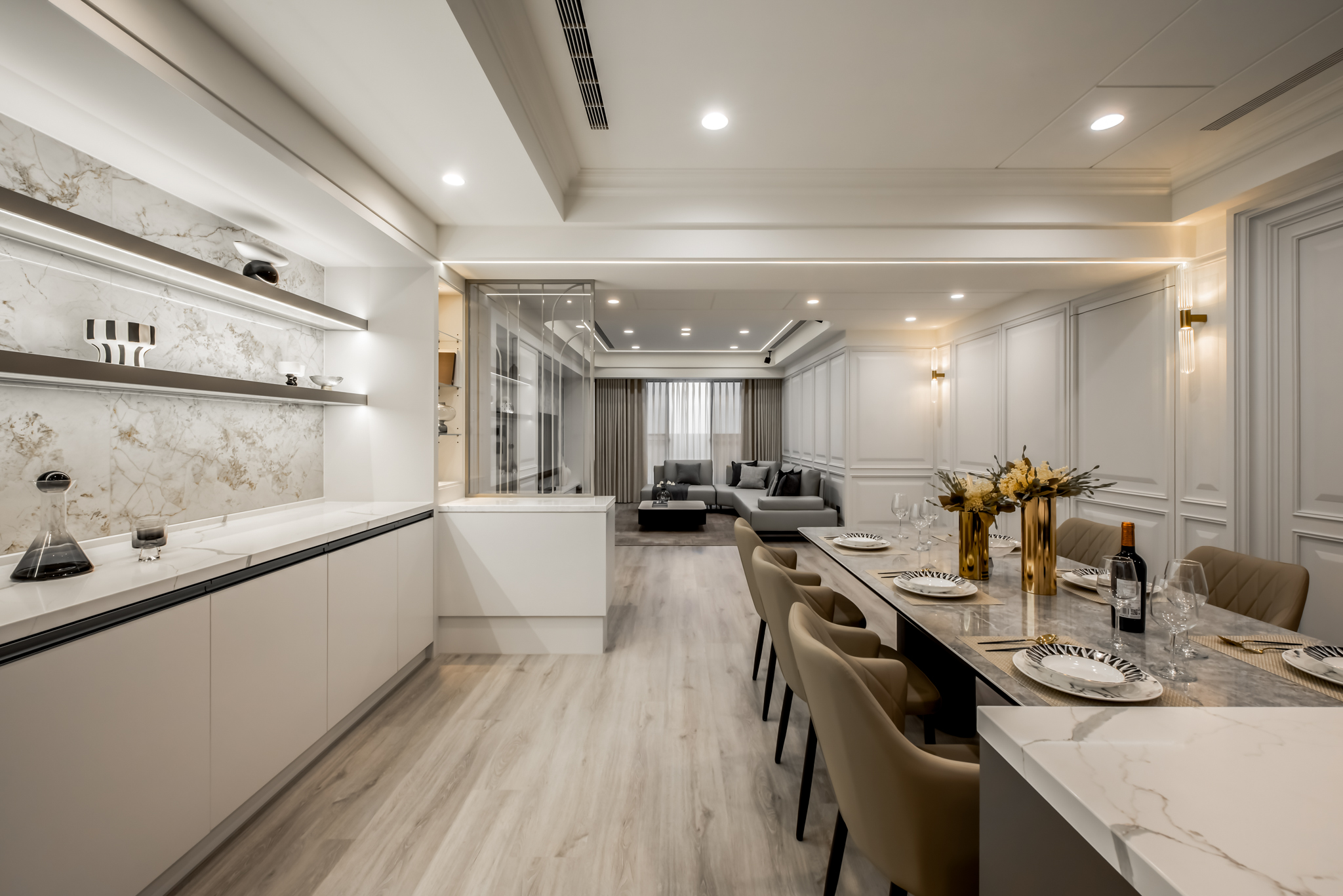 This exquisite residential design project presents a captivating modern neoclassical theme, skillfully combining pure white tones with elegant moldings to create a soft, sophisticated, and streamlined ambiance. The design team artfully merges livable quality with exotic accents, employing carefully selected materials and thoughtfully arranged layouts to construct a poetic sanctuary where light, shadow, and ambiance gracefully intertwine. Furthermore, the project places a strong emphasis on health and humanistic values. It incorporates innovative features such as concealed dehumidifiers and anti-smog window screens, which not only enhance air circulation but also safeguard indoor air quality. Consequently, these design elements transform the residence from a mere spatial container into a nurturing environment where comfort and quality are paramount, ensuring a daily experience that elevates the standards of modern living. The public area gracefully unfolds with its open layout, effortlessly cultivating a welcoming and airy ambiance. A striking feature wall behind the television showcases imported blue-gray thin panels, which harmoniously blend with pure white moldings and light wood flooring. This combination establishes a grand yet refined atmosphere that invites both relaxation and sophistication. In the dining area, the space is anchored by an elongated stone table that serves as a focal point for gatherings. Surrounding this centerpiece are elegantly upholstered leather dining chairs, accented by metallic art pieces that elevate the aesthetic, reflecting a discerning taste appropriate for both casual meals and entertaining guests. Furthermore, the light gray cabinetry complements the pristine white countertops, creating a cohesive visual appeal. As sunlight streams through the expansive windows, it bathes the area in a warm, inviting glow, enhancing the bright and airy feel of this beautifully designed space.