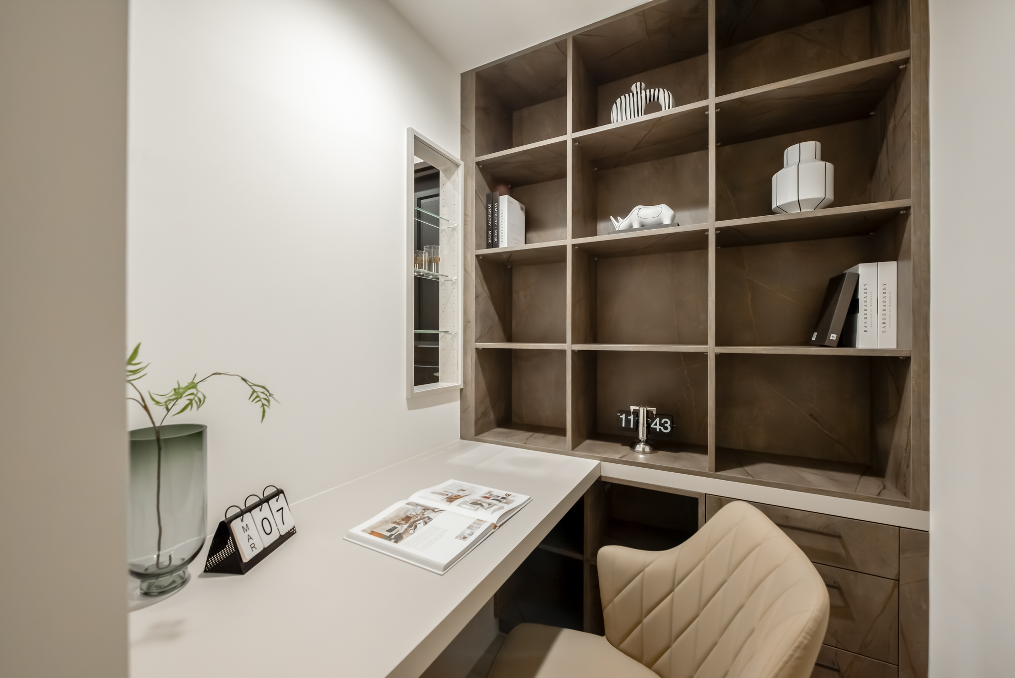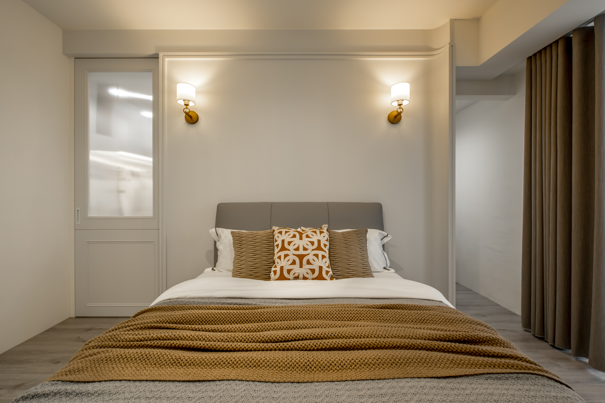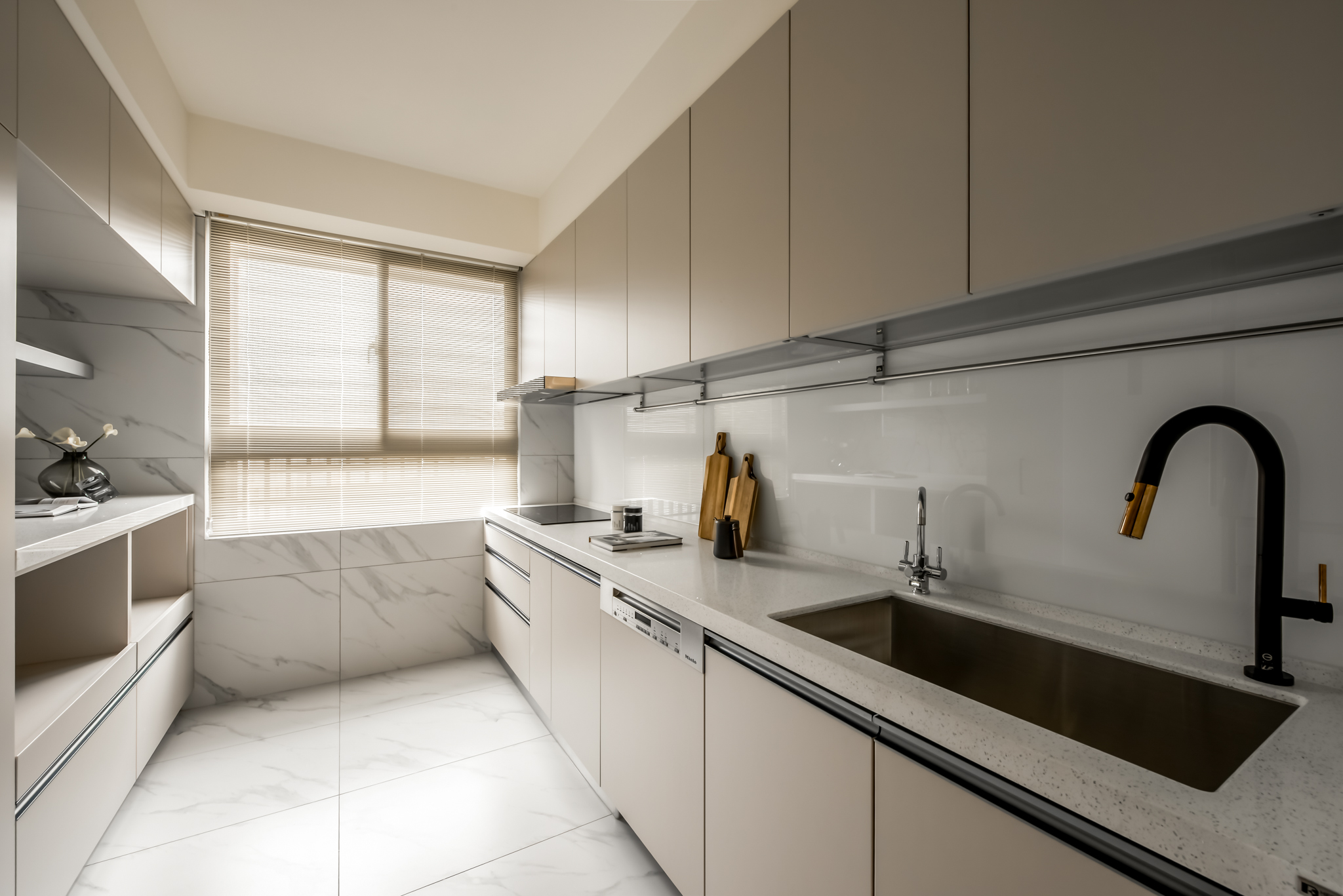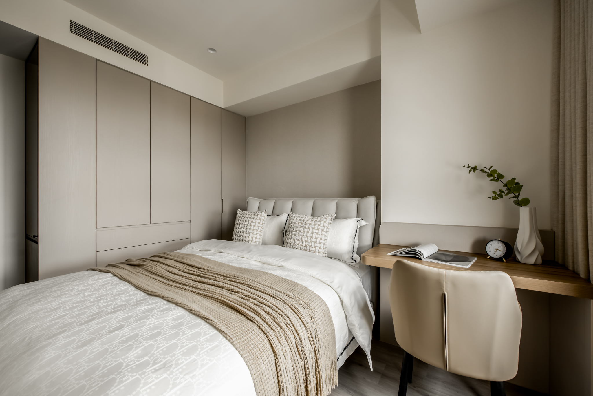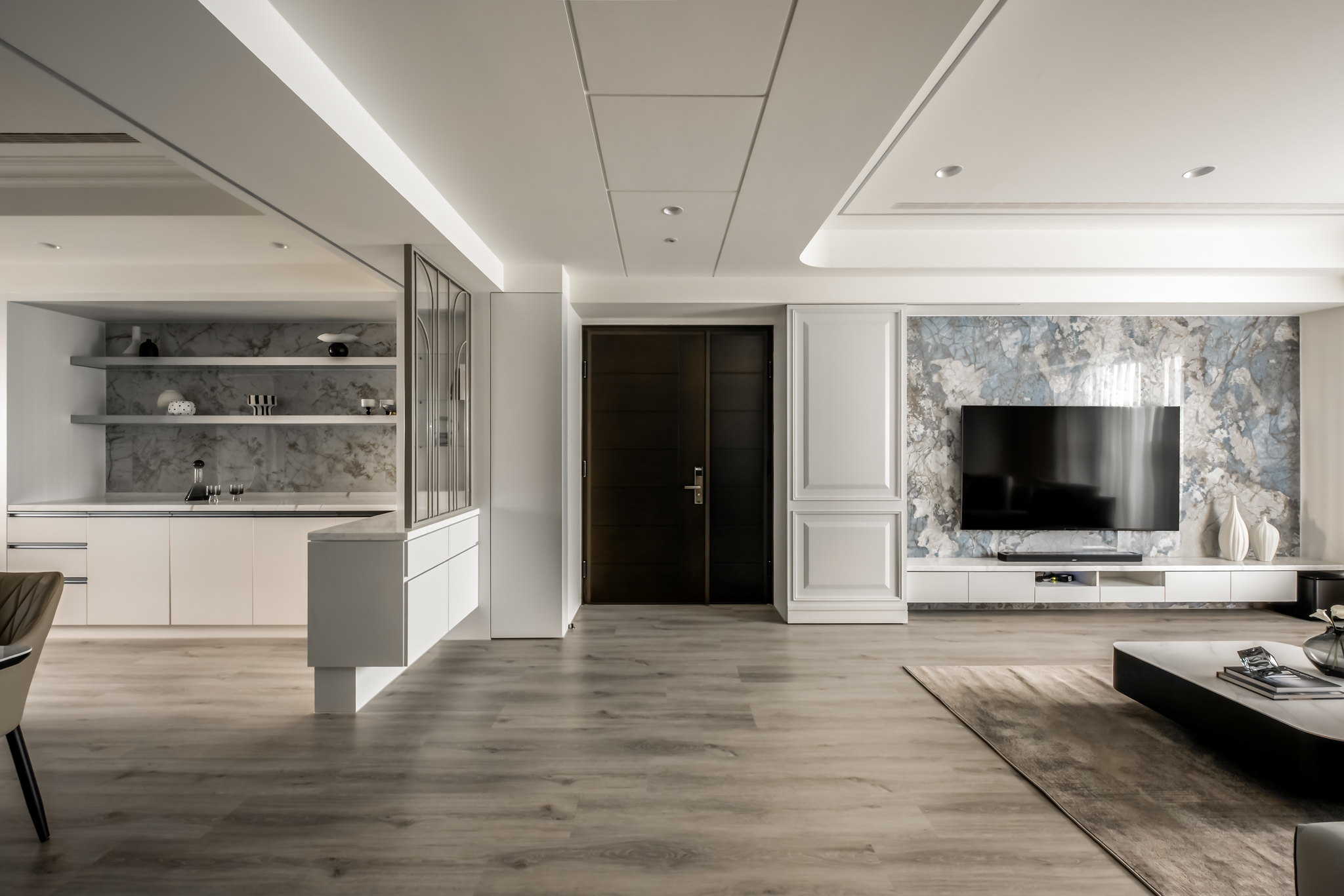 This exquisite residential design project presents a captivating modern neoclassical theme, skillfully combining pure white tones with elegant moldings to create a soft, sophisticated, and streamlined ambiance. The design team artfully merges livable quality with exotic accents, employing carefully selected materials and thoughtfully arranged layouts to construct a poetic sanctuary where light, shadow, and ambiance gracefully intertwine. Furthermore, the project places a strong emphasis on health and humanistic values. It incorporates innovative features such as concealed dehumidifiers and anti-smog window screens, which not only enhance air circulation but also safeguard indoor air quality. Consequently, these design elements transform the residence from a mere spatial container into a nurturing environment where comfort and quality are paramount, ensuring a daily experience that elevates the standards of modern living. The public area gracefully unfolds with its open layout, effortlessly cultivating a welcoming and airy ambiance. A striking feature wall behind the television showcases imported blue-gray thin panels, which harmoniously blend with pure white moldings and light wood flooring. This combination establishes a grand yet refined atmosphere that invites both relaxation and sophistication. In the dining area, the space is anchored by an elongated stone table that serves as a focal point for gatherings. Surrounding this centerpiece are elegantly upholstered leather dining chairs, accented by metallic art pieces that elevate the aesthetic, reflecting a discerning taste appropriate for both casual meals and entertaining guests. Furthermore, the light gray cabinetry complements the pristine white countertops, creating a cohesive visual appeal. As sunlight streams through the expansive windows, it bathes the area in a warm, inviting glow, enhancing the bright and airy feel of this beautifully designed space.