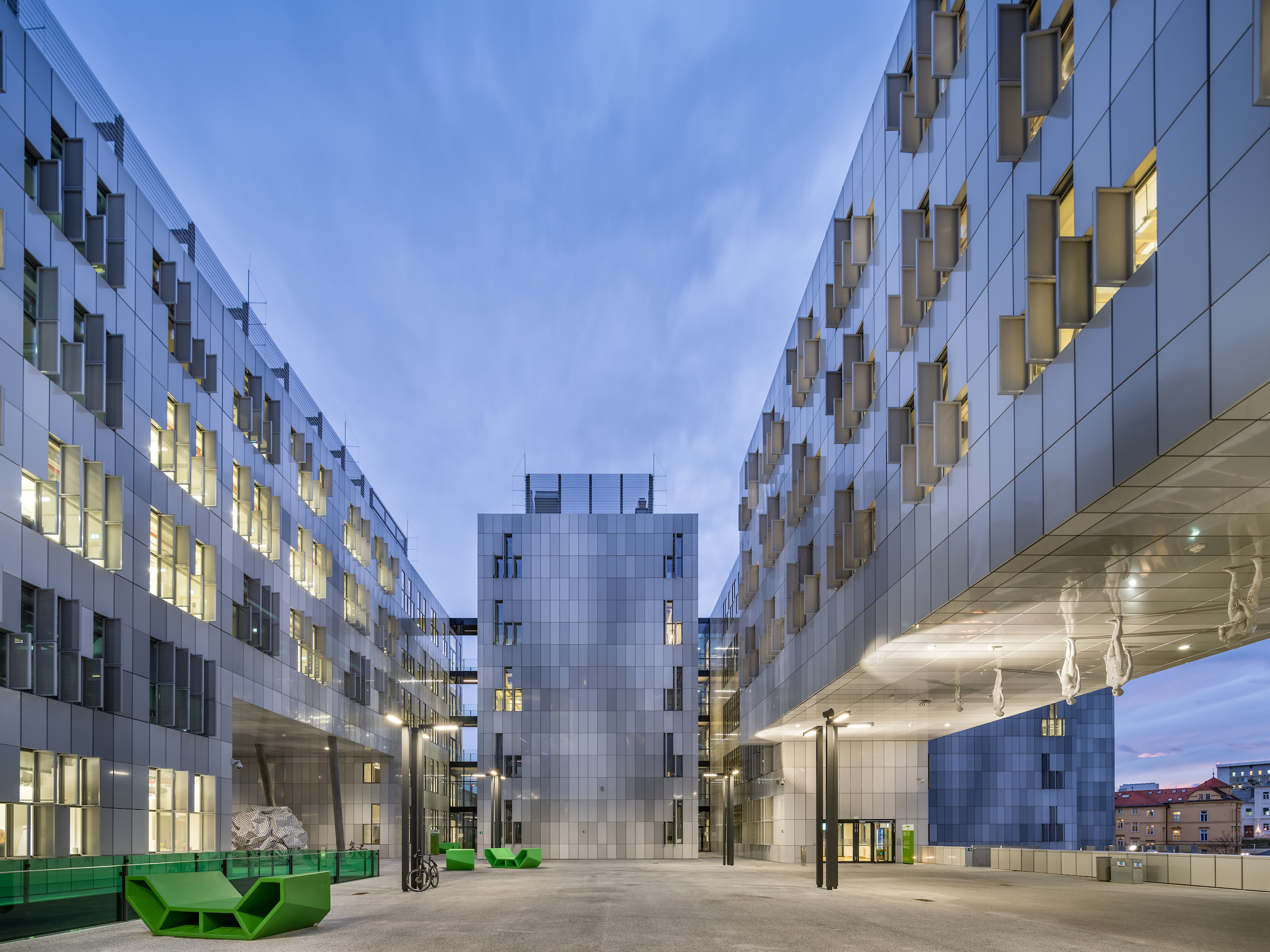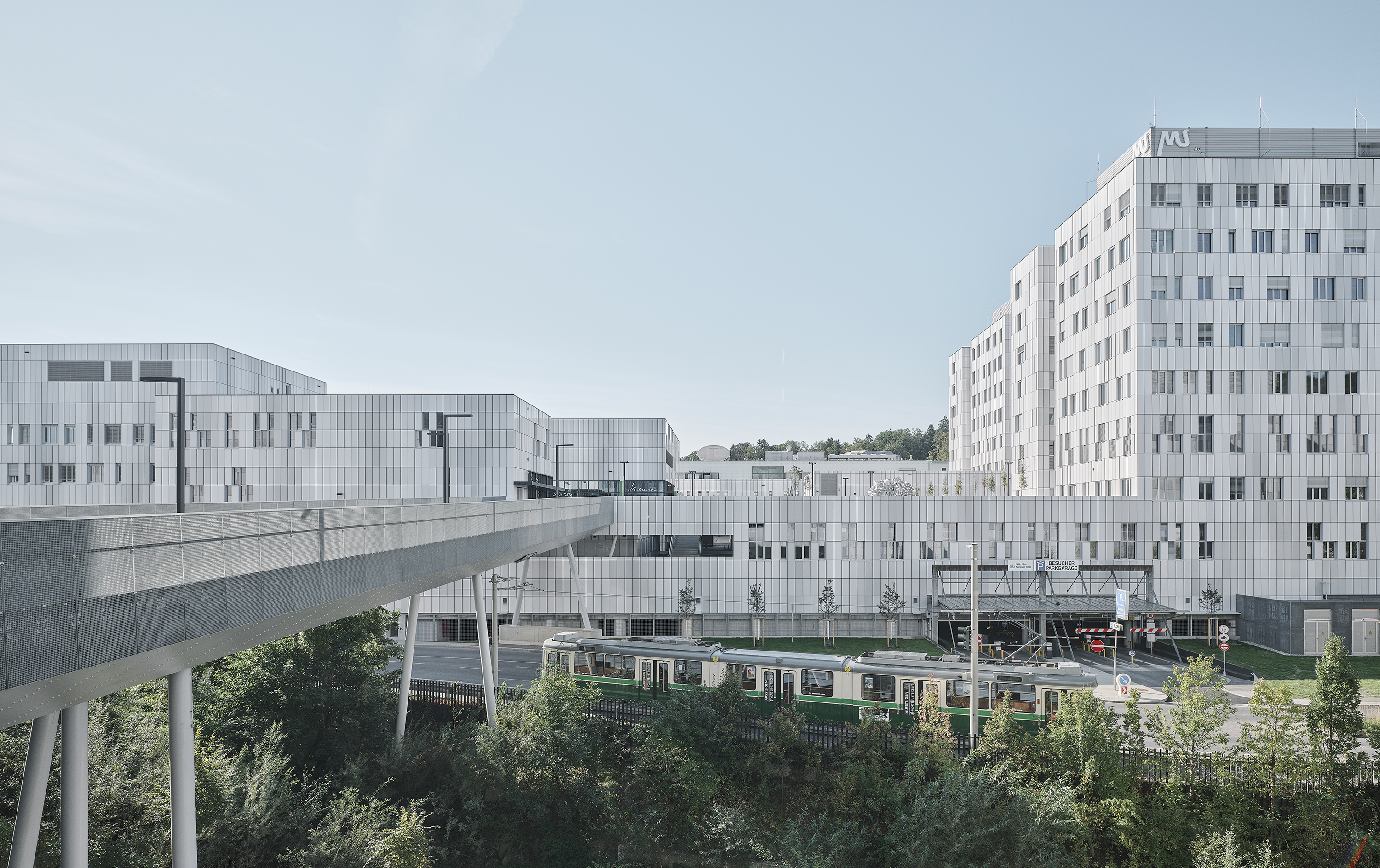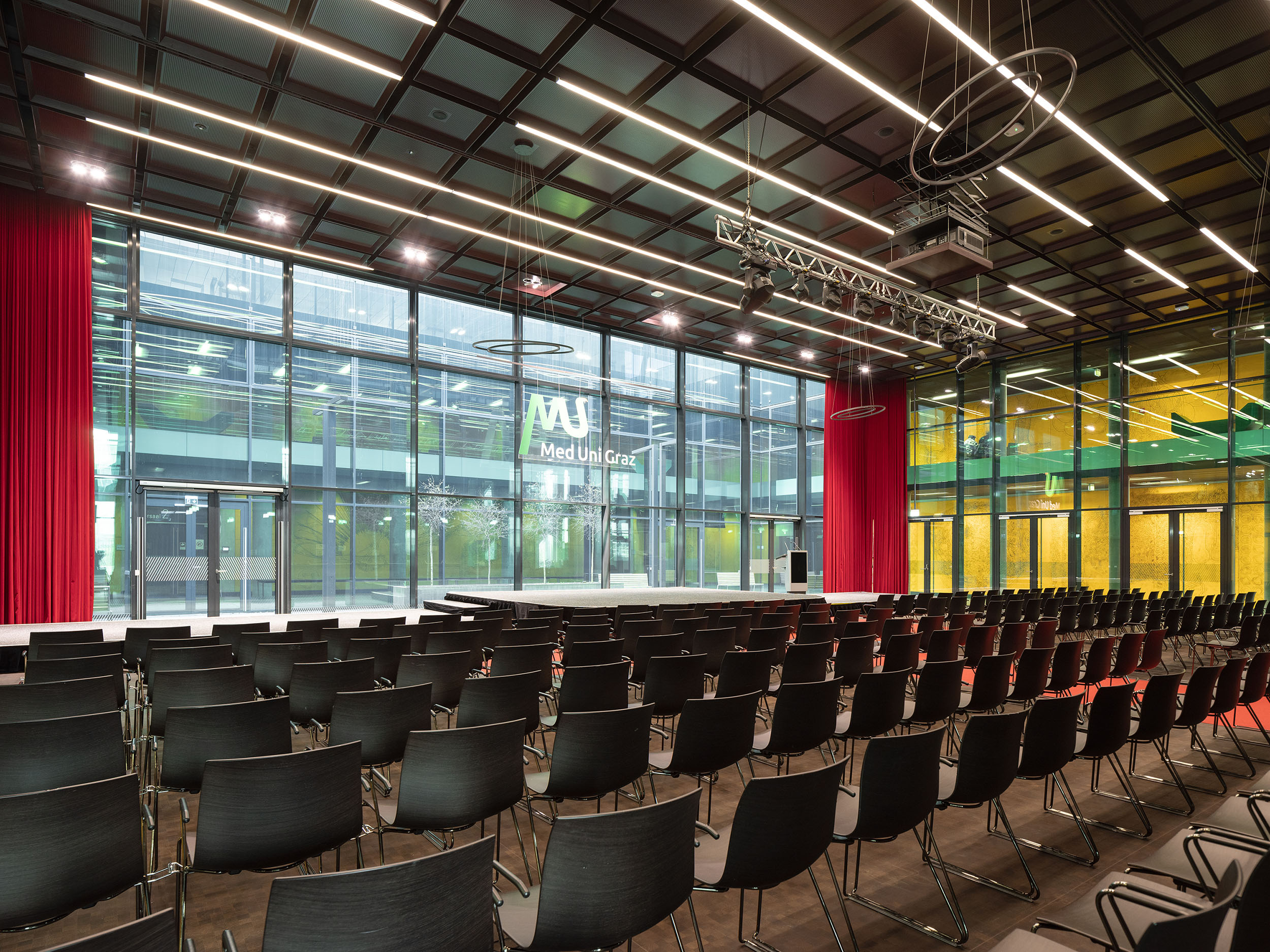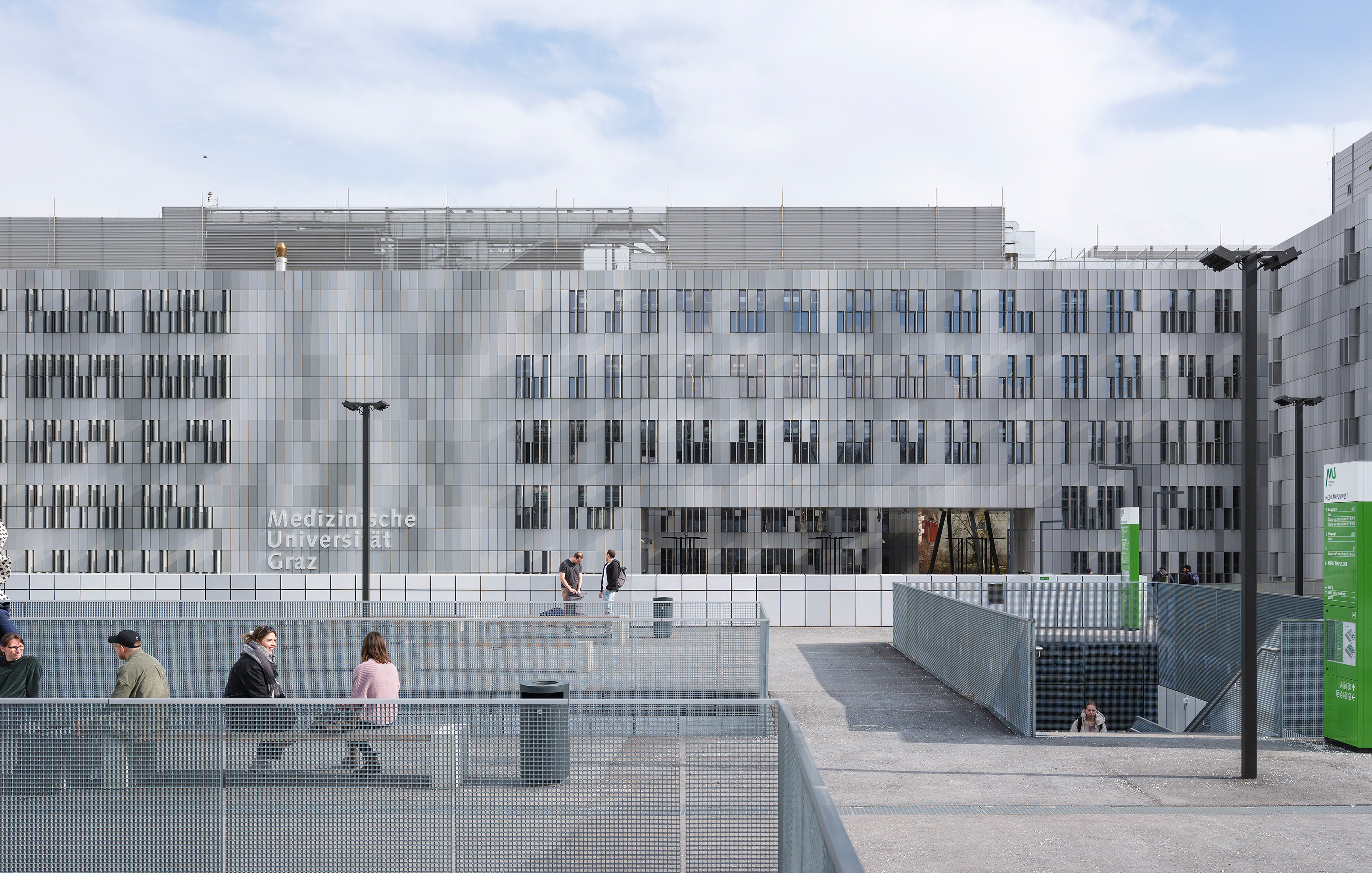 The concept for the Med Uni Campus Graz is based on the integration of work, teaching and leisure spaces on a shared inner-city site. The project implements a clearly structured ensemble of coherent yet differentiated buildings, taking the various requirements into account as far as possible. Openness, accessibility and communication play important roles here. The campus is characterized by the clear placement of the volumes, which creates an exciting interplay between buildings and open spaces, between public and non-public uses and thus a high potential for identification in the urban context. In terms of their content requirements, some of the uses go beyond the classic campus concept - be it in the scientific area due to the requirements of medical research, or due to the lively public traffic. The project responds to these diverse requirements primarily by vertically staggering the utilisation areas. As a contemporary response to the local microclimatic parameters, narrow, longitudinally orientated structures were developed to ensure the greatest possible supply of fresh air into the Graz basin. The central areas for teaching, such as lecture theatres and the auditorium, were built on two storeys, with the so-called campus level above as an important distribution level from which the institutes, laboratories and research areas are accessed. A pedestrian and cycle bridge on the campus level connects further teaching areas, the canteen and the administration. This has made it possible to realise a superordinate network of footpaths and cycle paths, to which the University Hospital Graz is also connected. The Med Campus Graz was certified in accordance with the ÖGNI and DGNB criteria and awarded the Platinum rating. In 2023, the project received the Austrian State Prize for Architecture, in 2024 the KOOP Award, and in 2025 the Design Educates Awards, bronze prize in Architecture Design.