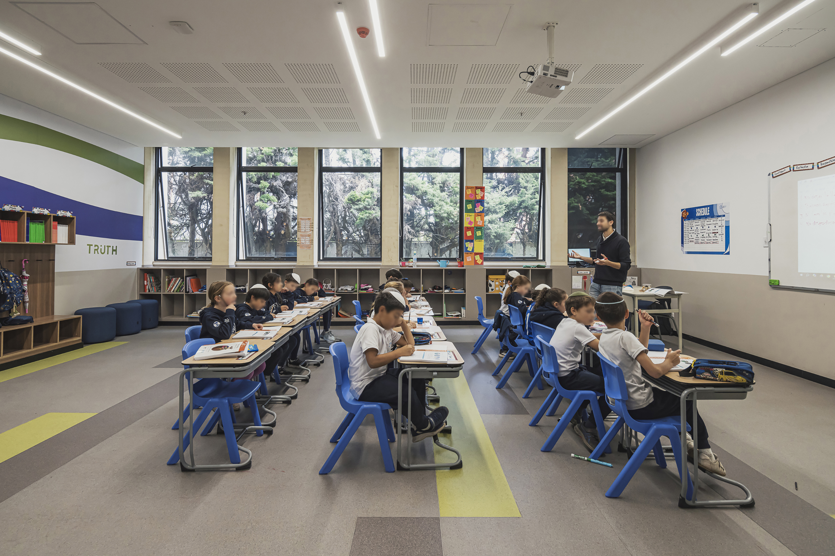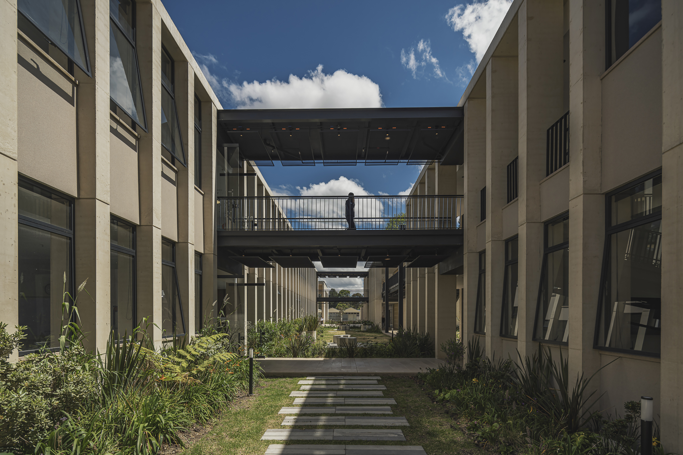 The renovation of the Colombo Hebreo School in Bogotá is the most ambitious project the Jewish community has undertaken in the city in the last 40 years. After more than 70 years of organic growth without a defined master plan, the opportunity arose to rethink the campus for the next 50 years. To secure funding, nearly a third of the land was sold, requiring a complete reconfiguration of the new buildings. The original layout, dictated by a central pathway, loosely arranged classrooms and facilities, creating fragmentation despite large green areas. The new master plan reorganizes the campus into three zones: academic areas, sports facilities, and service buildings, all integrated around the landscape. The central pathway becomes a grand promenade, serving as the unifying axis. Architecturally, the design expresses fundamental Jewish values. As the “People of the Book,” the community required an institution reflecting identity and tradition. The architecture is sober, timeless, and rhythmic, symbolizing perseverance and resilience. Materials—concrete, iron, and glass—are minimal yet harmonized with nature, embodying respect for the world and oneself. The result is spaces for reflection and learning that transcend classrooms. The program is distributed across four main buildings connected by lightweight structures, converging at the central plaza and Atrium—the most symbolic space. This double-height hall, ceremonial and reverent, evokes solemnity and a link between the earthly and celestial, elevating academia’s role in preserving legacy. Interconnected bridges, courtyards, plazas, and gardens lead to classrooms, multipurpose rooms, offices, a library, labs, art and music rooms, a makerspace (STEM), and an auditorium. This renewal not only modernized the campus but also created a setting that fosters learning, strengthens community bonds, and cements the Jewish cultural legacy. Every space reflects both history and aspirations.