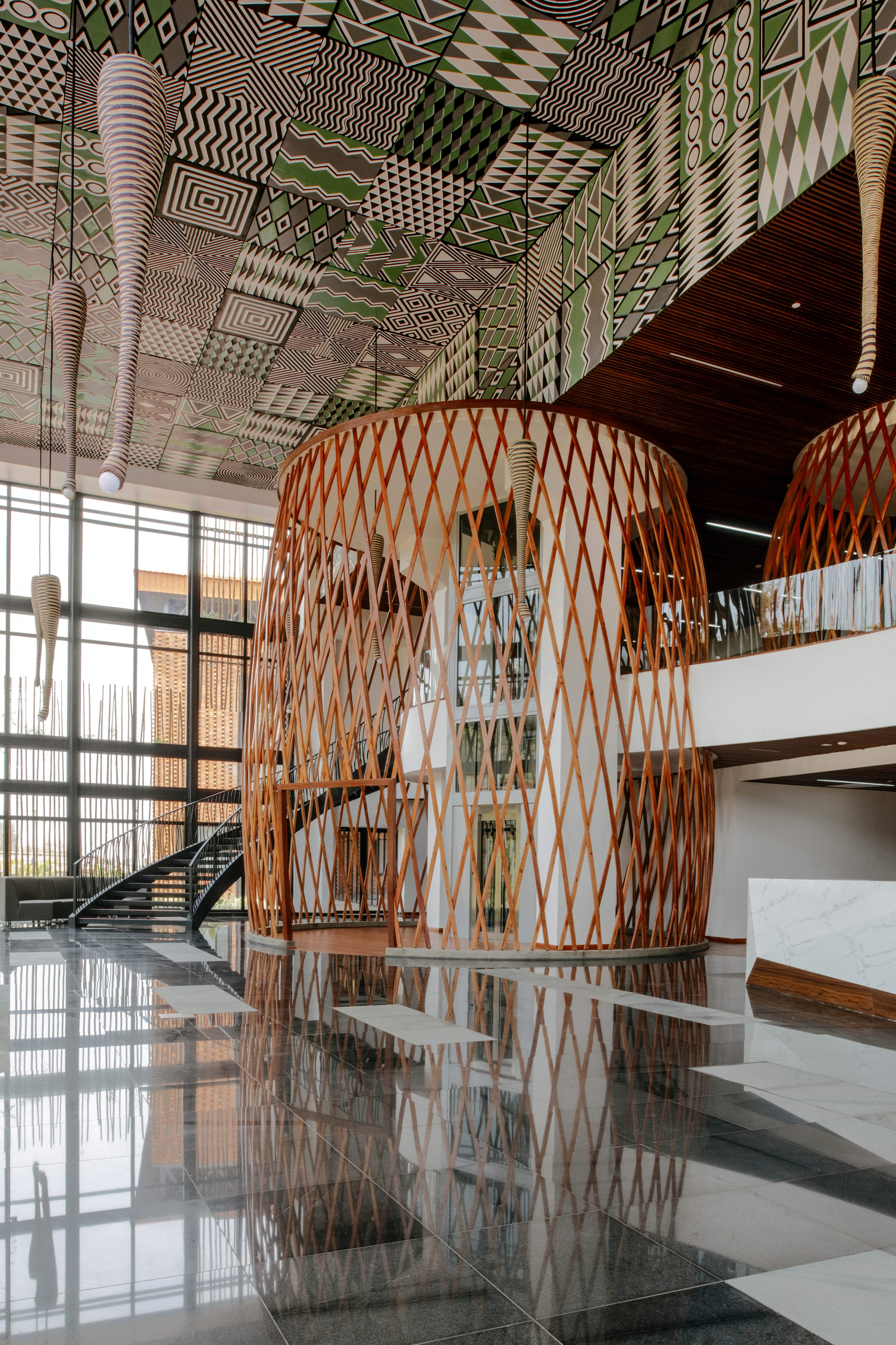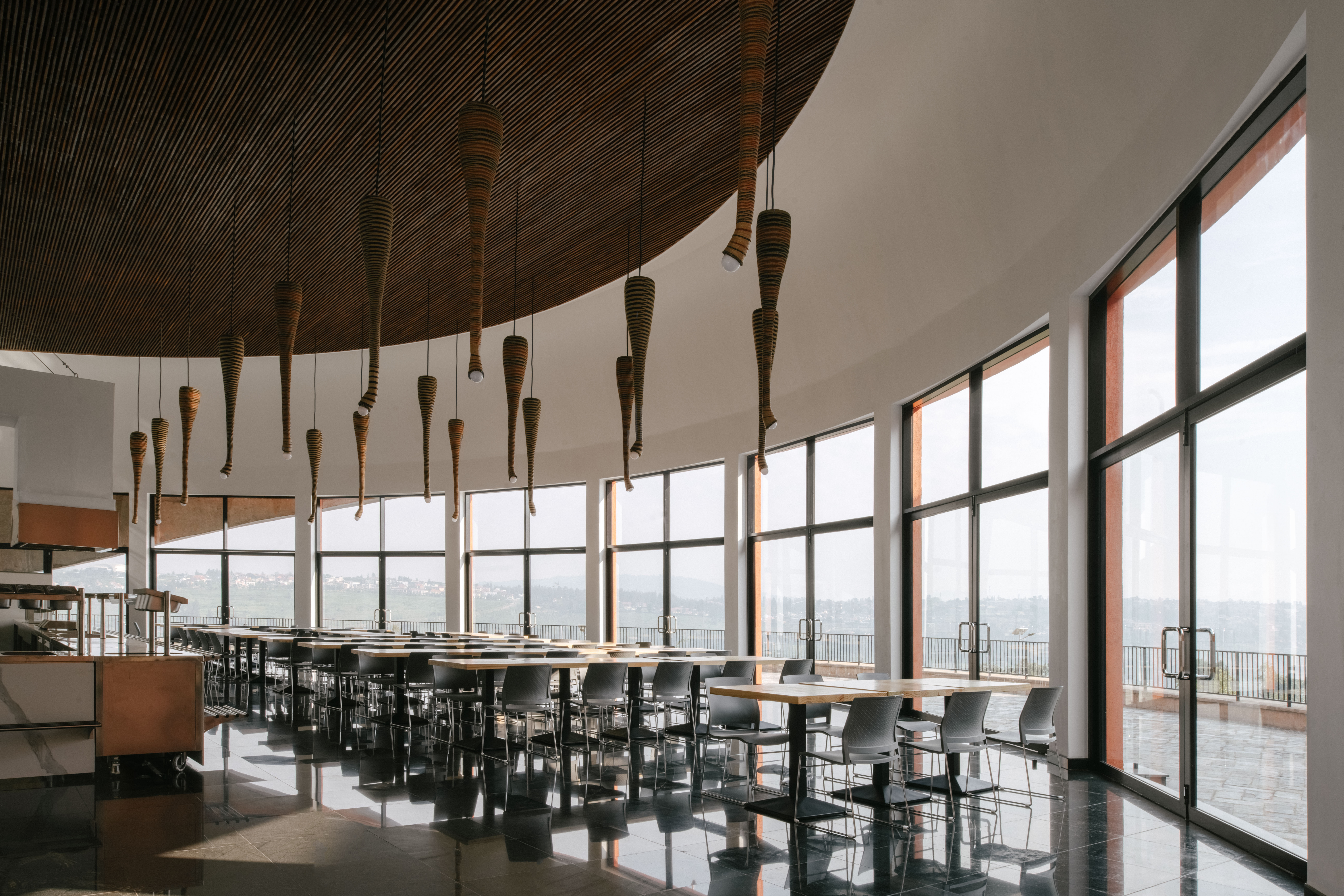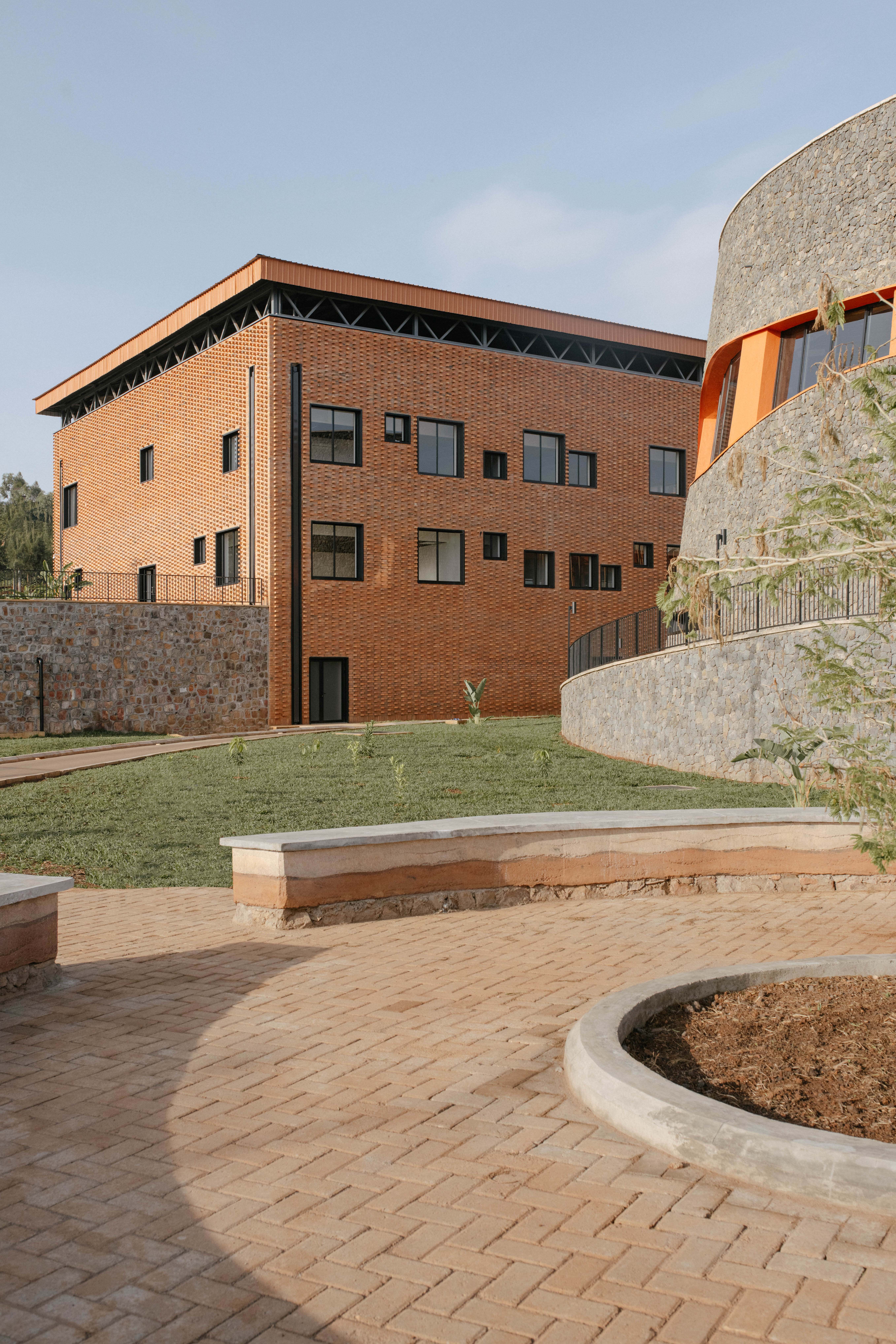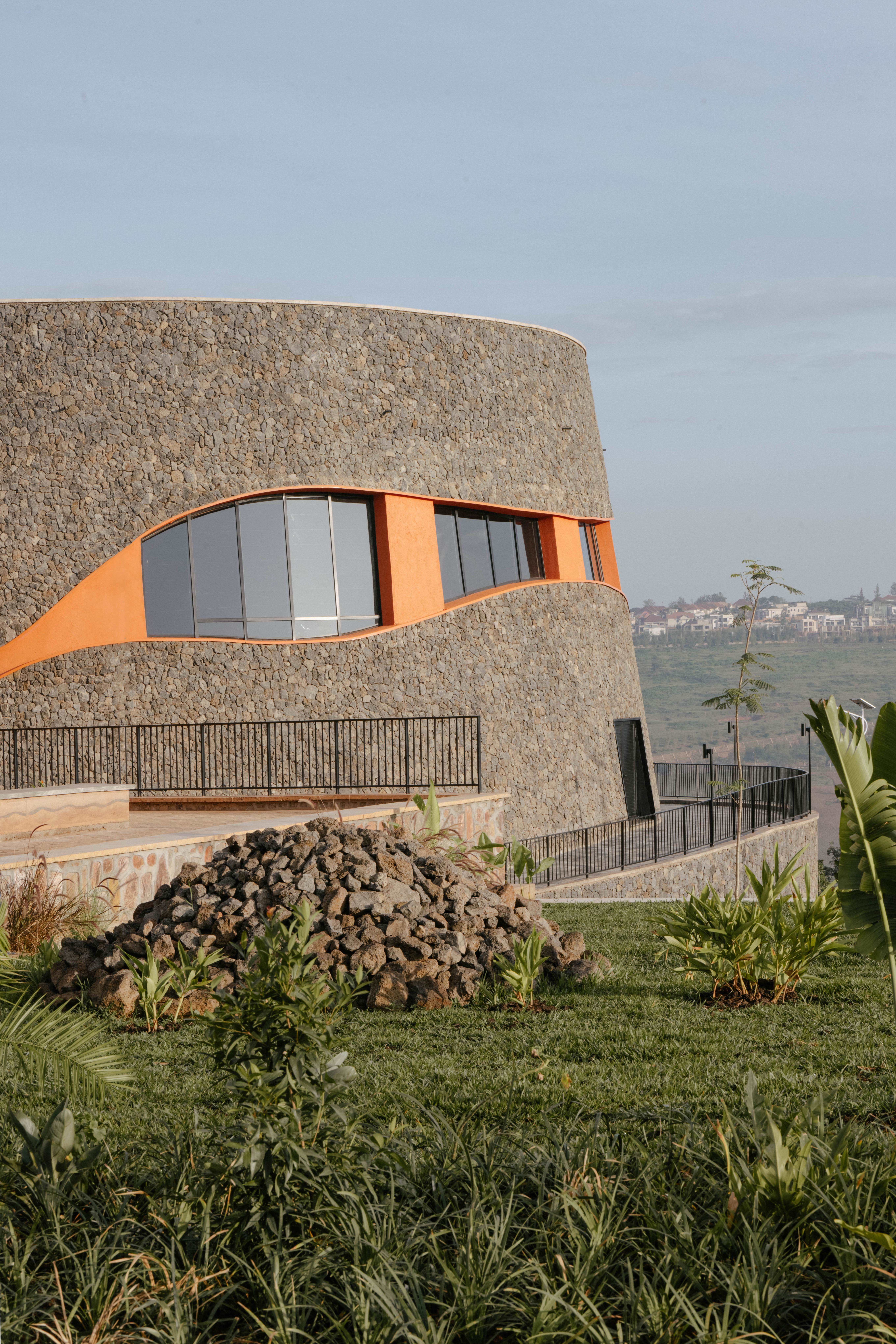 IRCAD Africa trains African surgeons to use laparoscopic surgery techniques. Rwanda, the country of a thousand hills, is the main inspiration for the shape of the building. The project is divided into three irregular prisms housing the office floors, the operating theatres, the labs, and the IT and audio-visual research areas. These prisms are connected to two "volcanoes" housing an auditorium and a cafeteria respectively. The different areas are joined together, creating a platform for interacting and sharing knowledge. The shapes of the building draw their inspiration from the natural environment of Rwanda: volcanoes, hills, earth and water. Nature is omnipresent in the design of the interior and exterior areas. Only local materials are used, paying tribute to local skills.