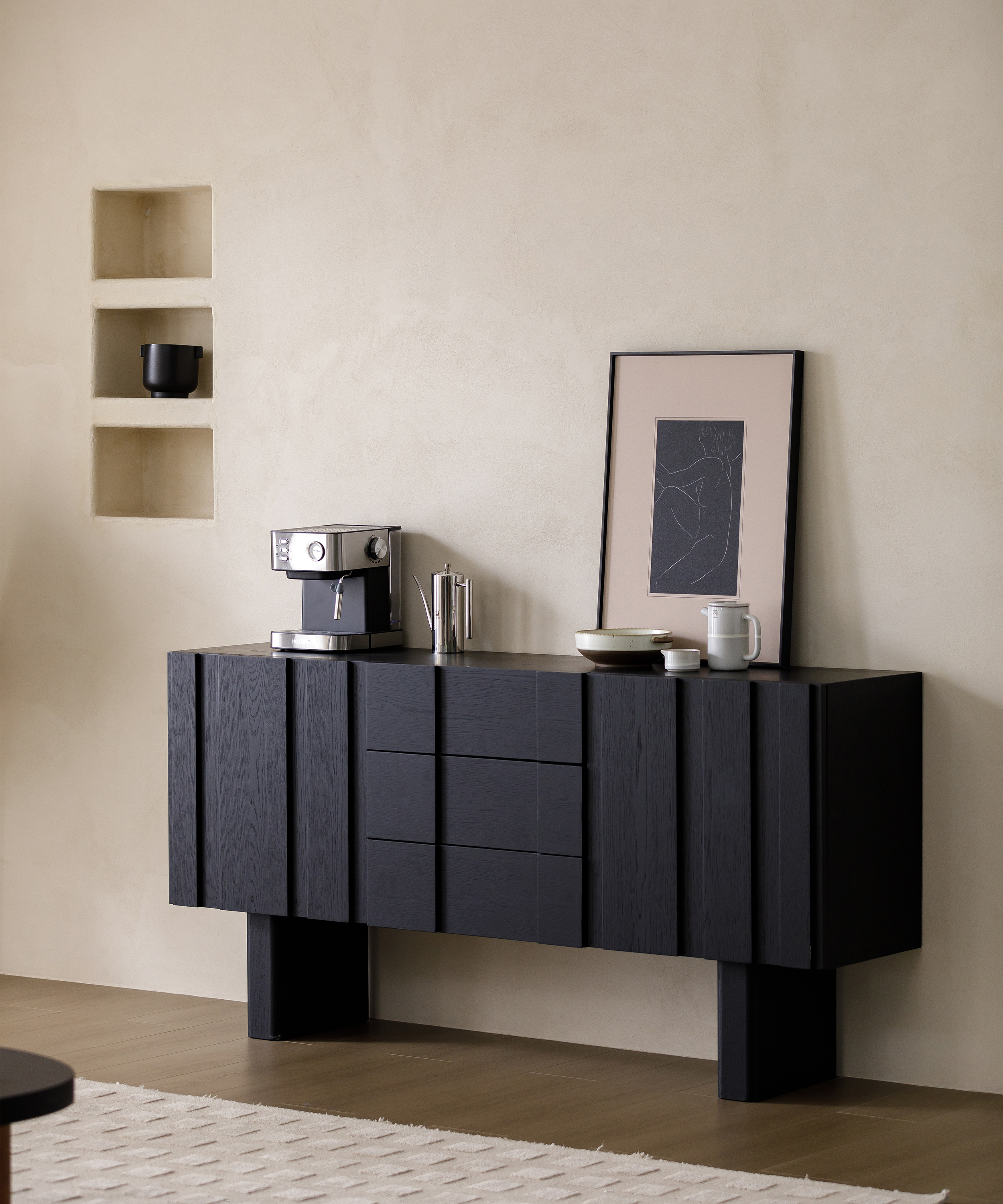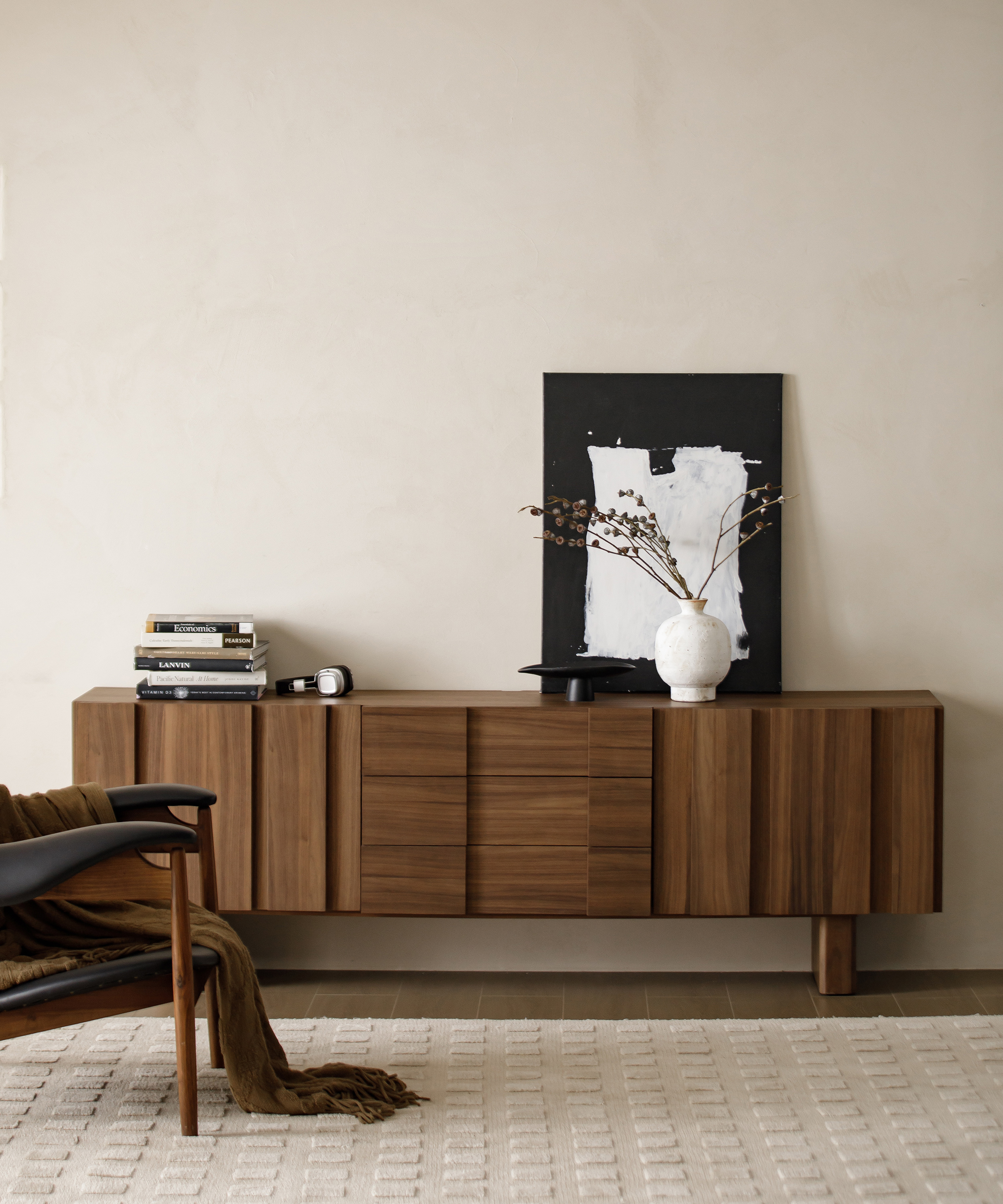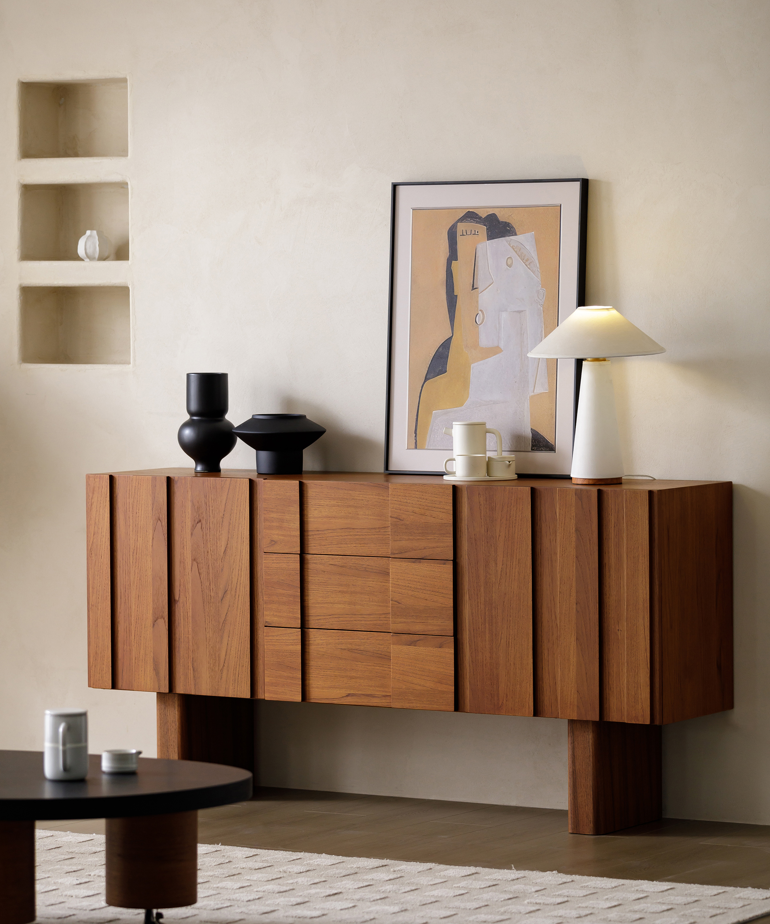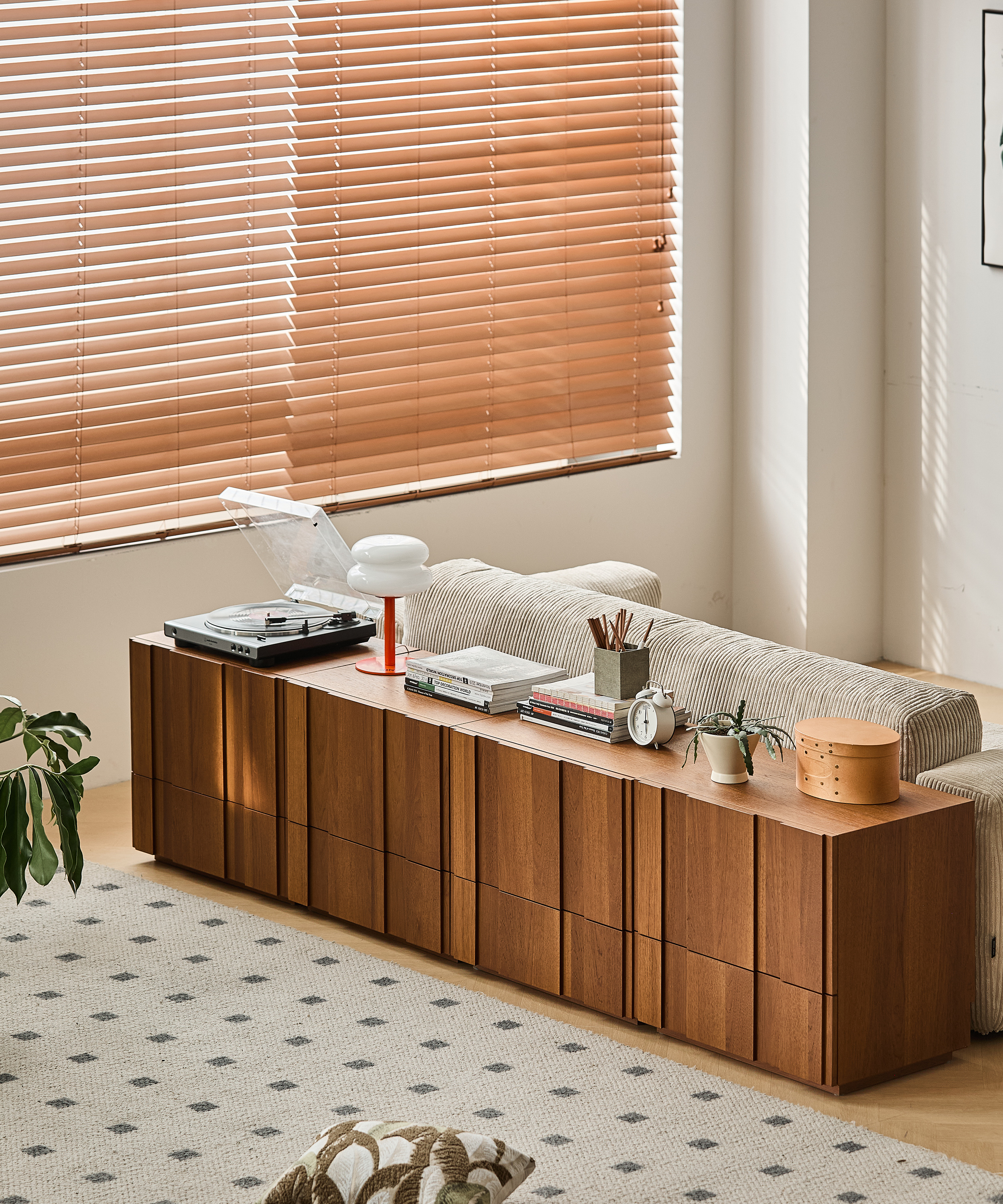 The Shanchuan Series takes inspiration from magnificent mountains and rivers. Its design cleverly employs panels with skeletal lines of varying widths to craft a cabinet frame that blends vintage charm with modern elegance. The cabinet doors feature distinctive shapes, evoking the forms of “mountains” and “rivers,” seamlessly merging the grandeur and solidity of nature into the door and giving it a unique artistic appeal. Meanwhile, it has practical functions. Its generous storage space, complemented by adjustable shelves, meets diverse storage needs while keeping living spaces organized and tidy. The series stands out for its exceptional craftsmanship and premium quality. It is crafted using a direct-to-substrate veneering process, with Grade-A Burmese teak for the mid-century toned panels and imported white oak solid veneer for the black sections, showcasing natural wood grain and a refined texture. All veneers are AAA-grade, 50 microns thick, precision-joined with advanced machinery. The seams are carefully finished with sanding and brushing to bring out the natural wood grain. Three elegant color options—teak (Burmese teak), black (FAS white oak), and walnut (FAS North American black walnut)—allow customers to choose according to their personal aesthetic. The cabinet body uses concealed connectors and lamino joinery, with 45-degree mitered edges, for a clean, three-dimensional look. The series also employs the Italian technique of edge-sealing before veneering, effectively preventing glue marks and enhancing overall quality. Meanwhile, all hidden surfaces are carefully finished with no raw wood exposed. The inner drawer frames are made of teak-colored multilayer lacquer-free solid wood panels, combining practicality and eco-friendliness.