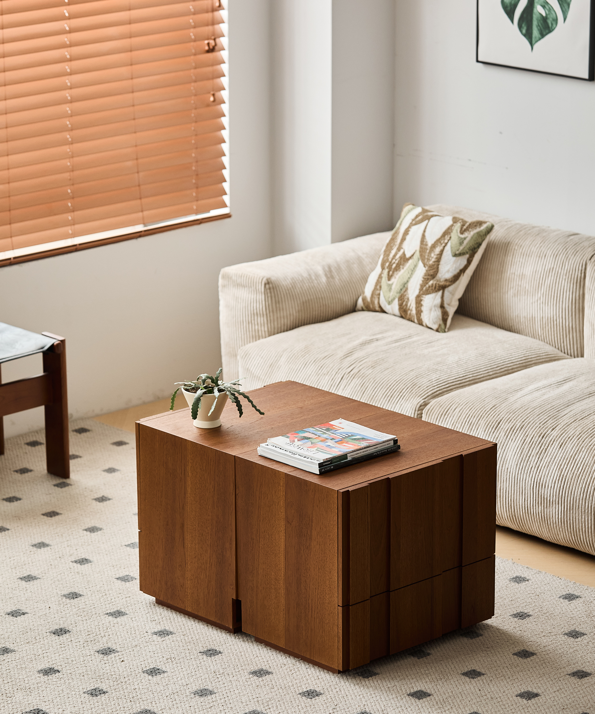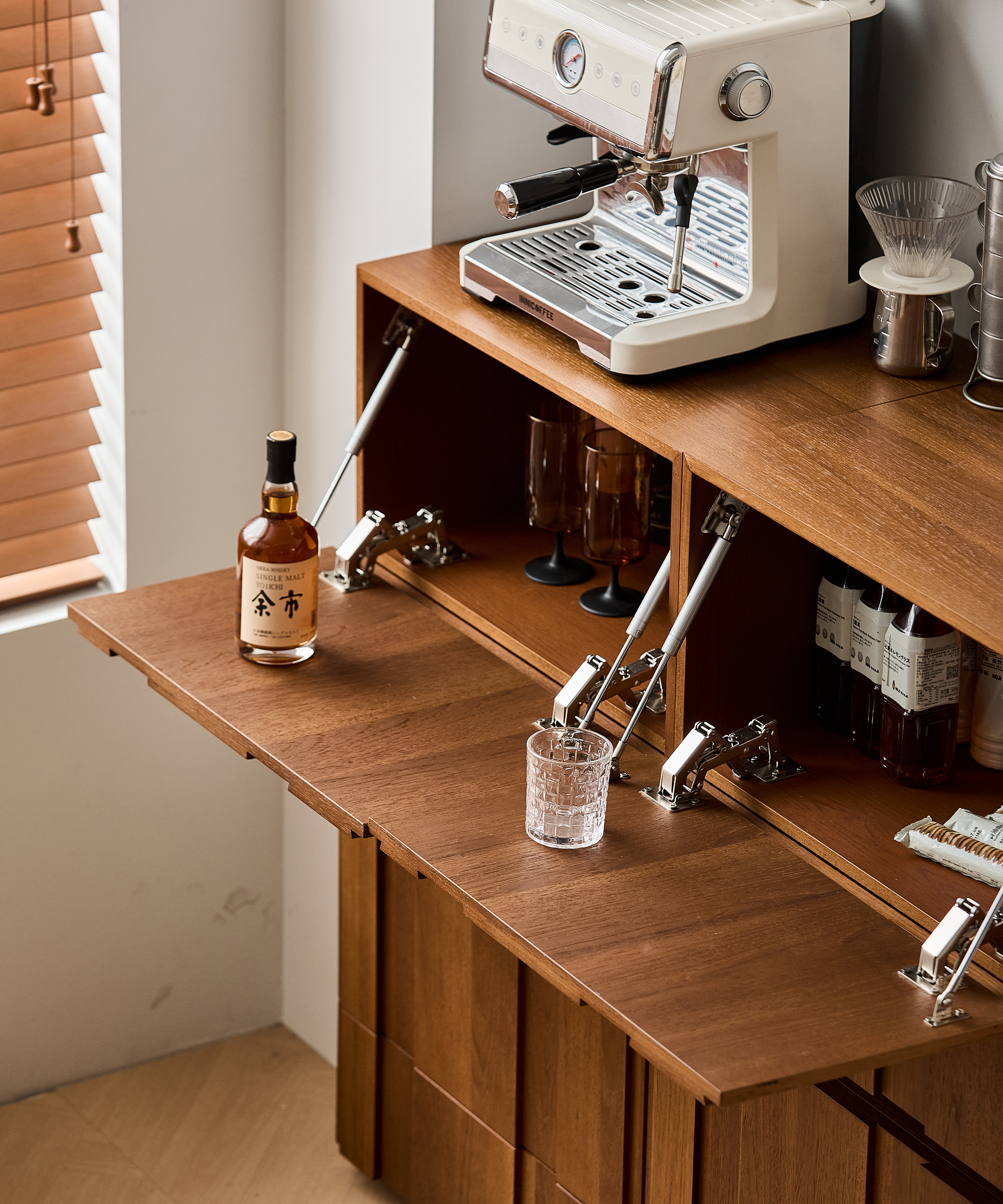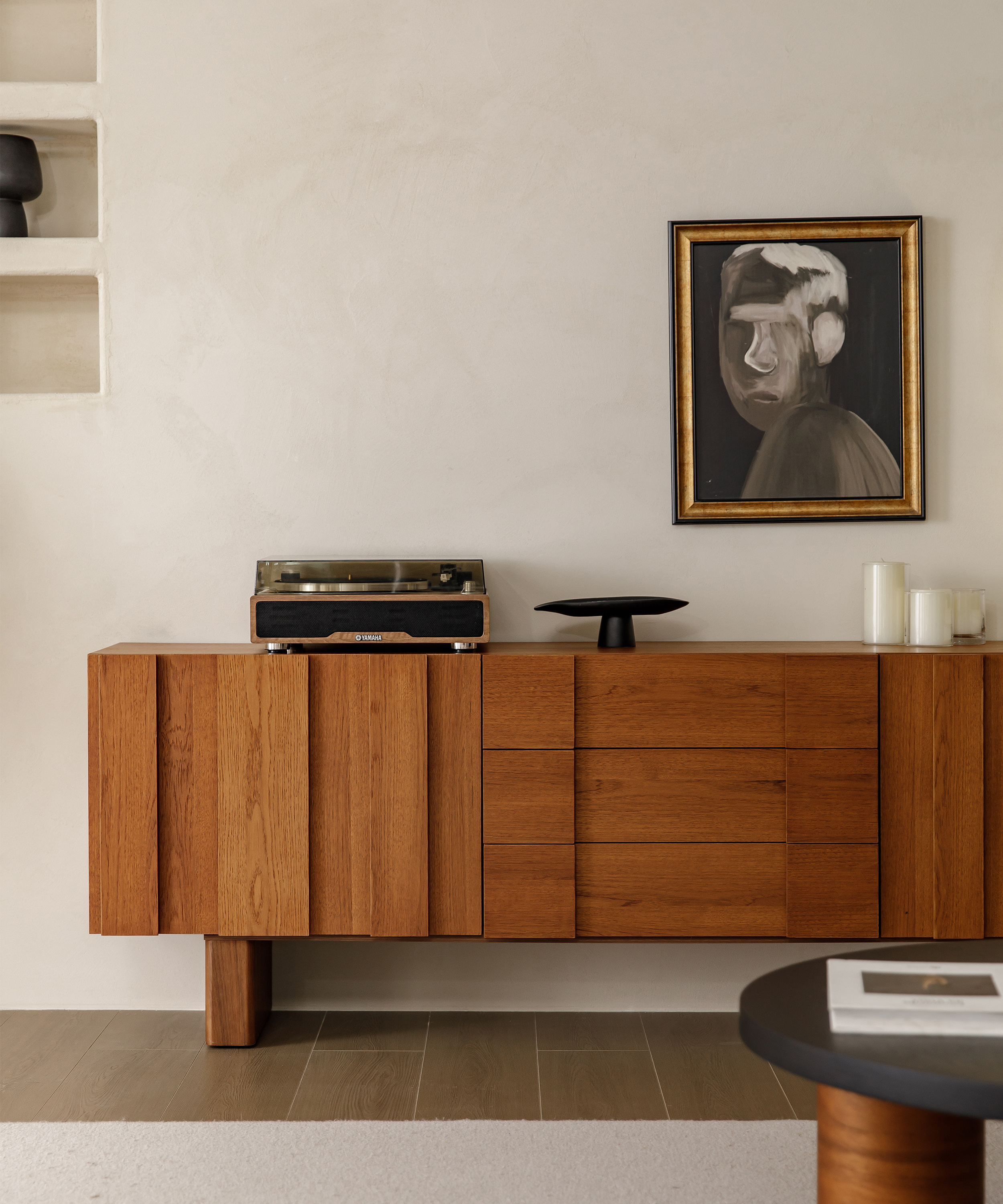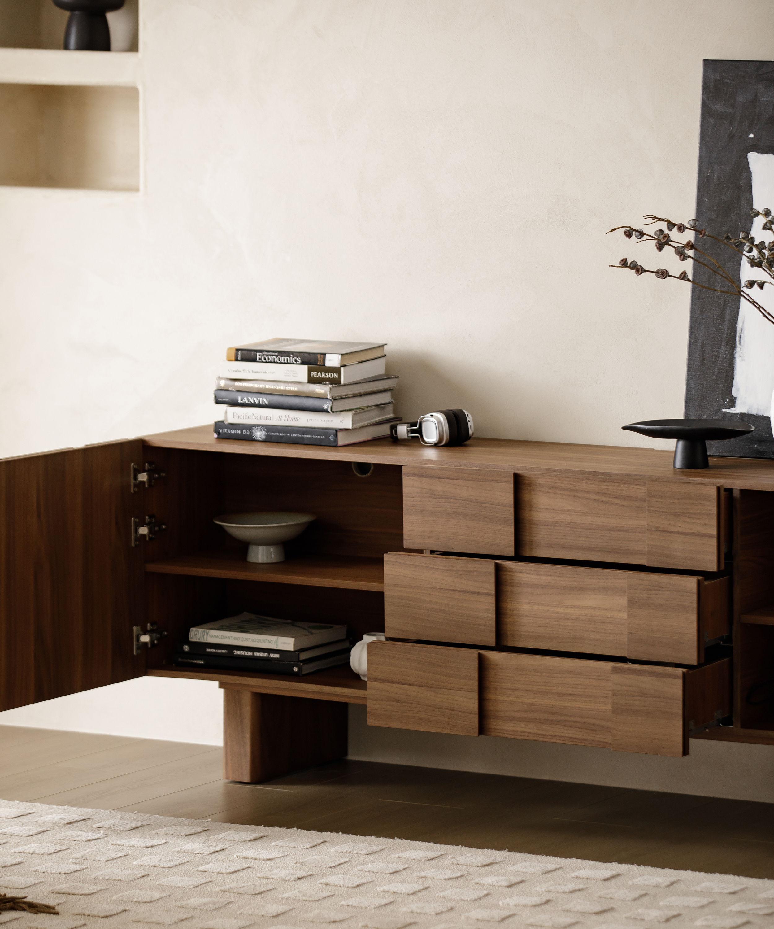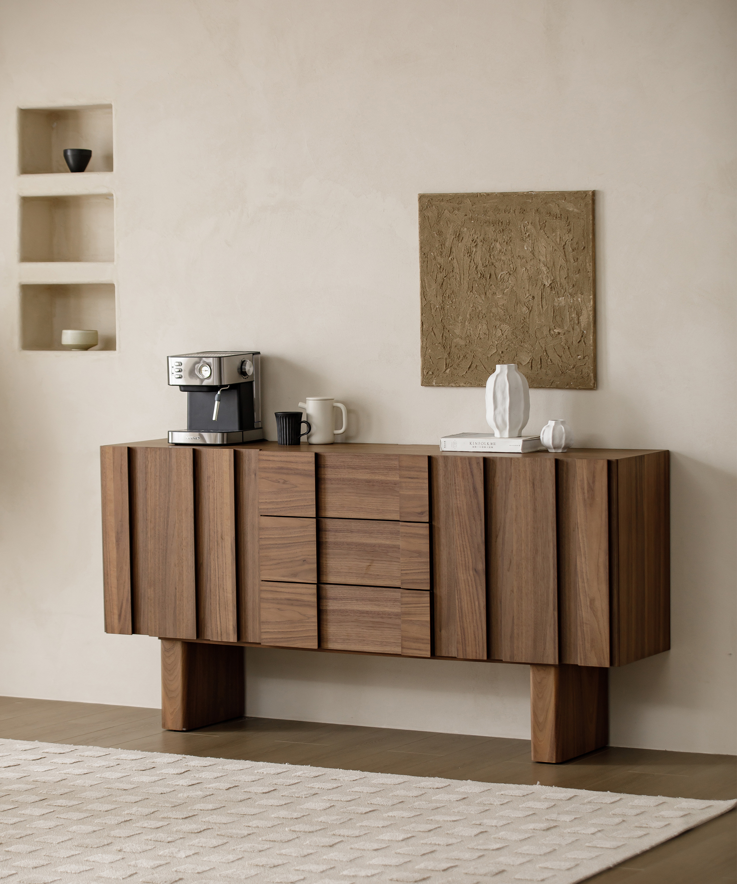 The Shanchuan Series takes inspiration from magnificent mountains and rivers. Its design cleverly employs panels with skeletal lines of varying widths to craft a cabinet frame that blends vintage charm with modern elegance. The cabinet doors feature distinctive shapes, evoking the forms of “mountains” and “rivers,” seamlessly merging the grandeur and solidity of nature into the door and giving it a unique artistic appeal. Meanwhile, it has practical functions. Its generous storage space, complemented by adjustable shelves, meets diverse storage needs while keeping living spaces organized and tidy. The series stands out for its exceptional craftsmanship and premium quality. It is crafted using a direct-to-substrate veneering process, with Grade-A Burmese teak for the mid-century toned panels and imported white oak solid veneer for the black sections, showcasing natural wood grain and a refined texture. All veneers are AAA-grade, 50 microns thick, precision-joined with advanced machinery. The seams are carefully finished with sanding and brushing to bring out the natural wood grain. Three elegant color options—teak (Burmese teak), black (FAS white oak), and walnut (FAS North American black walnut)—allow customers to choose according to their personal aesthetic. The cabinet body uses concealed connectors and lamino joinery, with 45-degree mitered edges, for a clean, three-dimensional look. The series also employs the Italian technique of edge-sealing before veneering, effectively preventing glue marks and enhancing overall quality. Meanwhile, all hidden surfaces are carefully finished with no raw wood exposed. The inner drawer frames are made of teak-colored multilayer lacquer-free solid wood panels, combining practicality and eco-friendliness.
