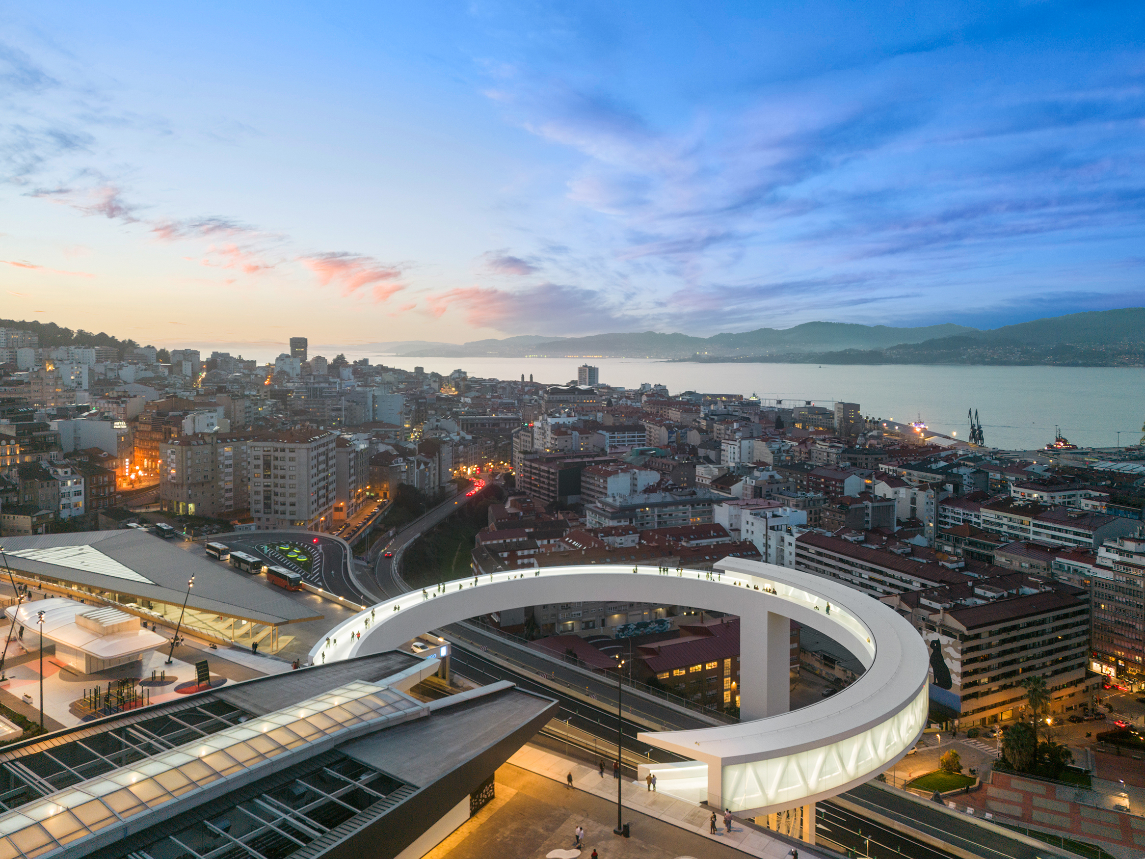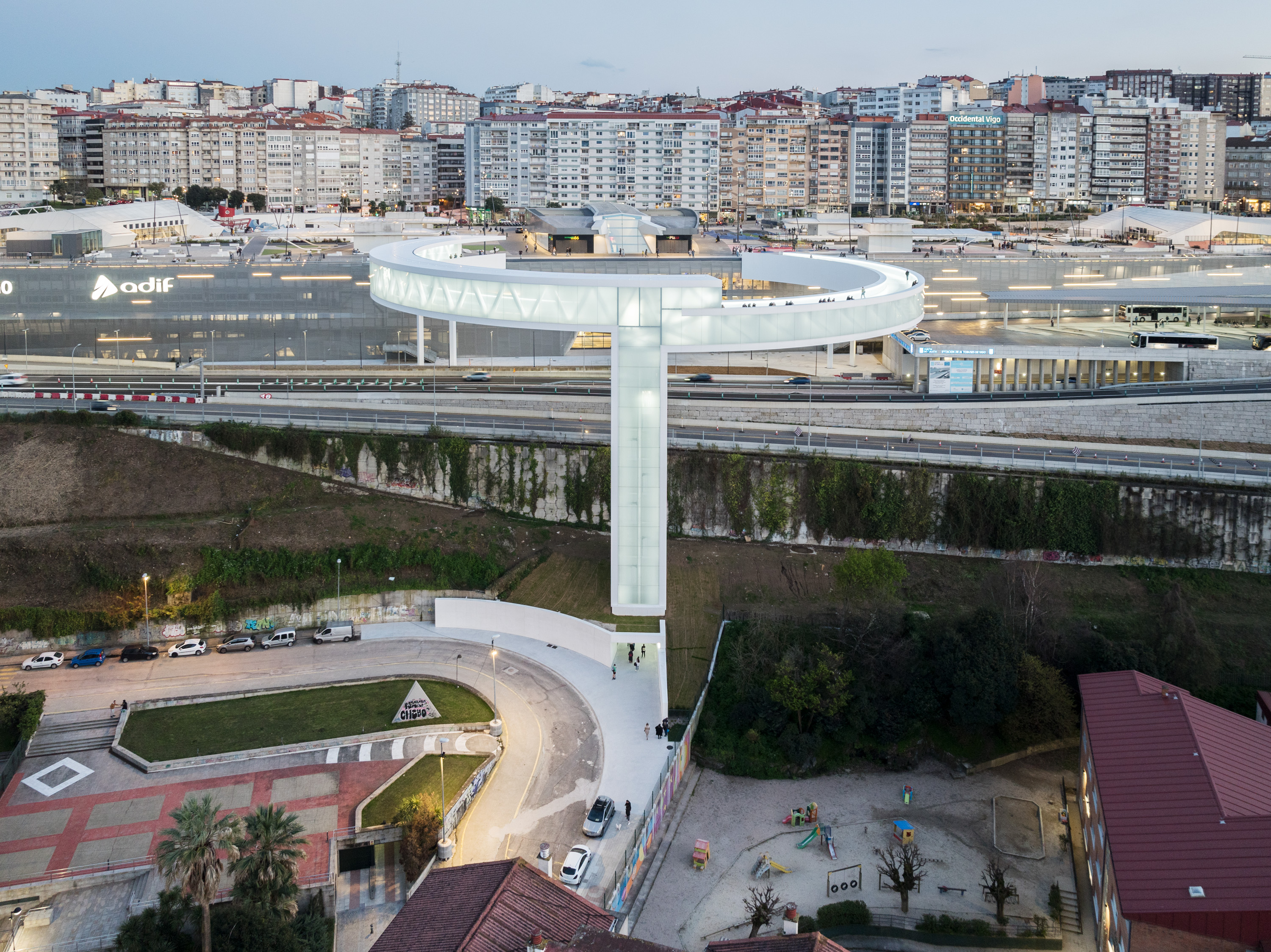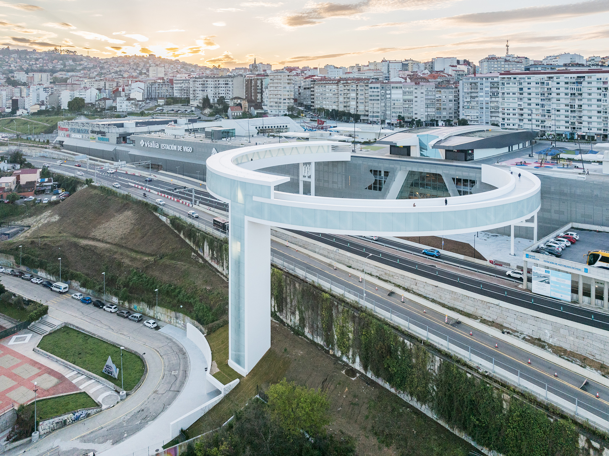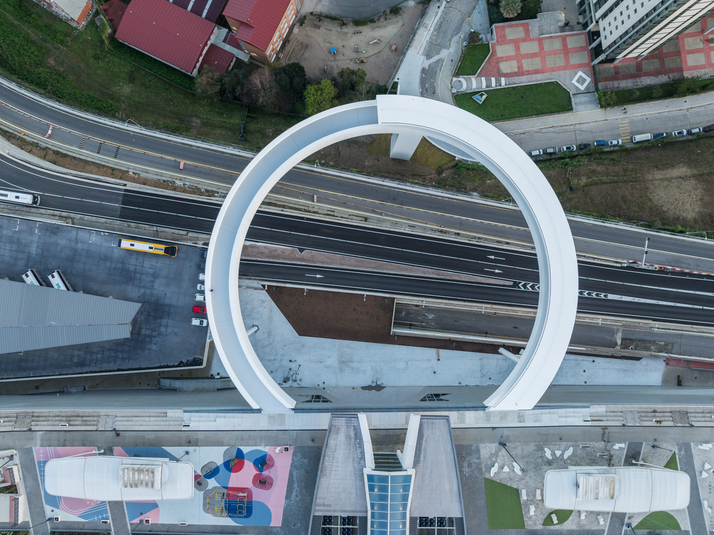HALO was born as the result of many slopes, hills and level differences of Vigo. Multiple solutions for vertical connectivity and mobility have been developed for the city as part of the Vertical Vigo connectivity programme. Halo, the largest and most ambitious of these solutions, aims to solve a vertical level difference of over 40m between the lower and upper parts of the city. The new structure will connect neighbourhoods as well as provide access to the public square located on the rooftop of the intermodal high-speed railway train, that includes bus station, car parking and a shopping mall. The footbridge crosses over the highway, the main access point to the city, over a horizontal separation above 70m in length. The main elements of the Halo structure are an elevator shaft tower and a footbridge with a diameter of 84 meters. The tower stands on the top of Serafin Avendaño Street, pointing the street's axis and attracting the attention of the citizens in the maritime port area. The tower, with approximately 6 x 6 meters, to host two elevators, each with a capacity of 17 people. At the top of the tower, pedestrian access to Thom Mayne’s intermodal station is divided into two arches, forming the ring. Each arch is supported on either side of the glass volume of the panoramic central atrium, emerging from the Morphosis building. The northern promenade is covered and protected along its entire outer face, providing comfort throughout the year. It is less transparent and less panoramic; its milky translucent glass surface ensures privacy for residences along Calle García Barbón. In contrast, the western arch is an open-air walkway offering panoramic views of the city and ocean, making it especially appealing to tourists.