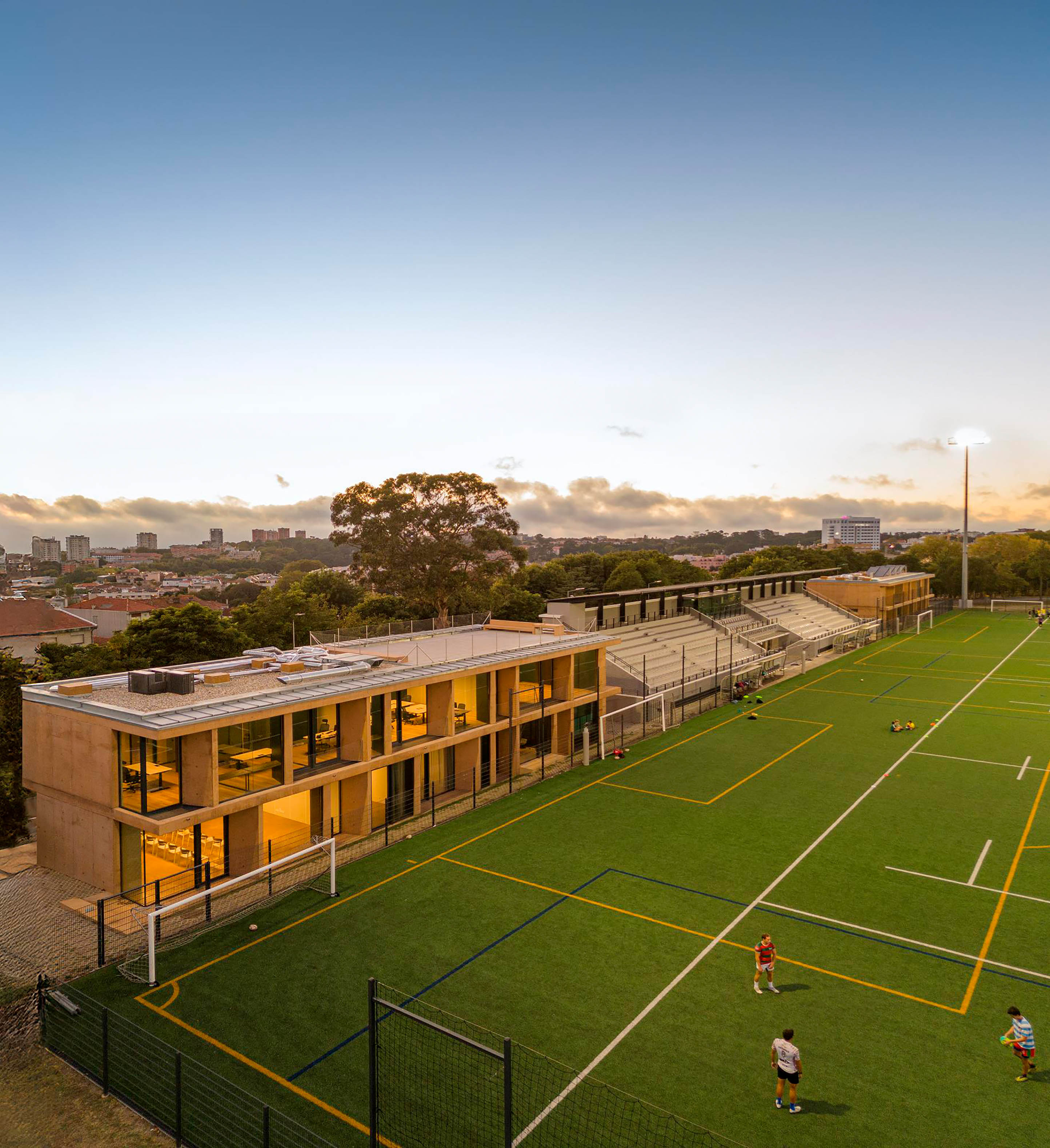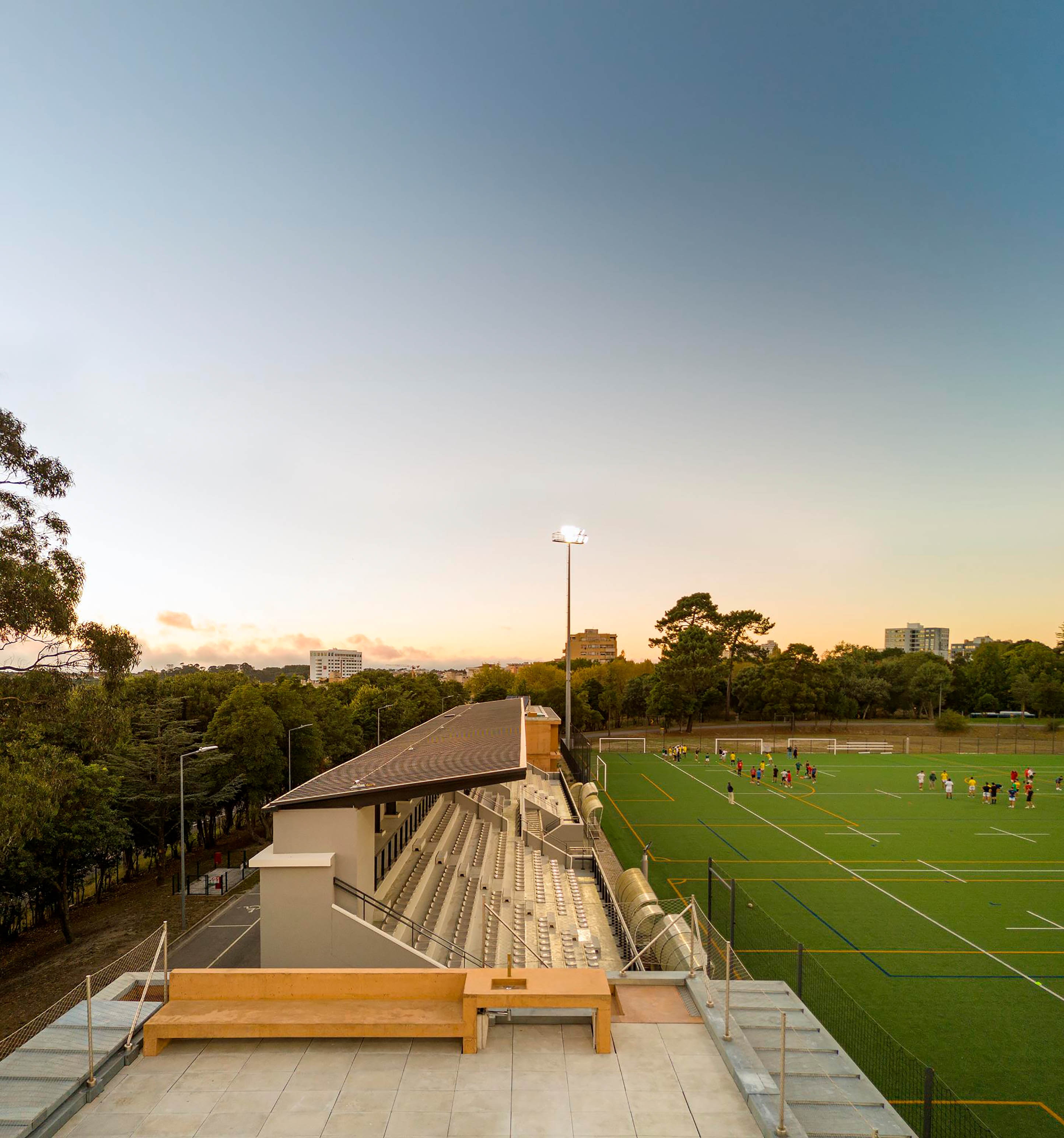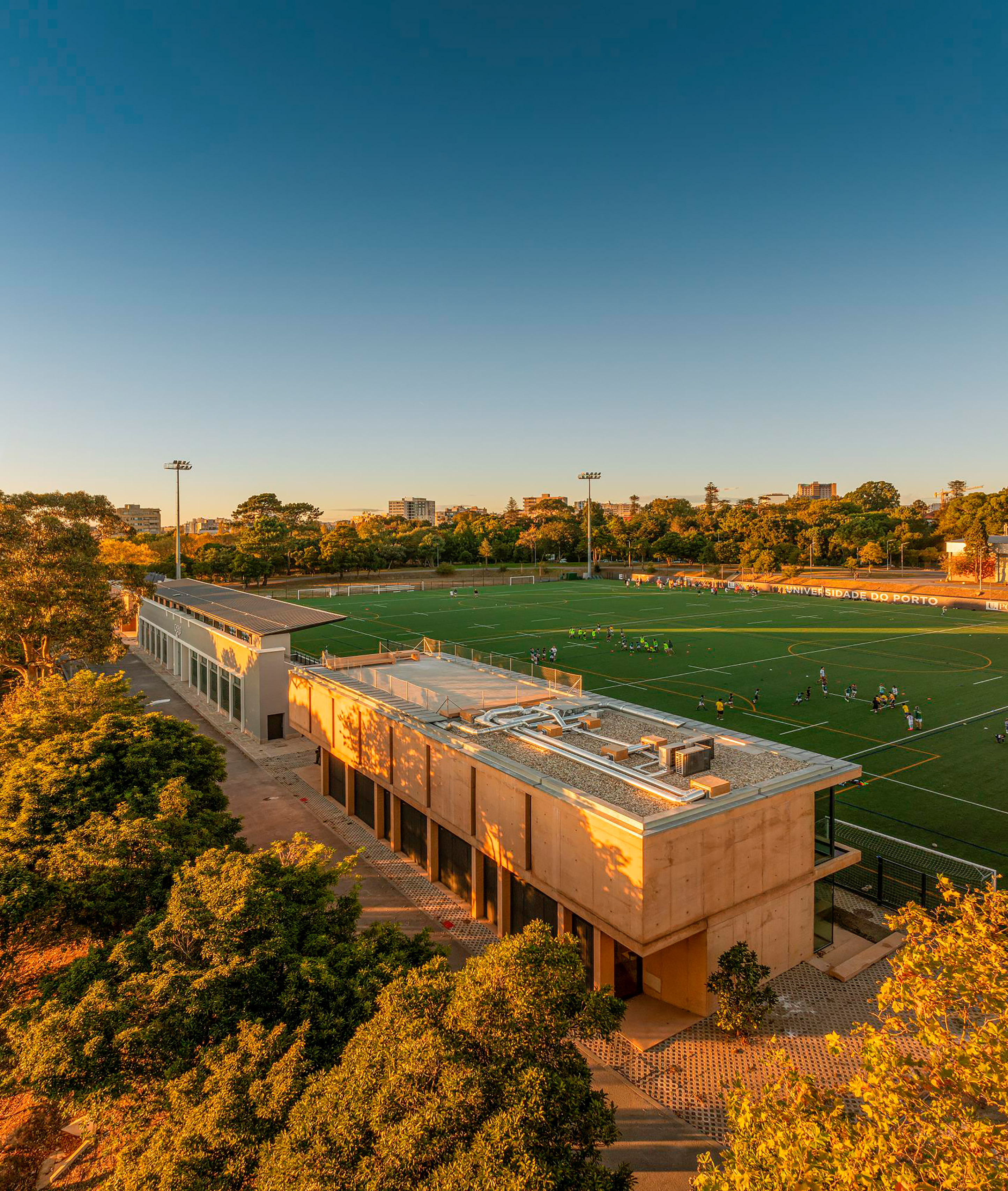 The project for the rehabilitation and extension of the grandstand and headquarters of CDUP was promoted by the University of Porto and developed by Crea, within the University Stadium context, located in the Quinta do Campo Alegre and inaugurated in 1953. We were challenged to renovate the existing grandstand building, as well as to integrate the new buildings for the CDUP, and it was this spirit of designing a cohesive whole that inspired the project. Architecture should not break with the context, but rather be relational in time. The existing grandstand, of rationalist inspiration, reflected in the composition and sobriety of the elevation to the access road, is strictly symmetrical, with a porticoed entrance marking the passage to the interior of the stadium. Granite bas-reliefs stand out, referencing classical mythology and the original games. Alongside structural refurbishment, the interior space was redesigned to include support areas for the playing fields, with access made through the central portico. Spectators enter through staircases at the top of the grandstand, while a new roof significantly increases the covered area. On the longitudinal alignment of the grandstand, two new buildings were designed to absorb the CDUP program, including headquarters, offices, meeting and social rooms, and multipurpose facilities. In attentive relation with the pre-existing volume and composition, their design resonates with the grandstand metric but reinterprets it with more fluid, dynamic movement. To the east, the buildings open generously onto the playing fields, with concrete pillars forming balconies or large planes framing the lawn. The grandstand’s austerity is echoed in the new volumes: pigmented terracotta concrete extends across façades and interiors, contrasting with the sobriety of the original structure and the surrounding treetops.