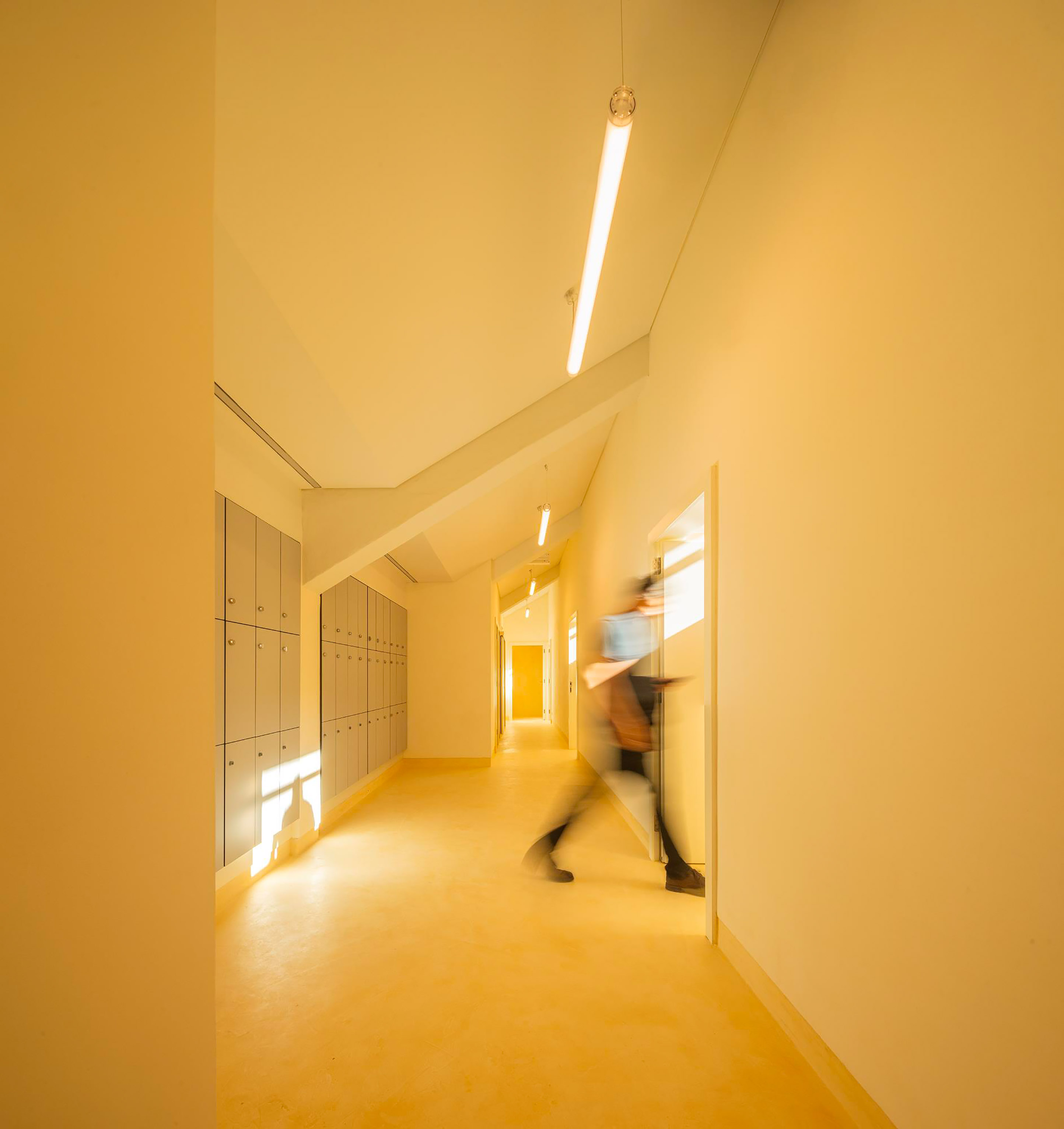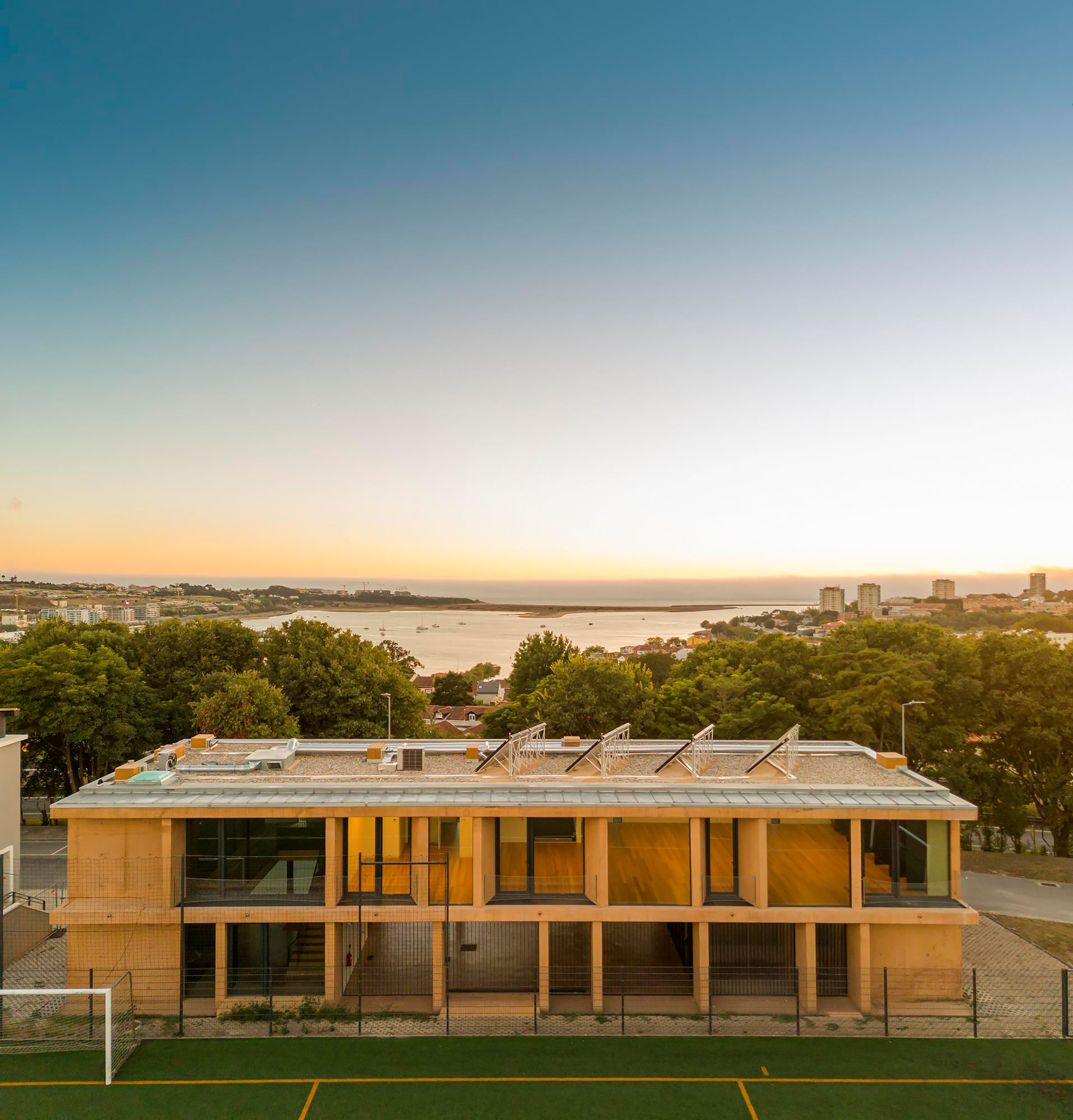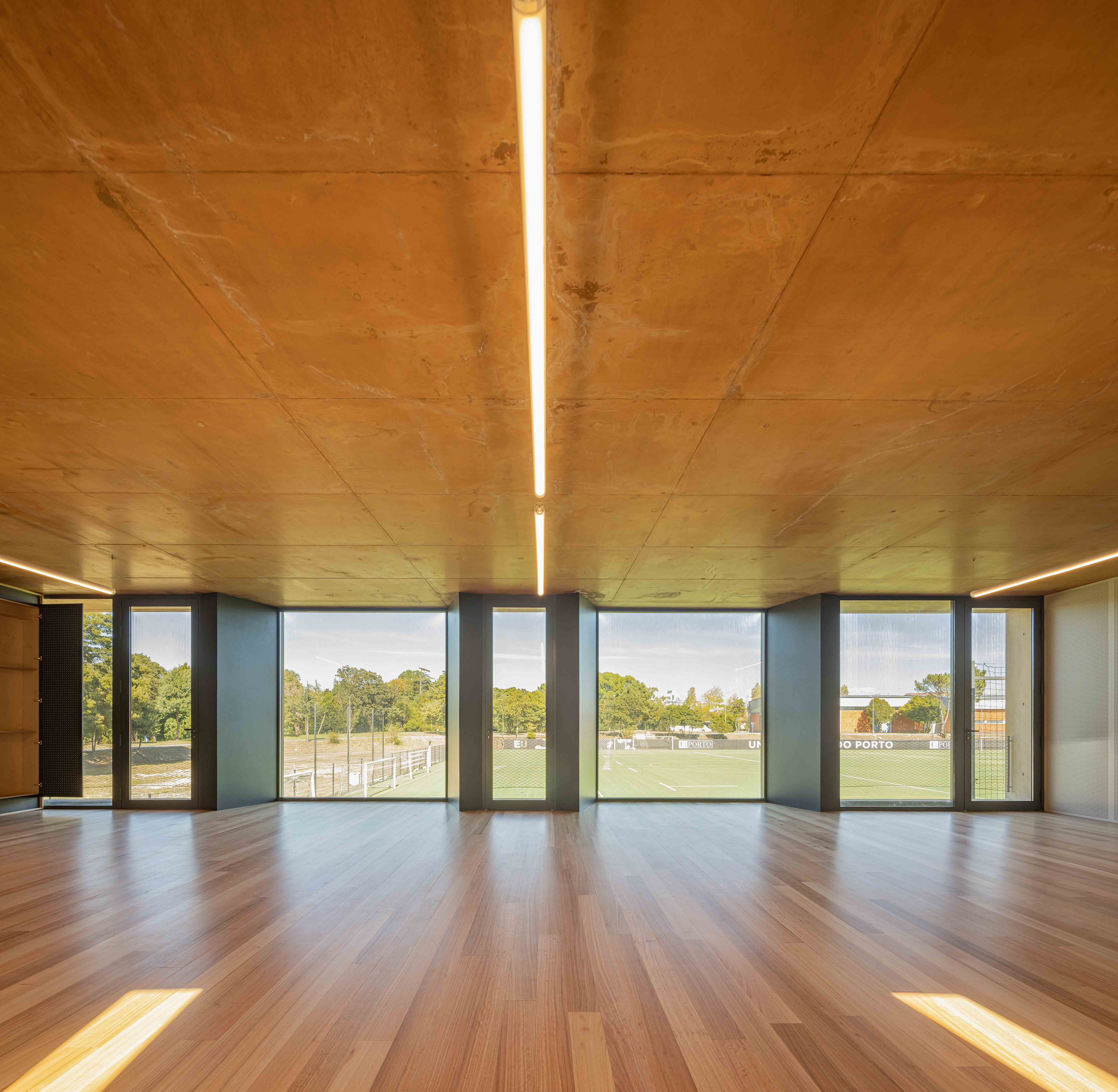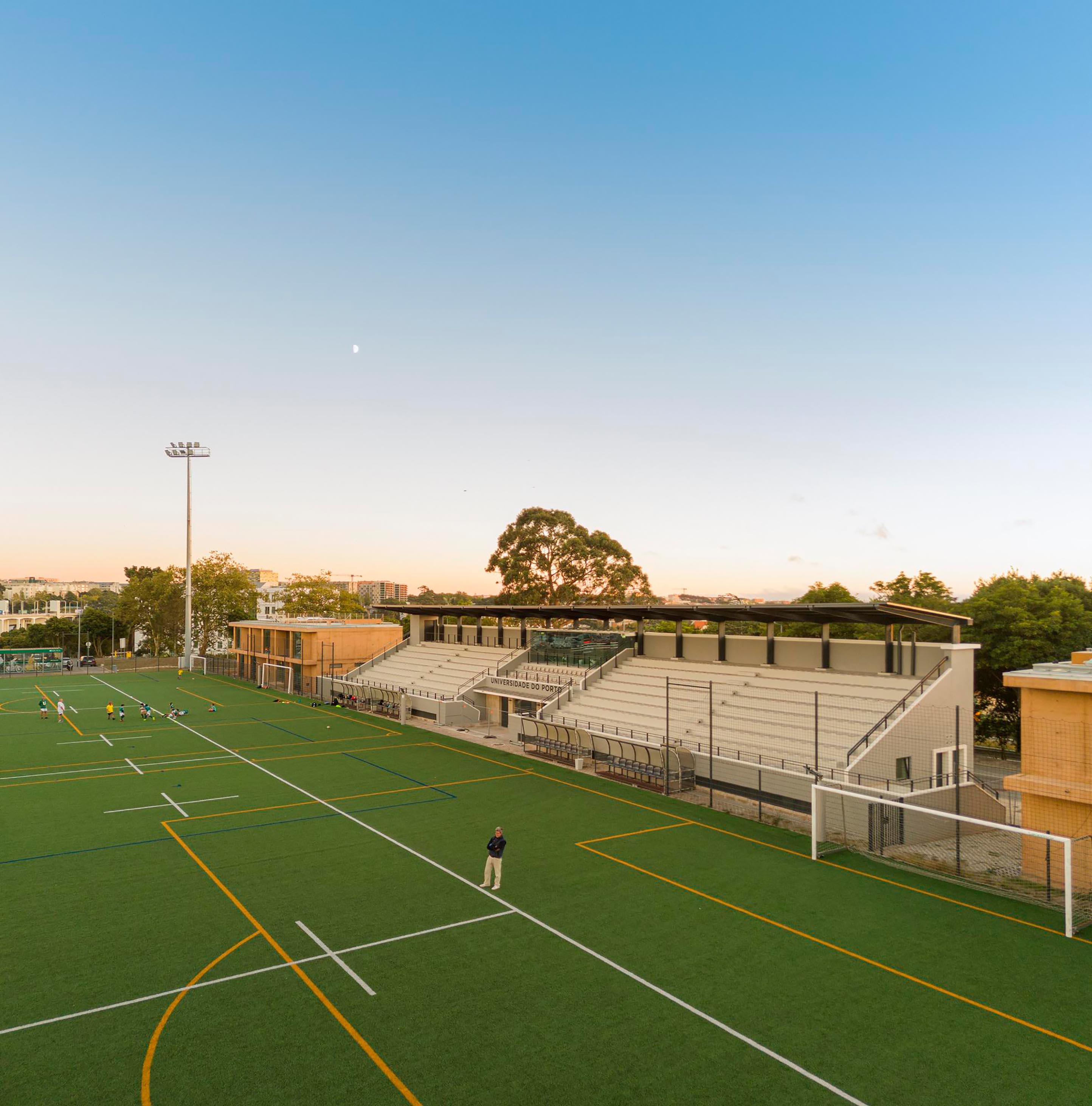 The project for the rehabilitation and extension of the grandstand and headquarters of CDUP was promoted by the University of Porto and developed by Crea, within the University Stadium context, located in the Quinta do Campo Alegre and inaugurated in 1953. We were challenged to renovate the existing grandstand building, as well as to integrate the new buildings for the CDUP, and it was this spirit of designing a cohesive whole that inspired the project. Architecture should not break with the context, but rather be relational in time. The existing grandstand, of rationalist inspiration, reflected in the composition and sobriety of the elevation to the access road, is strictly symmetrical, with a porticoed entrance marking the passage to the interior of the stadium. Granite bas-reliefs stand out, referencing classical mythology and the original games. Alongside structural refurbishment, the interior space was redesigned to include support areas for the playing fields, with access made through the central portico. Spectators enter through staircases at the top of the grandstand, while a new roof significantly increases the covered area. On the longitudinal alignment of the grandstand, two new buildings were designed to absorb the CDUP program, including headquarters, offices, meeting and social rooms, and multipurpose facilities. In attentive relation with the pre-existing volume and composition, their design resonates with the grandstand metric but reinterprets it with more fluid, dynamic movement. To the east, the buildings open generously onto the playing fields, with concrete pillars forming balconies or large planes framing the lawn. The grandstand’s austerity is echoed in the new volumes: pigmented terracotta concrete extends across façades and interiors, contrasting with the sobriety of the original structure and the surrounding treetops.
