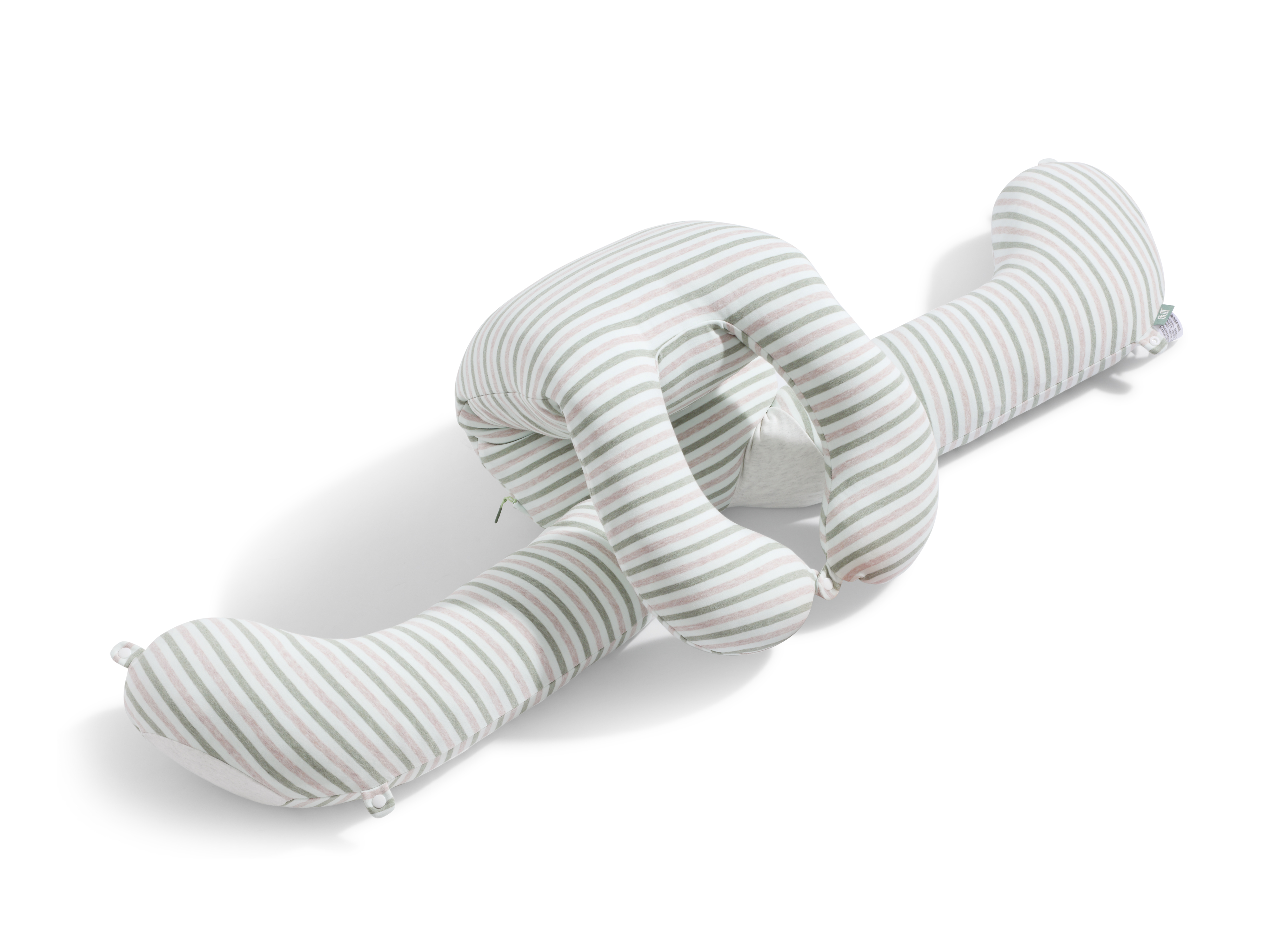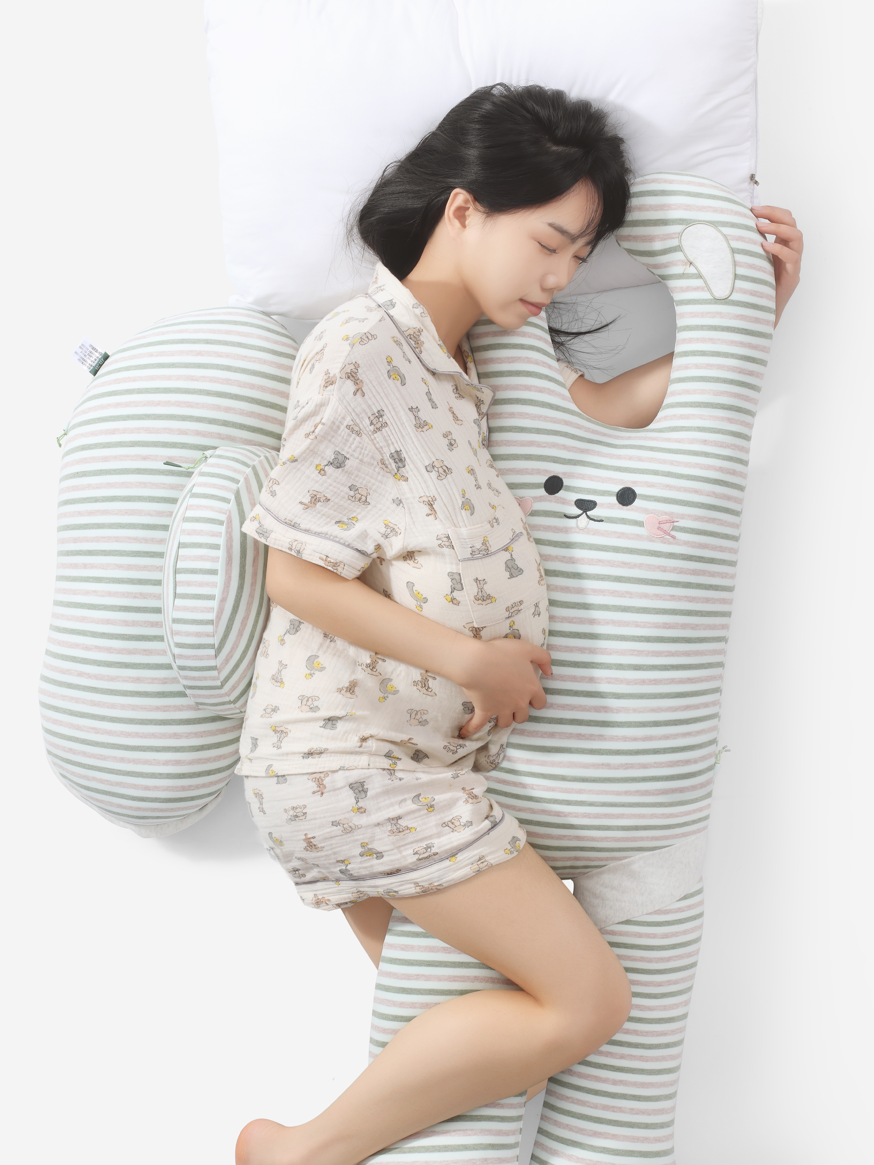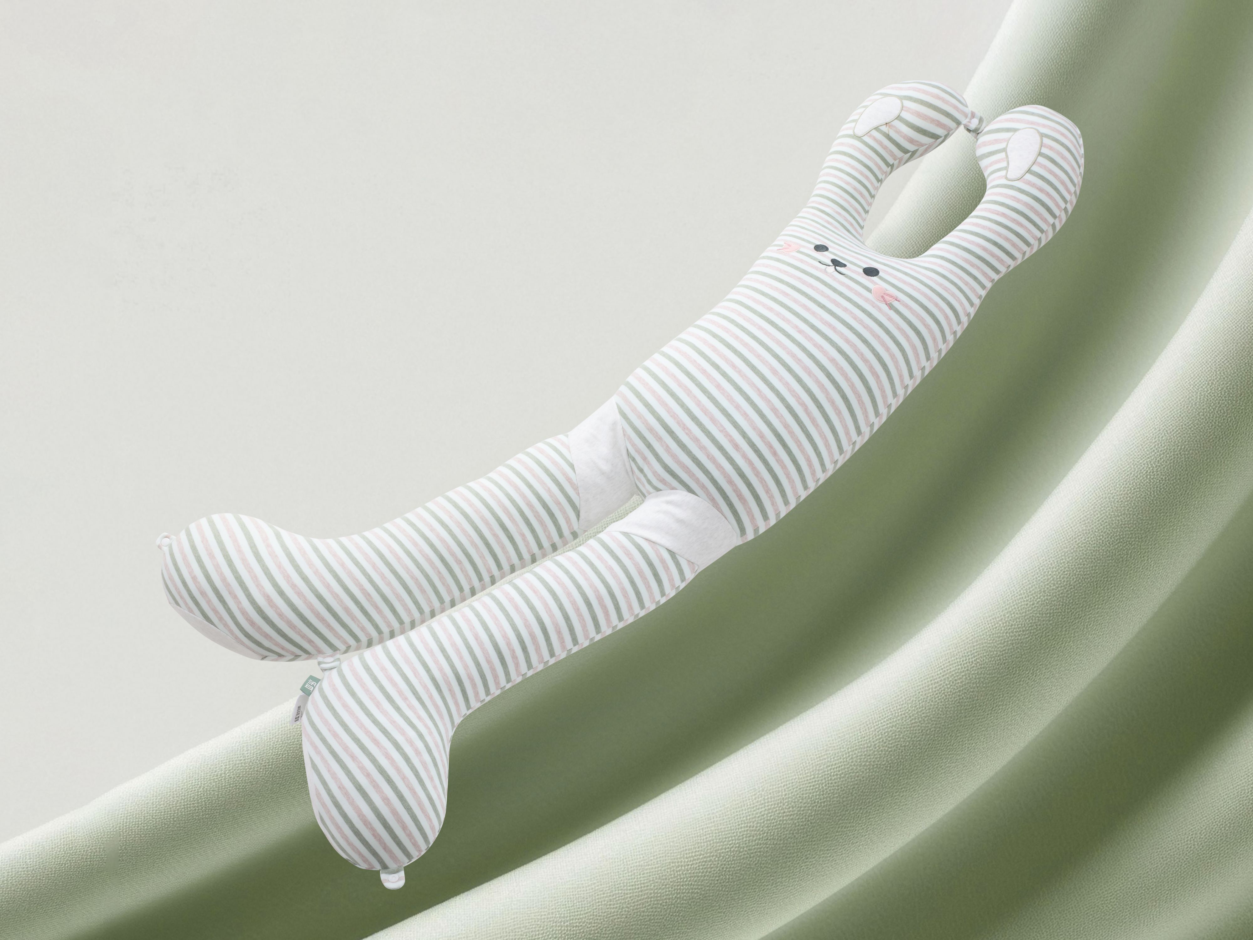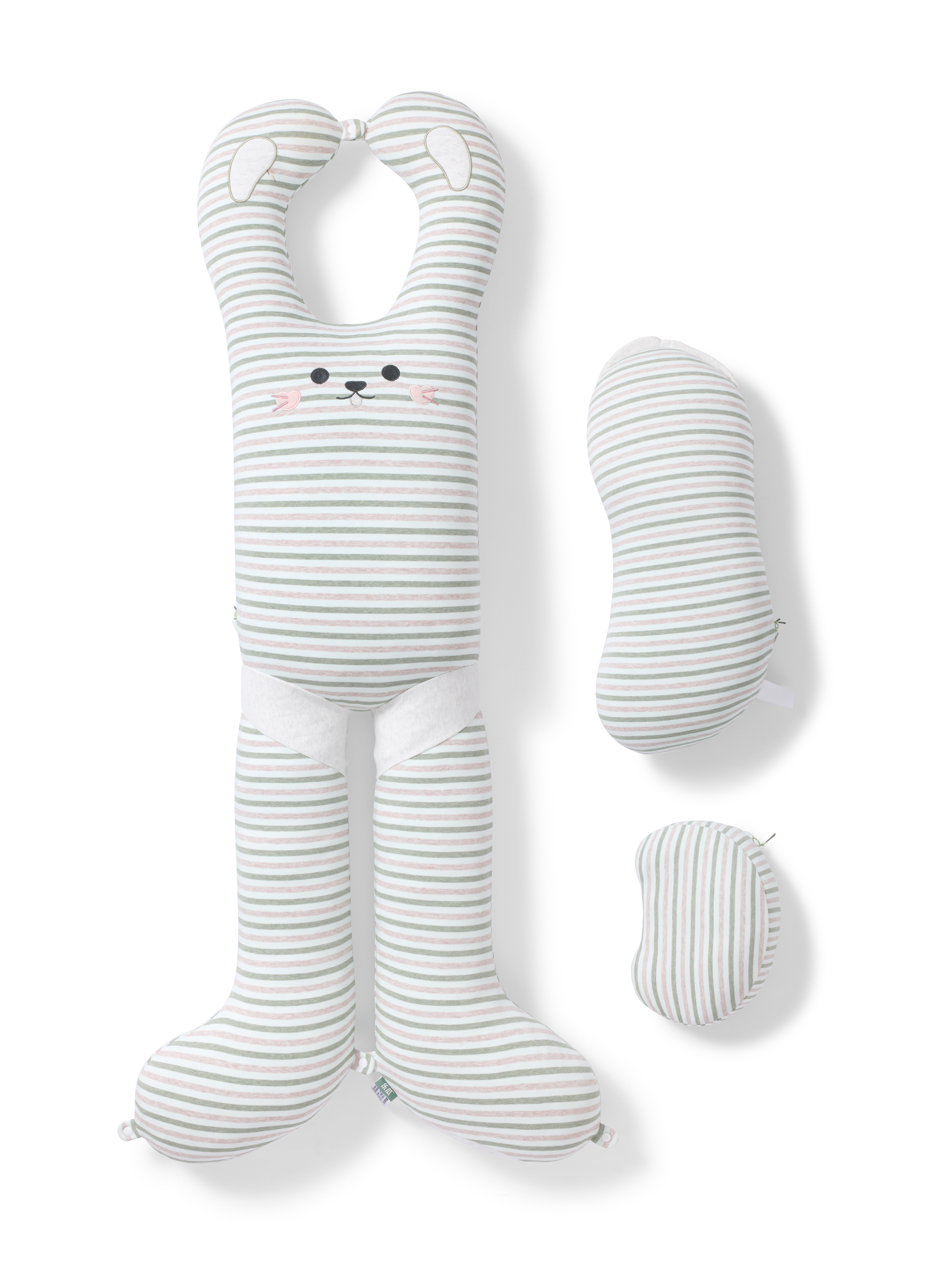 This sleeping body pillow is designed to provide comprehensive support for healthy sleep in all scenarios and sleep postures. Featuring an elongated bunny shape with snap-button connectors on the paws and feet, it can be transformed as needed, serving as a body pillow, hugging cushion, backrest, or prone-sleeping aid to promote health in various scenarios. Optional small and large support cushions offer targeted relief for specific needs, such as stabilizing the lower back for pregnant women during side-sleeping or cradling the head and neck for children resting on the stomach. The pillow also integrates three dedicated support zones: the hugging zone stabilizes shoulders to correct slouching and asymmetry; the lumbar support zone precisely follows the spine's natural curve to reduce strain and maintain proper alignment; and the knee-cradling zone fills the gap between legs during side-sleeping, promoting neutral pelvic alignment and even pressure distribution across the hips. With a scientifically contoured 25°–35° slope and an ergonomic thickness of 18–22 cm, it provides optimal support whether you sleep on your back or side. These features work together to correct sleep postures and reduce tossing and turning for healthier, more restorative sleep. Beyond physical support, the adorable bunny design also offers emotional reassurance. As for textile engineering, the Patented Triple-Elastic Fabric Fusion Technology elevates sleep health to a higher level. The pillow case uses a premium stretch cotton fabric with A-class certification—a perfect fusion of safety and skin-friendliness, especially suited for delicate skin. The smooth, elastic inner sleeve prevents shifting for close, comfortable support all night long. The core is filled with a spiral-hollow elastic knitted fabric, which is lightweight, breathable, and deformation-resistant. They create a uniquely balanced feel—both plush and supportive—dynamically adapting to your body.