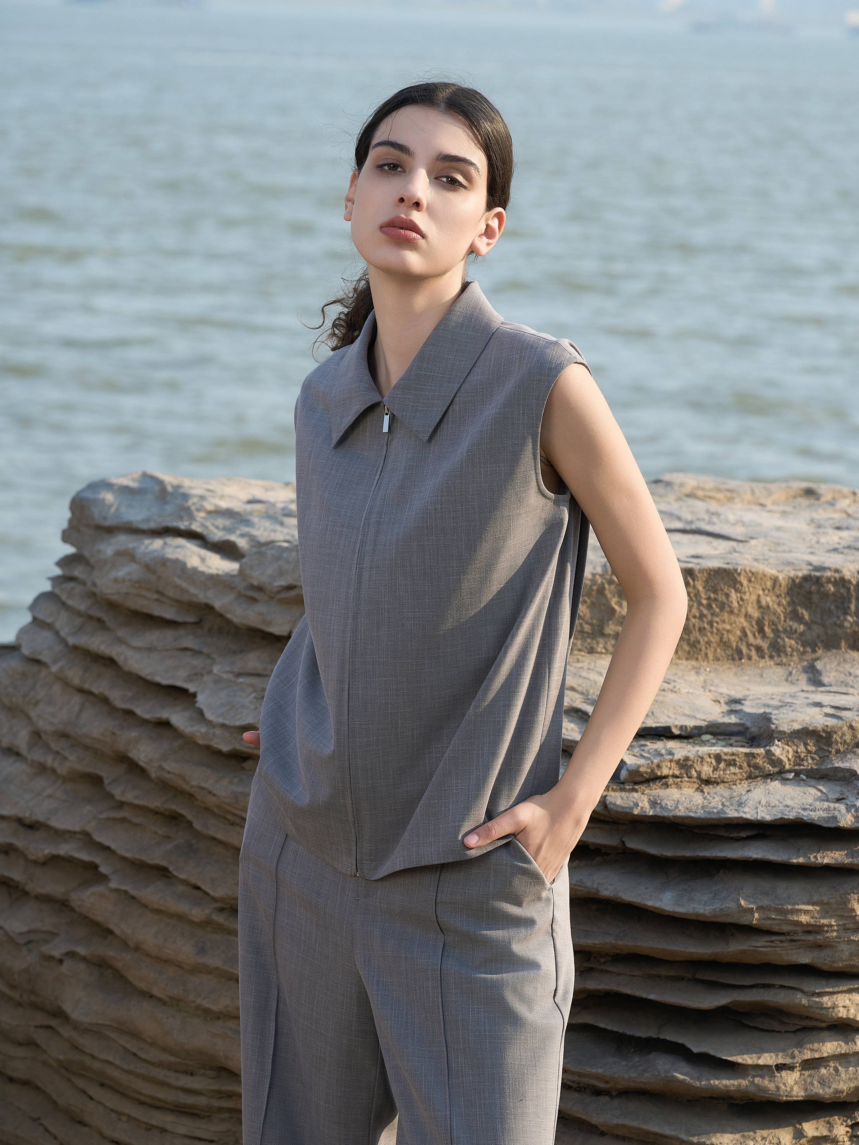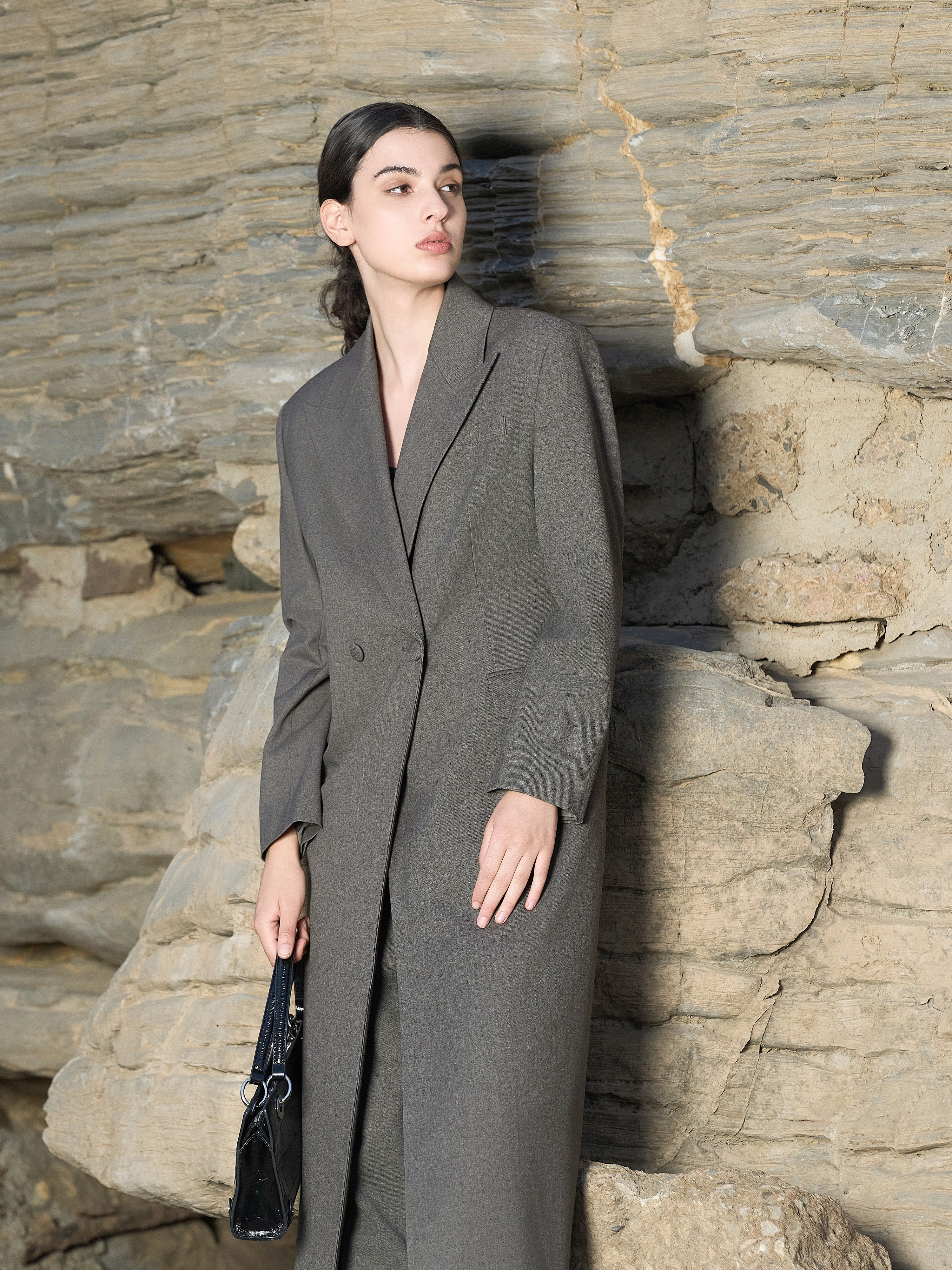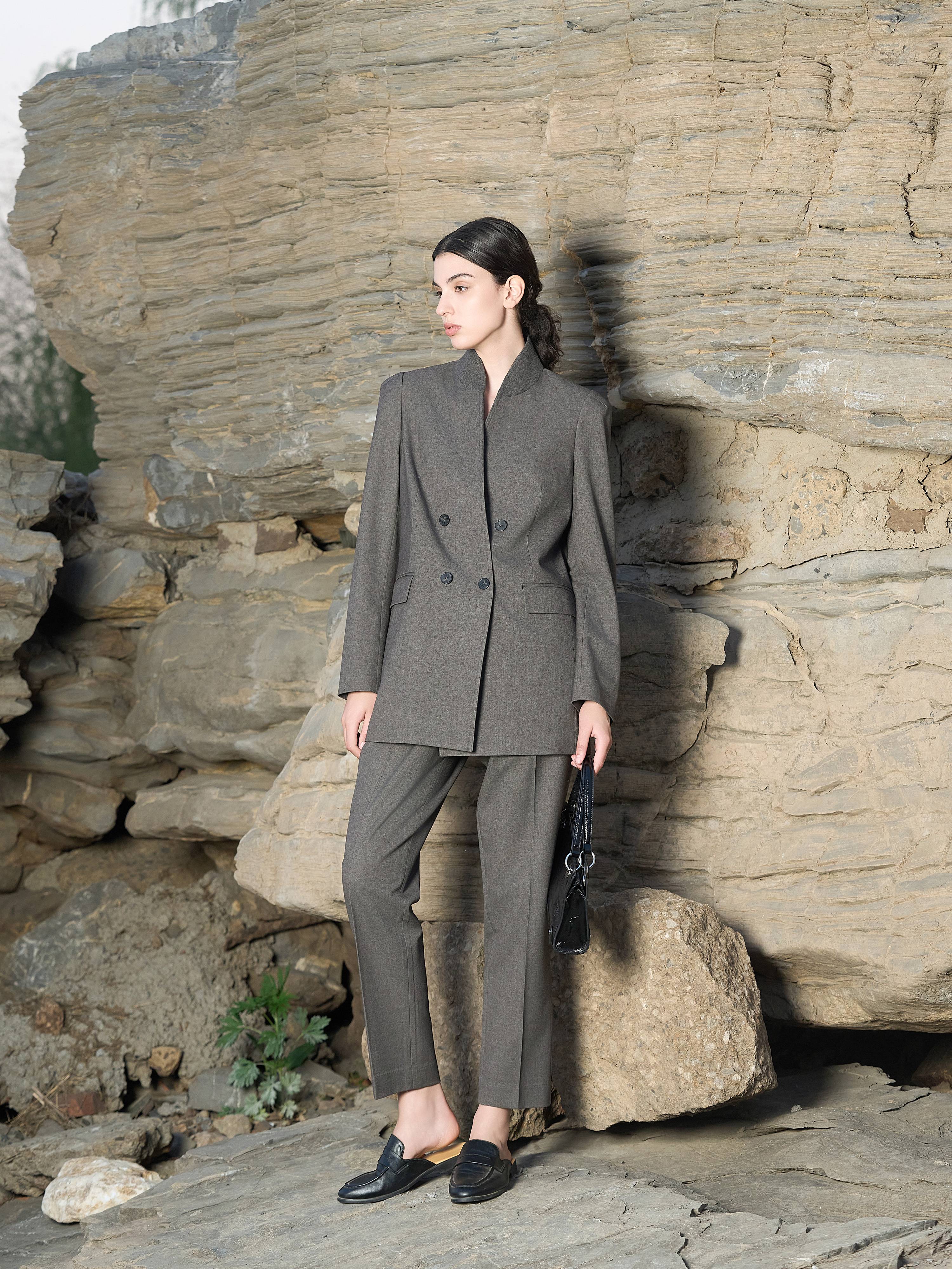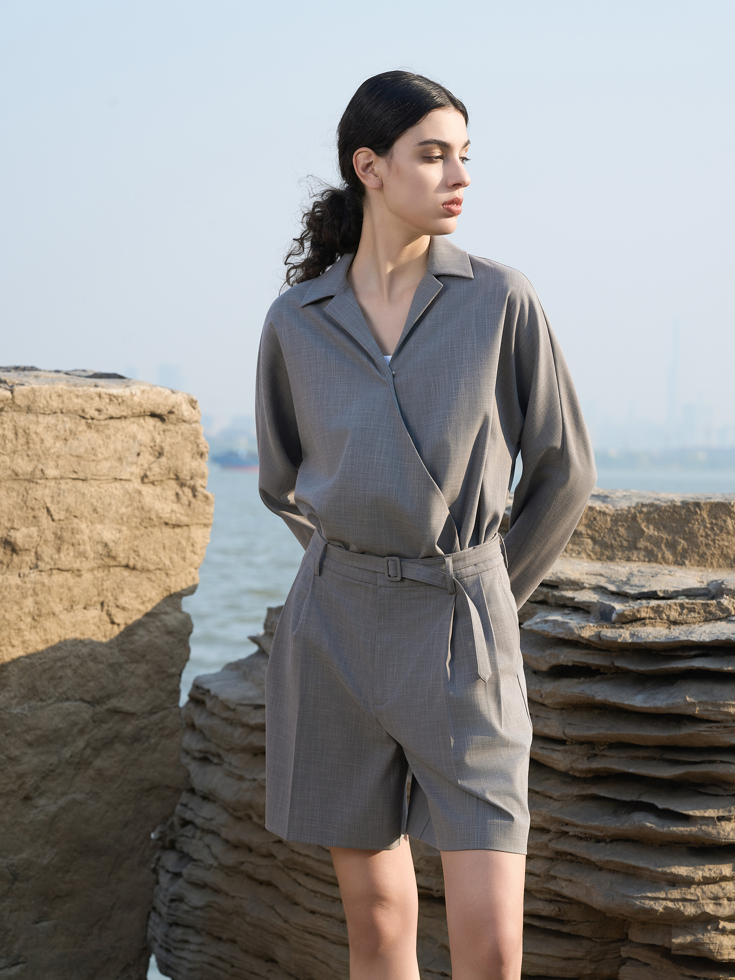Gray Tone of Gravel, tailored for modern urban woman, ingeniously marries aesthetic elegance with wearing comfort, well accommodating various scenarios from professional work to daily leisure. Drawing inspiration from gravel, the collection employs a low-saturation gray color palette, and adopts a blended fabric to replicate the delicate texture of gray; at the same time, the varying shades of gray enhance visual layering. Such a design achieves a harmonious unity of natural simplicity with modern minimalism. In terms of silhouette design, Gray Tone of Gravel is built upon classic minimalist forms like the H-shaped blazer and the high-waisted wide-leg pants, and cleverly introduces details including shoulder pleats, a napped-in waist, and a wrap collar. The resultant is a perfect balance between artistic appeal and practicality, showcasing urban women’s elegance and professionalism. As for fabric selection, the blazer and the coat incorporate wool and viscose to improve heat retention, moisture absorption, and breathability while providing a soft, skin-friendly feel; the shirt and the shorts, made from blended natural fibers, boast excellent breathability, wrinkle resistance, and elasticity, ensuring freedom of movement and wearing comfort—ideal for casual daily wear and low-intensity exercise. In addition, the collection places emphasis on environmental friendliness. For instance, the shirts and the shorts utilize 5% Tencel sourced from FSC-certified sustainable wood pulp, as well as 41% viscose produced through an eco-friendly formaldehyde-free process. These measures effectively reduce the consumption of forest resources and minimize chemical pollution, reflecting the brand’s firm commitment to sustainable manufacturing.